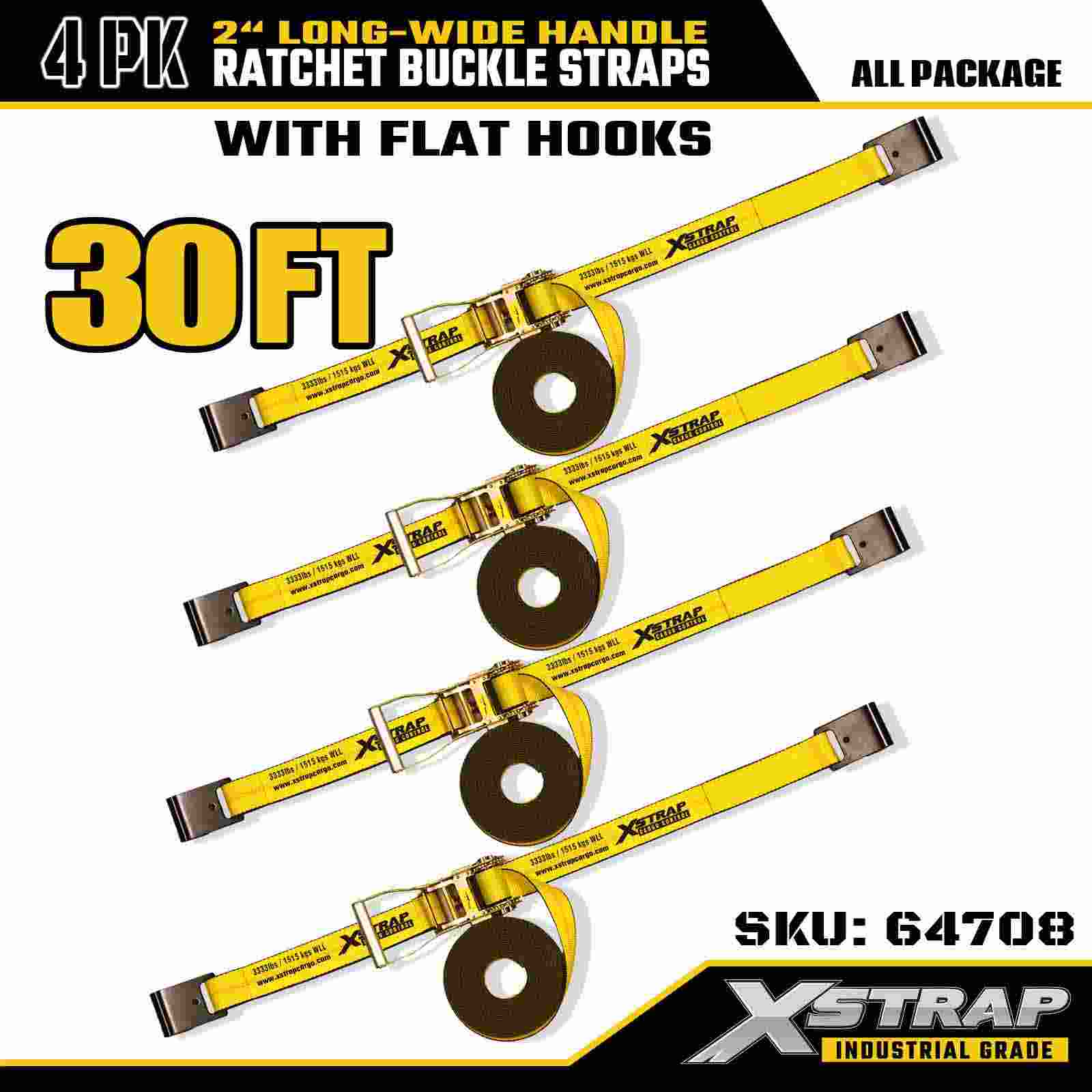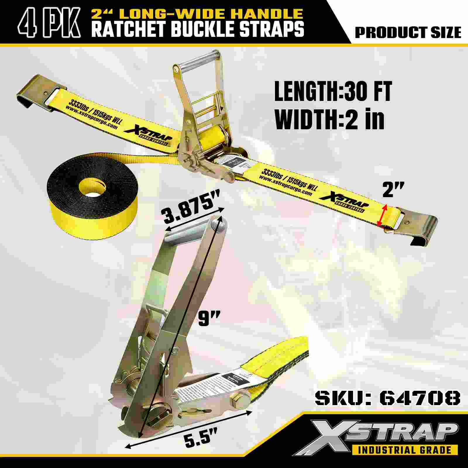 Xstrap 64708 Trake s kopčom s produženom ručkom od 2" x 30 stopa (paket od 4 komada) – ravne kuke, nazivna čvrstoća 10 000 lbs, rješenje za kontrolu industrijskog tereta