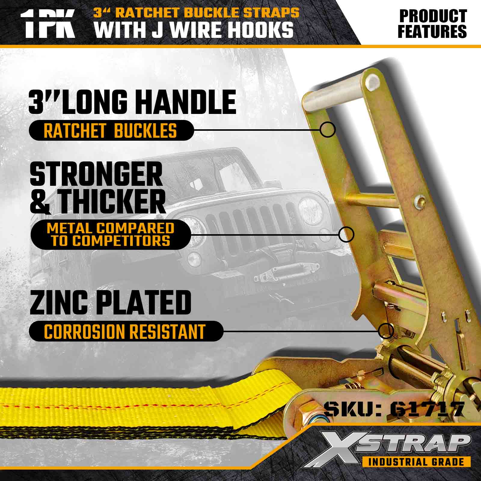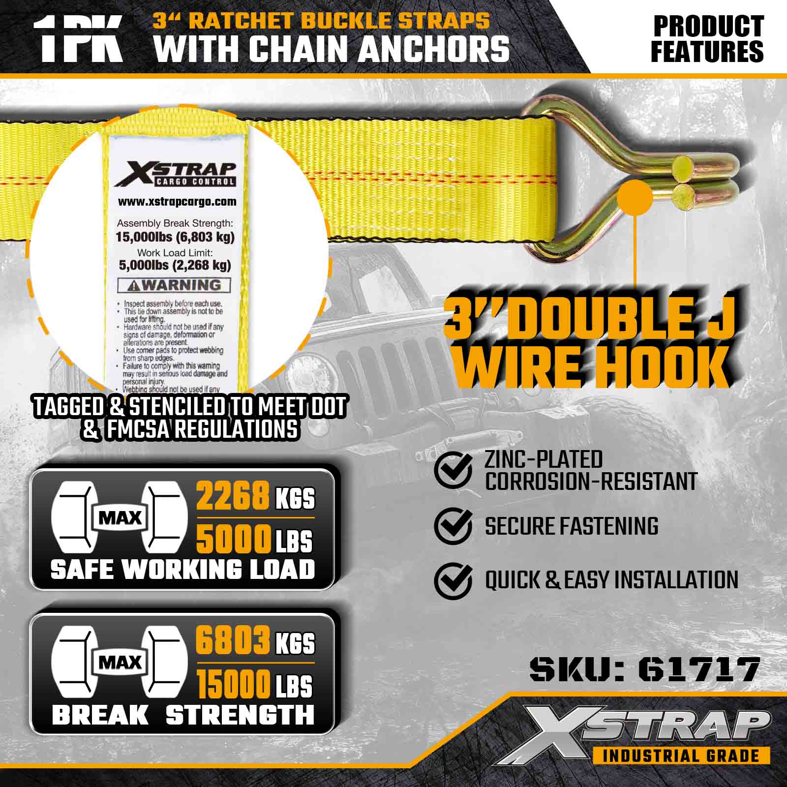 - Izrađen za profesionalne standarde prijevoza: Ocijenjena prekidna čvrstoća od 15 000 lbs i WLL od 5 000 lbs, ova traka udovoljava zahtjevima voznih parkova kamiona, izvođača radova i operacija teškog prijevoza.