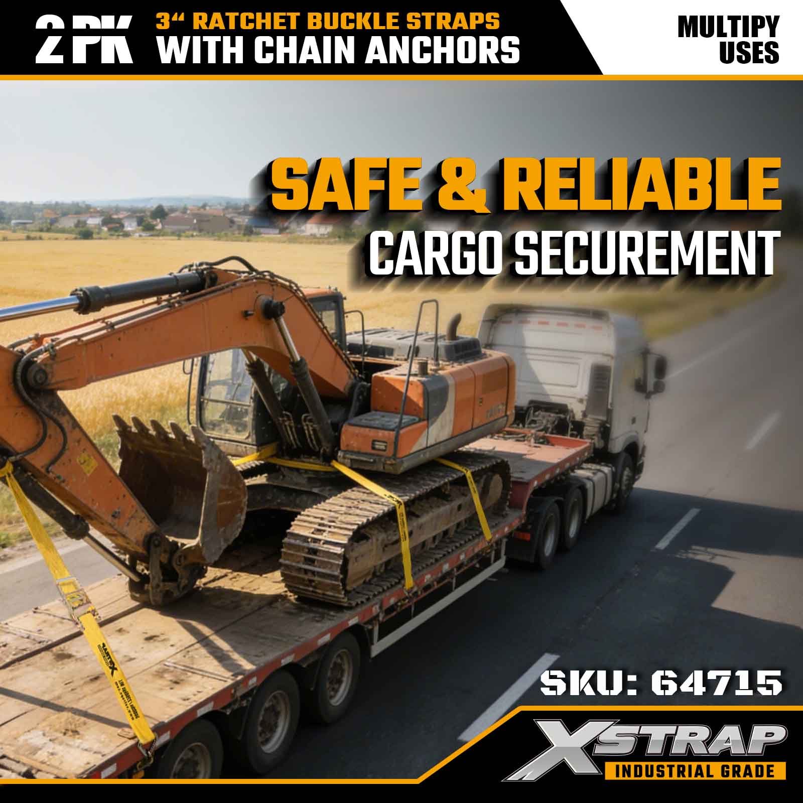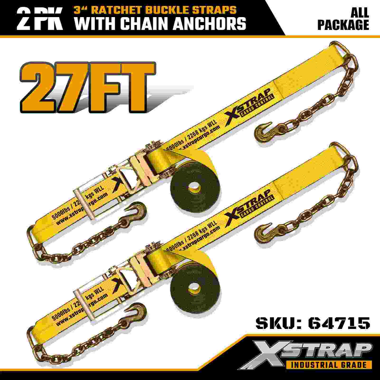 Xstrap 64715 3" × 27 stopa trake s kopčom s čegrtaljkom (2 paketa) – opremljene lančanim sidrima za teške uvjete rada, dizajnirane za zahtjevna teretna okruženja. S ograničenjem radnog opterećenja od 5000 lbs i prekidnom snagom od 15 000 lbs, ove trake pružaju sigurnu, stabilnu i profesionalnu izvedbu pričvršćivanja za platforme, transport strojeva i industrijsko vučenje.