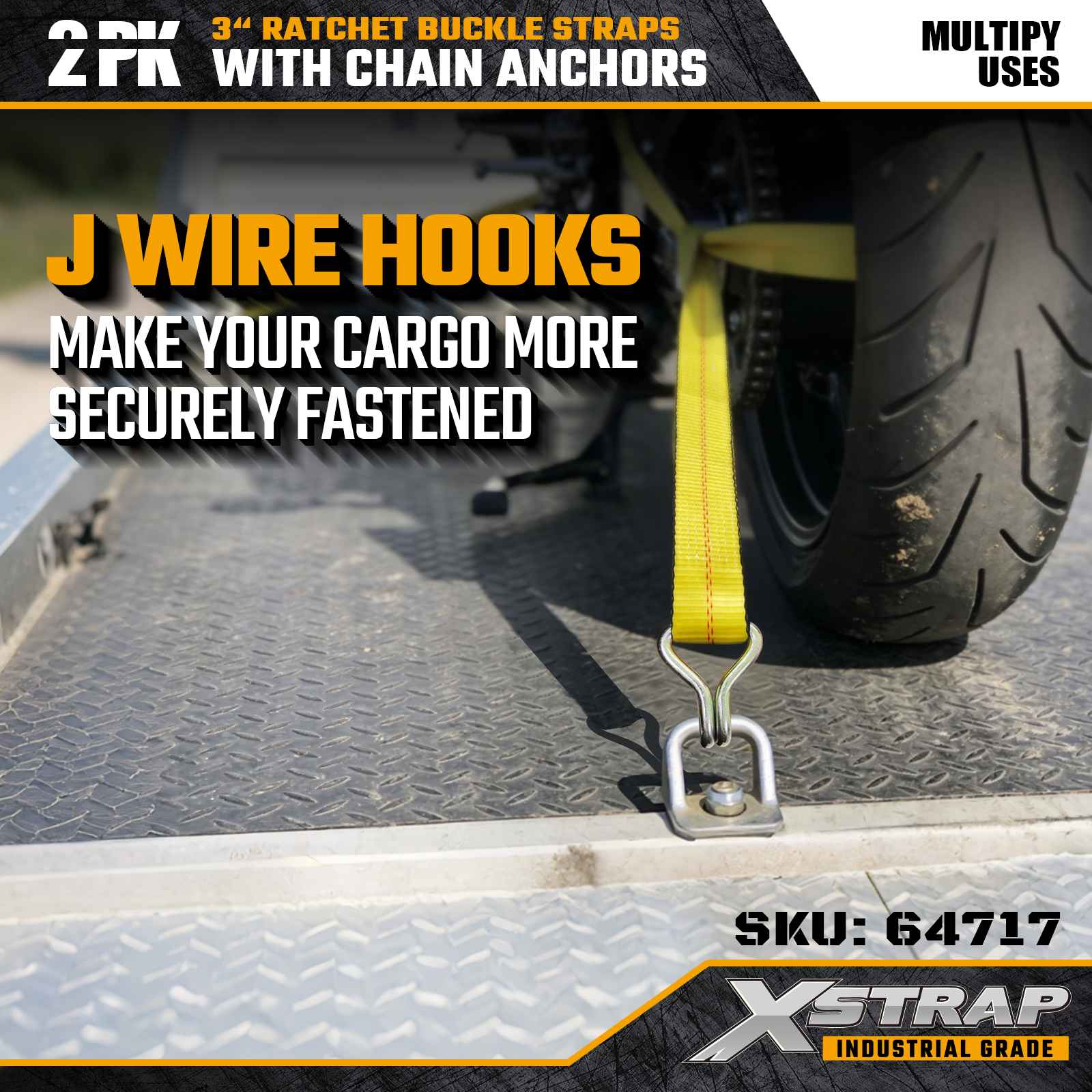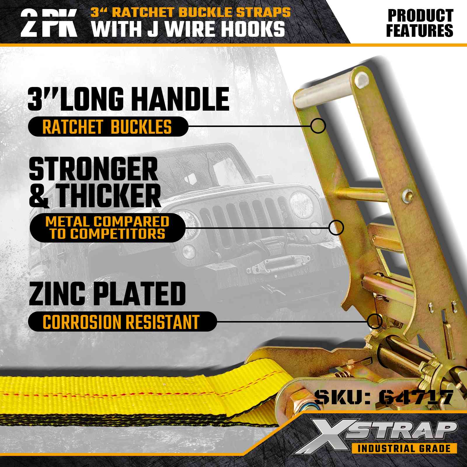 Xstrap 64717 3" × 30 stopa remen s kopčom s čegrtaljkom (paket od 2 komada) dizajniran je za profesionalno učvršćivanje tereta, s pojačanim žičanim kukama i mehanizmom s čegrtaljkom za teške uvjete rada. S ograničenjem radnog opterećenja od 5.000 lbs i otpornošću na kidanje od 15.000 lbs, ovi remeni pružaju pouzdanu izvedbu dugog dosega za platforme, transport strojeva, i industrijske vučne operacije.