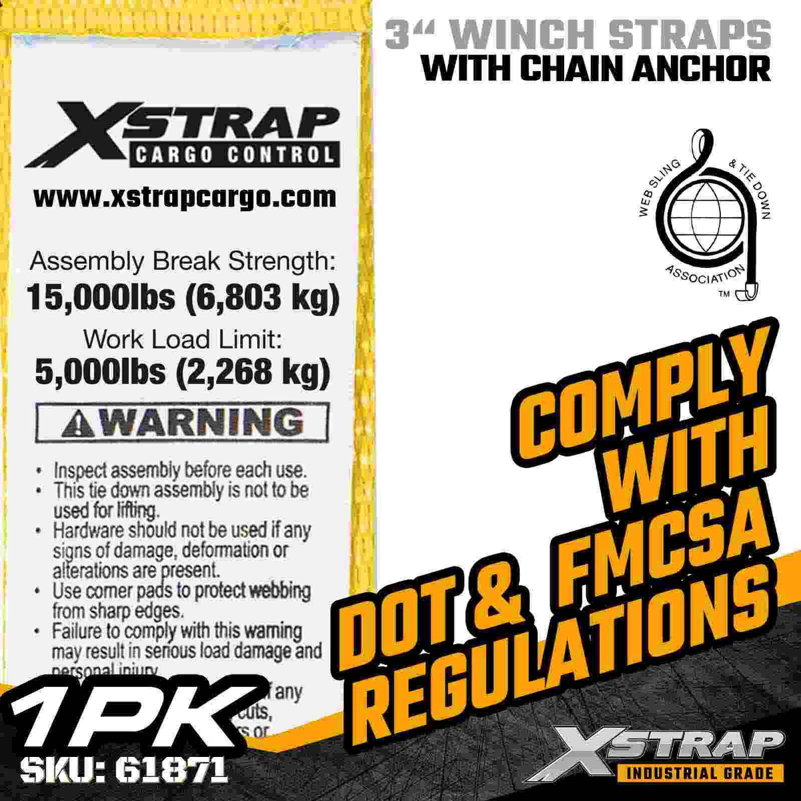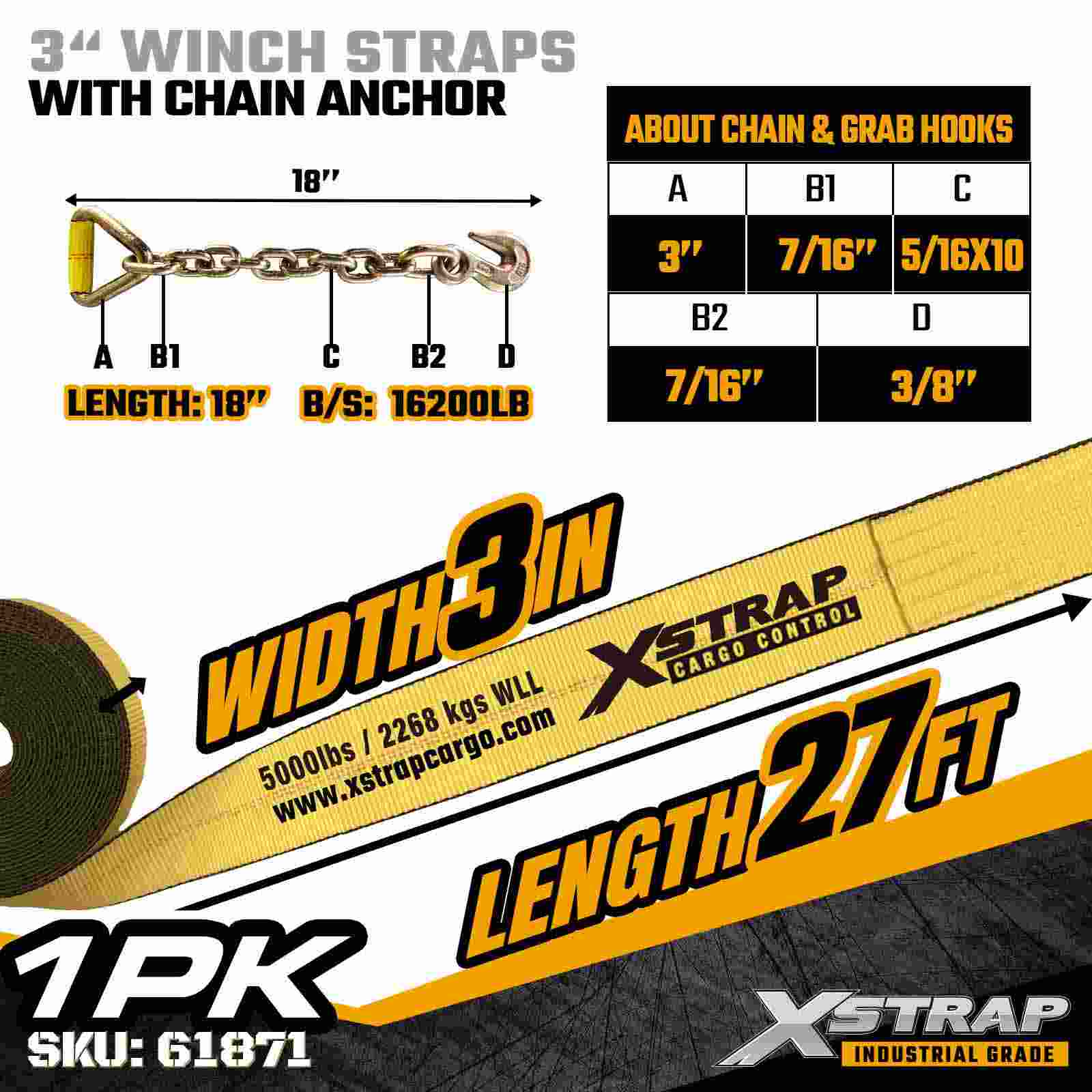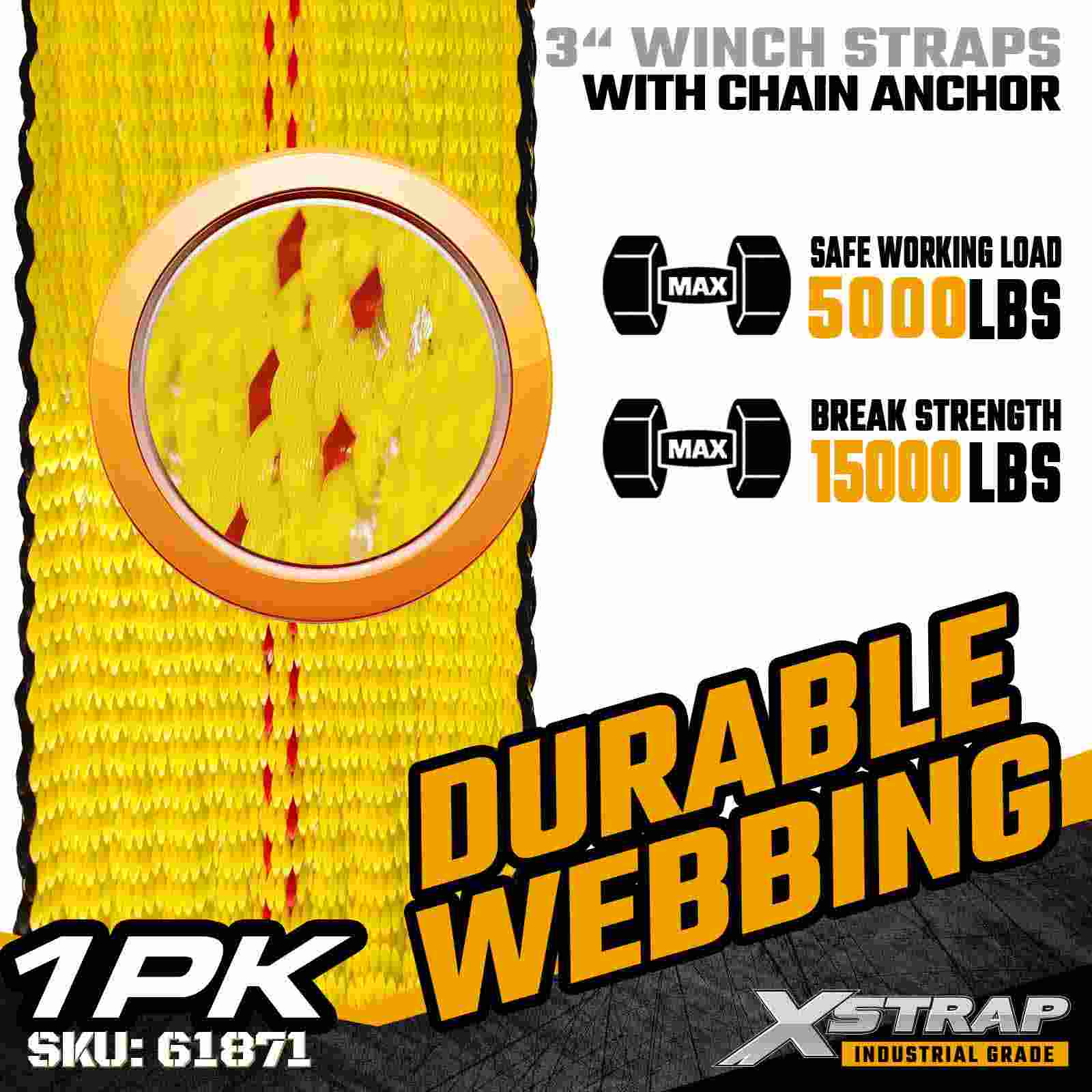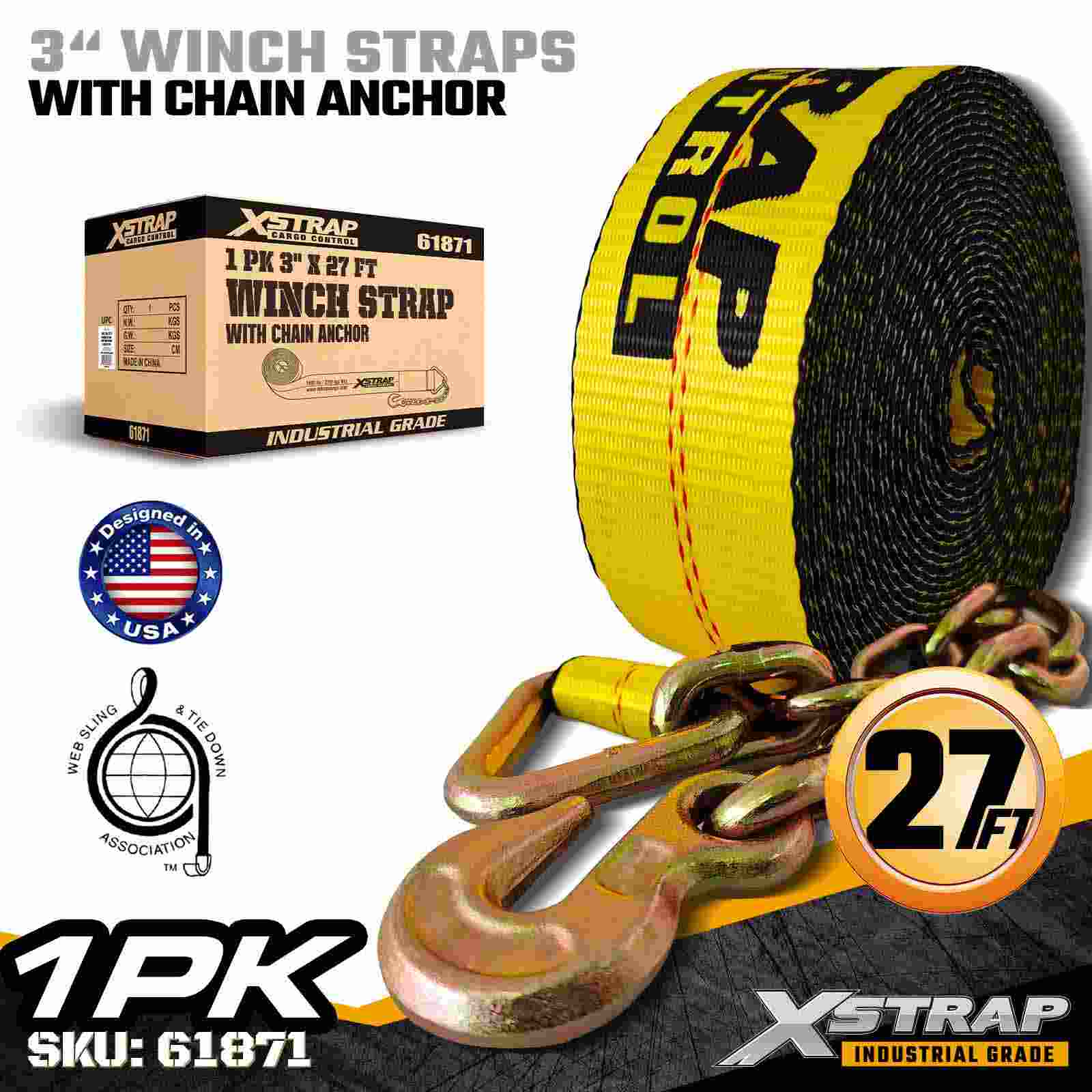 Standardna traka za vitlo Xstrap 61871 3" × 27 stopa dizajnirana je za pričvršćivanje teškog tereta na prikolicama s ravnim platformama. Uz kovano sidro za lanac i posebno široku poliestersku traku od 3 inča, ova traka za vitlo od 3 inča pruža ograničenje radnog opterećenja od 5000 lbs i otpornost na prekid od 15 000 lbs. Dizajniran je za zahtjevne industrijske primjene gdje je potrebna maksimalna čvrstoća držanja i stabilnost.