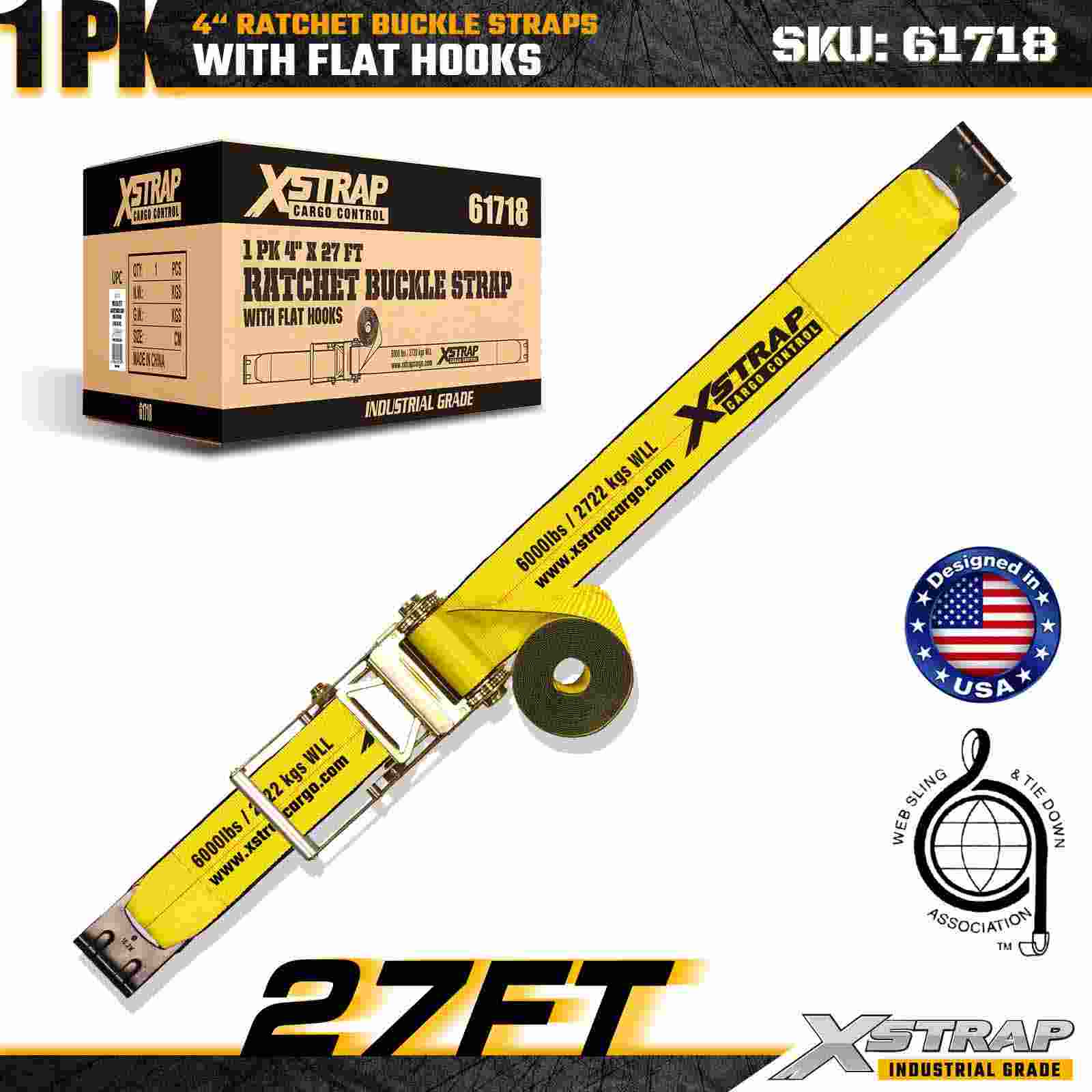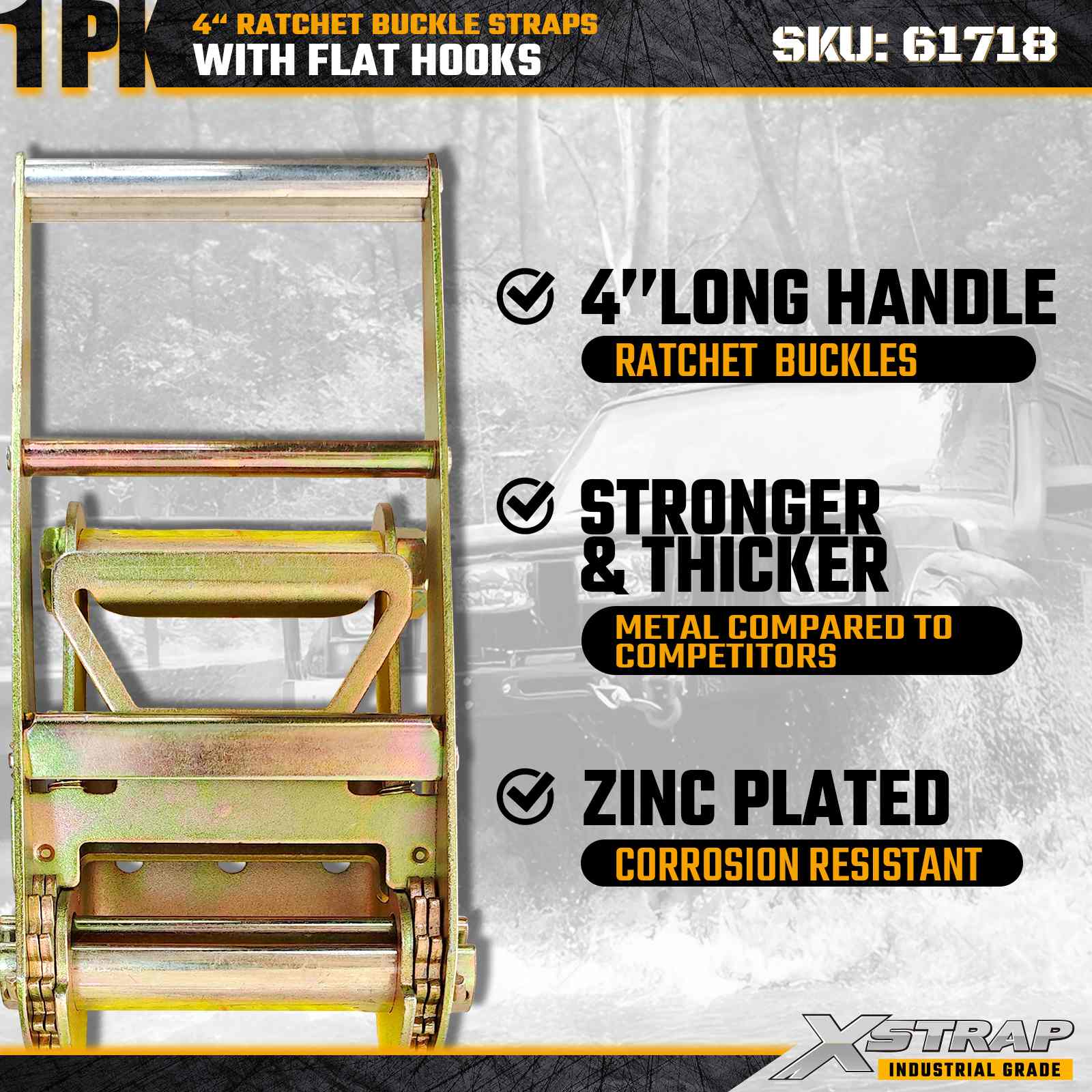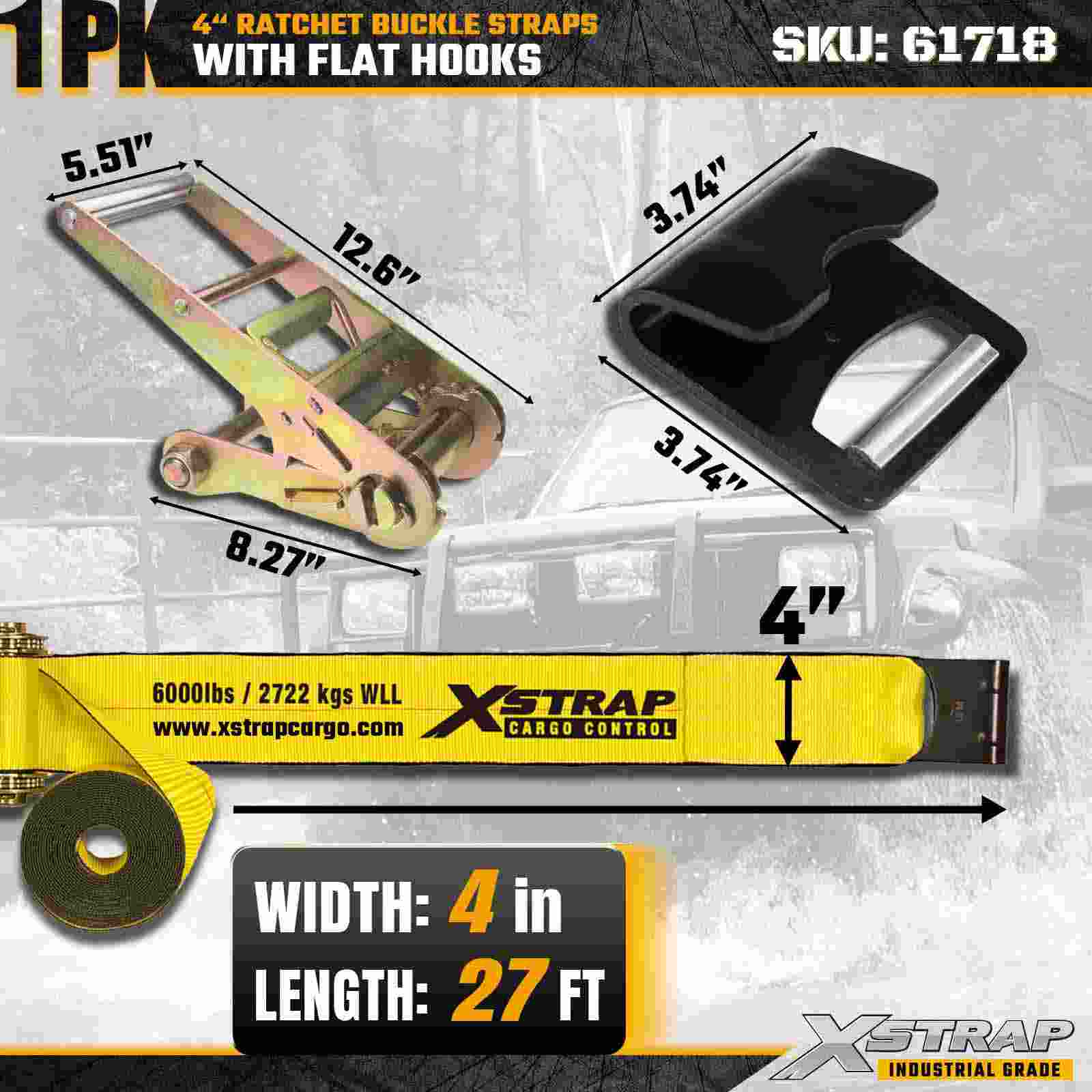 Xstrap 61718 4" × 27 stopa remen s kopčom s čegrtaljkom (paket od 1 komada) napravljen je za osiguranje tereta u ekstremnim uvjetima, s ojačanim pljosnatim kukama i mehanizmom s čegrtaljkom za teške uvjete rada. S ograničenjem radnog opterećenja od 6 000 lbs i otpornošću na kidanje od 18 000 lbs, ovaj je remen dizajniran za profesionalno vučenje s ravnom platformom, građevinski materijali, transport strojeva i industrijska logistika gdje su maksimalna snaga i pouzdanost bitni.
