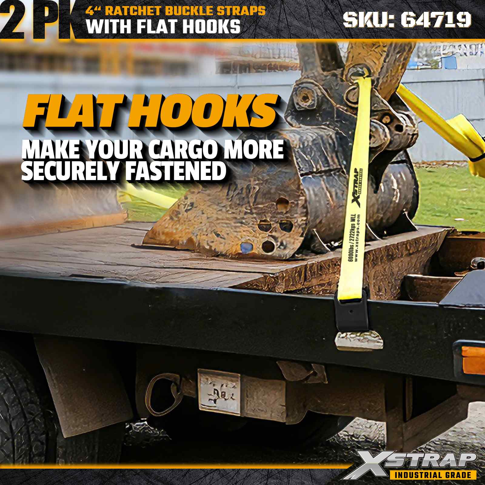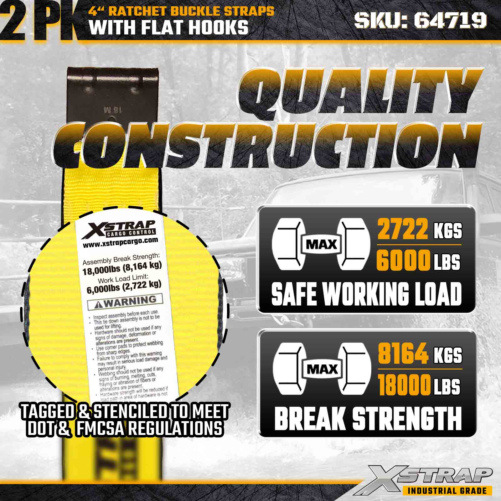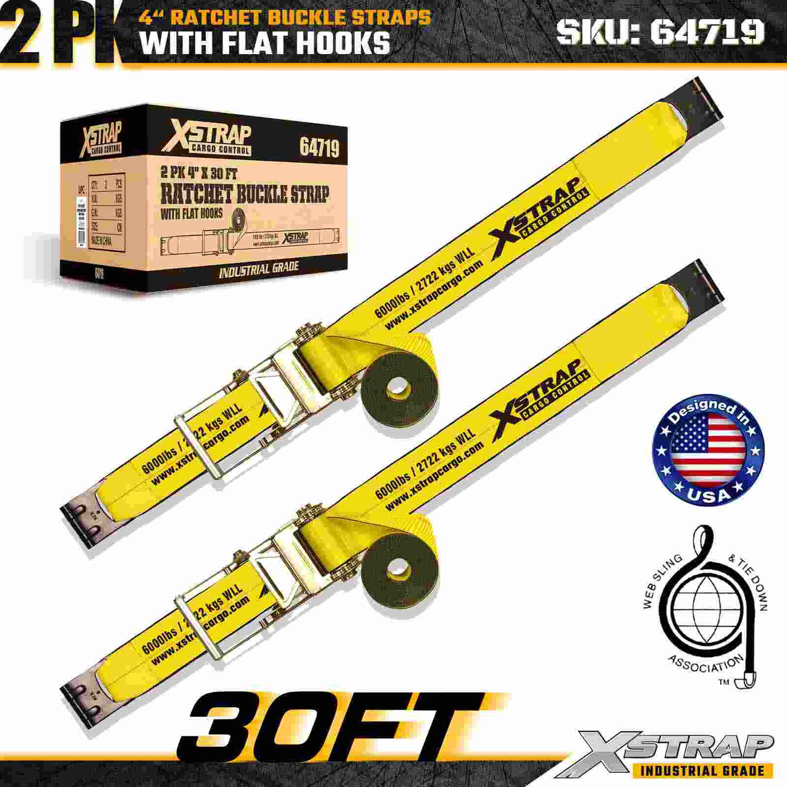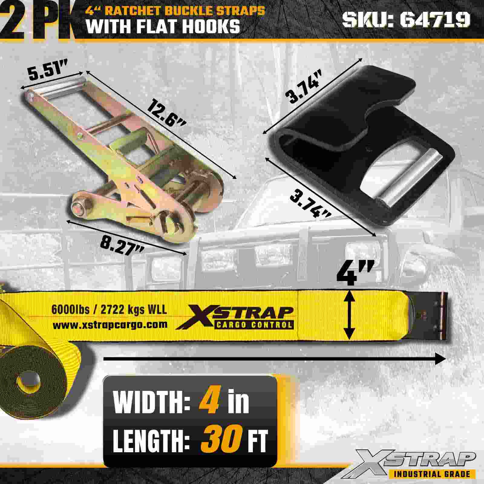 Xstrap 64719 4" × 30 stopa remen s kopčom s čegrtaljkom (paket od 2 komada) pruža čvrsto osiguranje tereta s ojačanim ravnim kukama i izdržljivim mehanizmom s čegrtaljkom. Ocijenjene na 6000 lbs WLL i 18 000 lbs čvrstoće na kidanje, idealne su za vuču s ravnom platformom, transport strojeva i primjene industrijskog tereta.