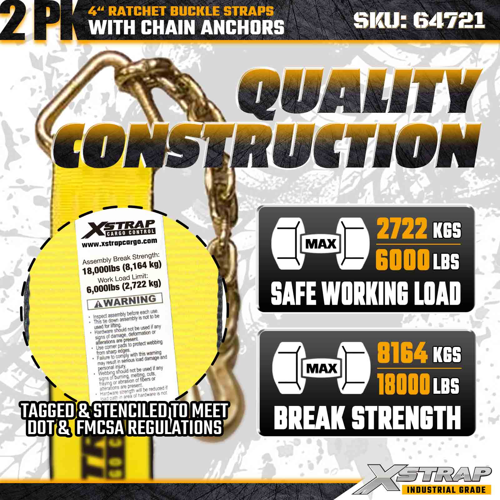 Xstrap 64721 4" × 30 stopa remeni s kopčom s čegrtaljkom (paket od 2 komada) dizajnirani su za pričvršćivanje teškog tereta, s čvrstim lančanim sidrima i ojačanim mehanizmom sa čegrtaljkom. S ograničenjem radnog opterećenja od 6000 lbs i otpornošću na kidanje od 18 000 lbs, ovi su remeni idealni za vuču s ravnom platformom, strojeve prijevoz, čelične terete i industrijske teretne primjene koje zahtijevaju maksimalnu snagu i pouzdanost.