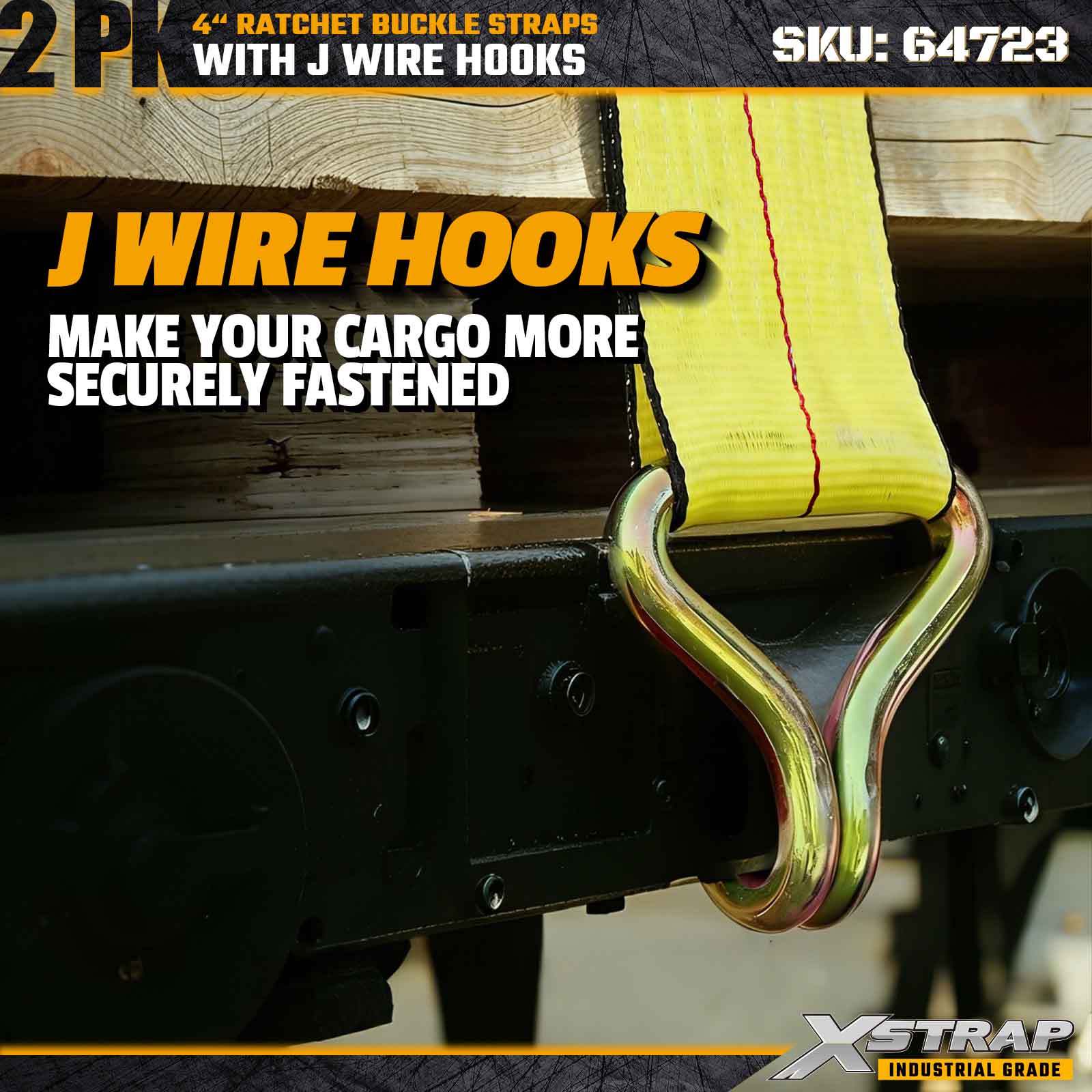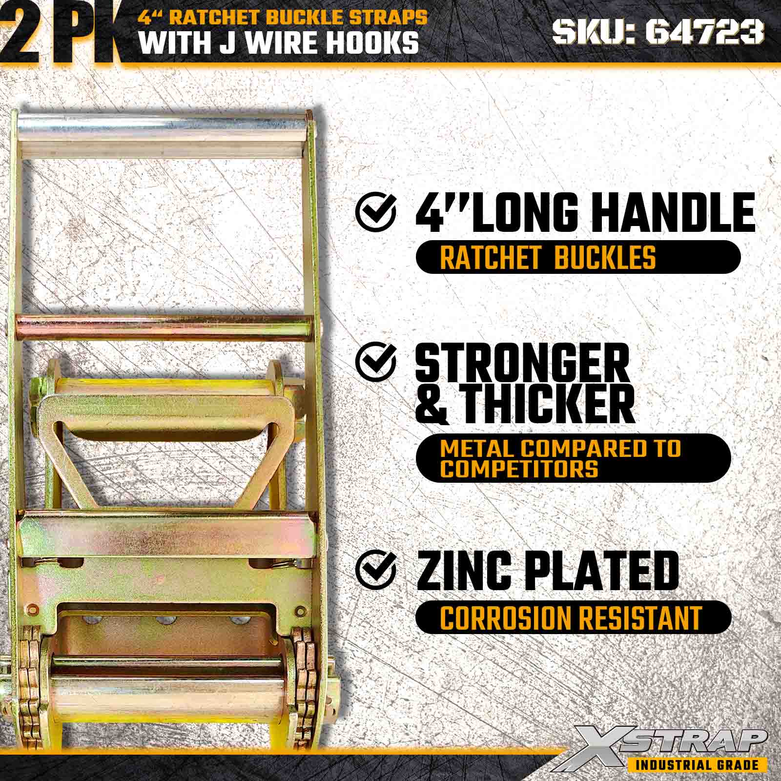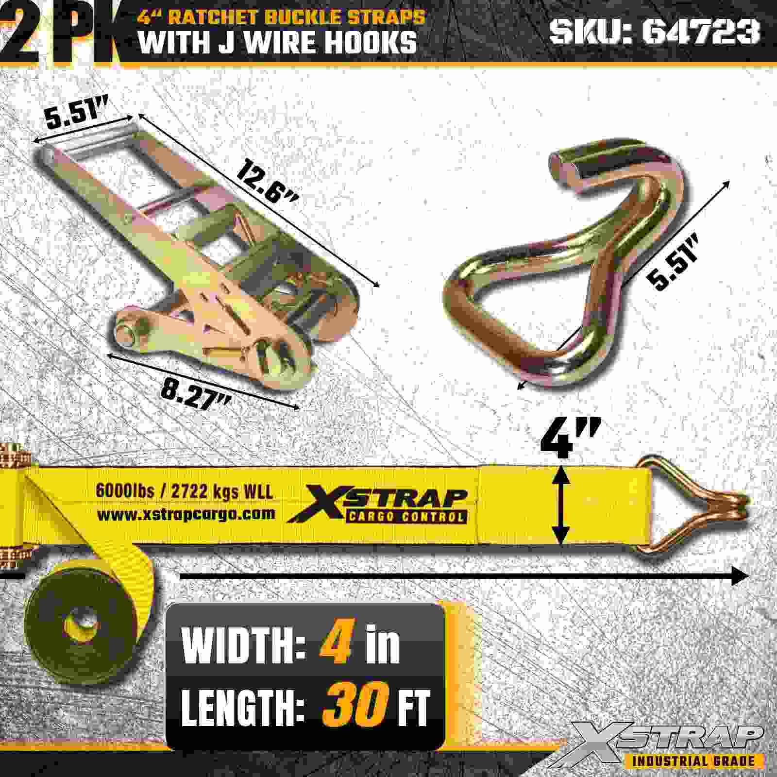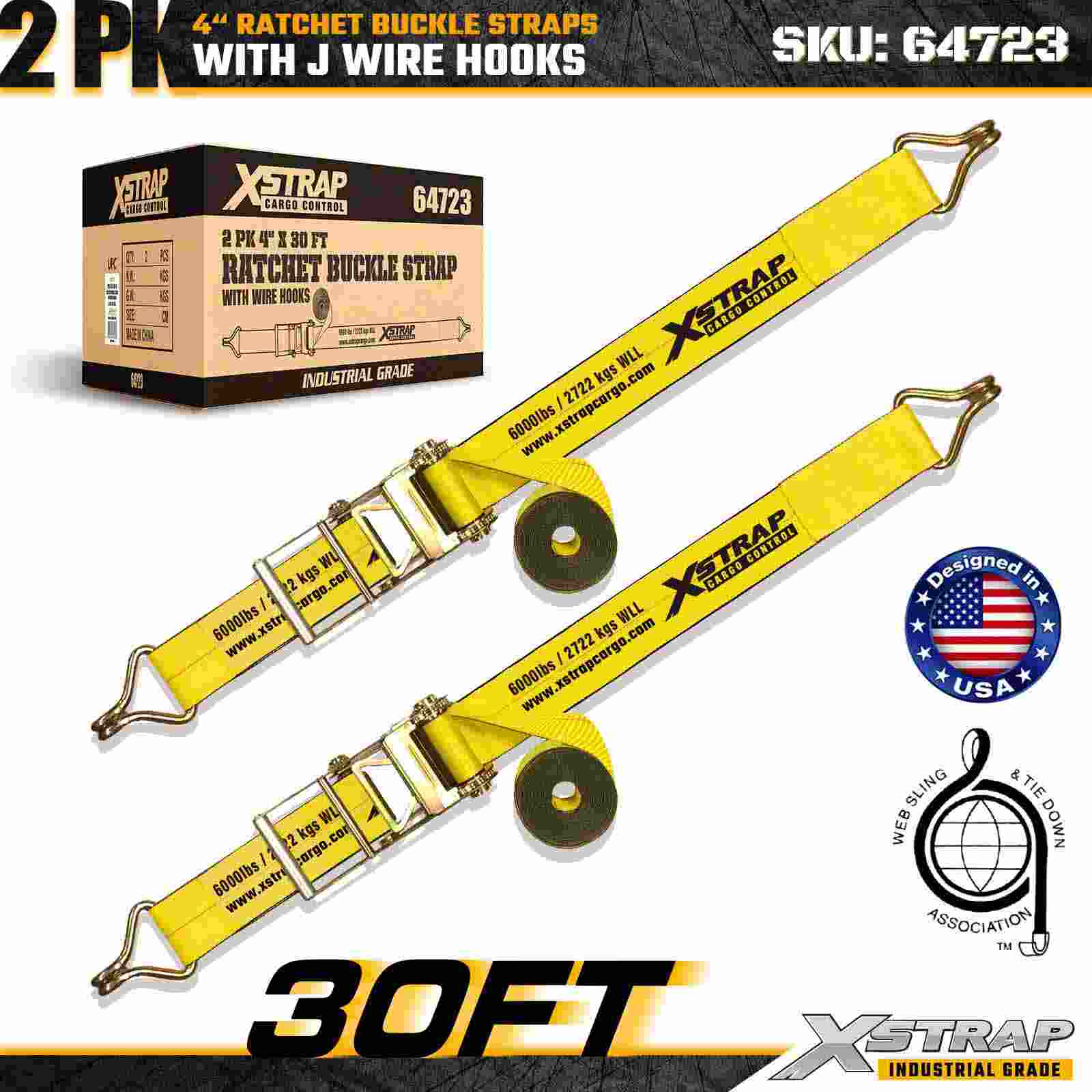 Xstrap 64723 4" × 30 stopa remen s kopčom s čegrtaljkom (paket od 2 komada) dizajniran je za pričvršćivanje teškog tereta, s ojačanim žičanim kukama i izdržljivim mehanizmom s čegrtaljkom. S ograničenjem radnog opterećenja od 6 000 lbs i otpornošću na kidanje od 18 000 lbs, ovi su remeni idealni za vuču s ravnom platformom, strojeve prijevoz, drvna građa, čelični tereti i primjene industrijskog tereta.