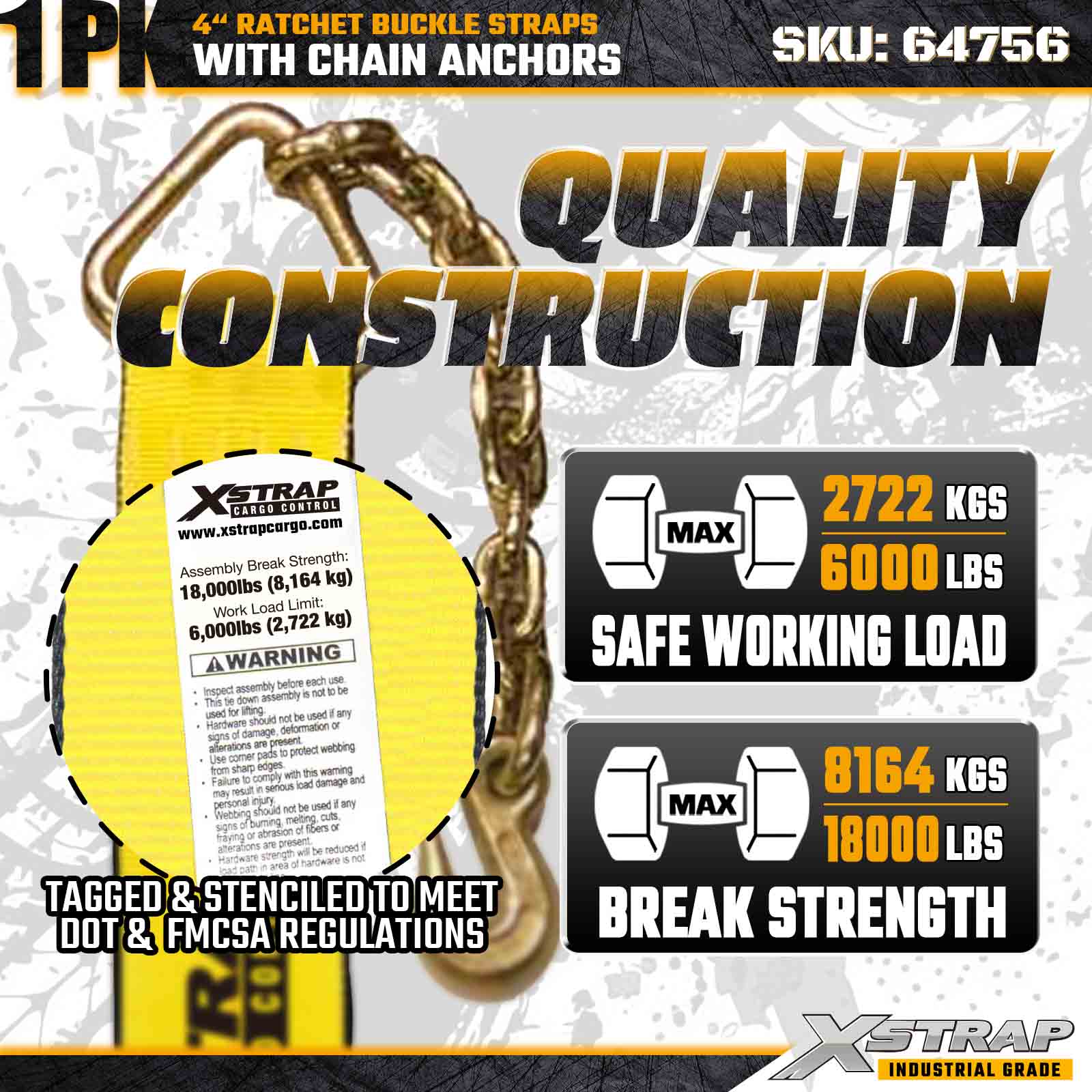 Xstrap 64756 4" × 50ft remen s kopčom s čegrtaljkom (paket od 1 komada) dizajniran je za pričvršćivanje tereta u ekstremnim uvjetima, s robusnim lančanim sidrima i ojačanim mehanizmom sa čegrtaljkom. S ograničenjem radnog opterećenja od 6000 lbs i lomnom snagom od 18 000 lbs, ovaj dodatniduga traka idealna je za prevelike terete, transport strojeva, vuču čelika i industrijsku logistiku koja zahtijeva maksimalan doseg i pouzdanost.