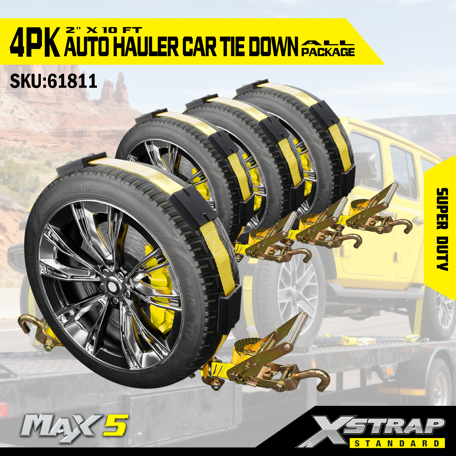 Xstrap trake za tegljače automobila, teške uvjete rada 6,600 lbs, otpornost na kidanje - trake za pričvršćivanje gume za prikolice, pričvrsne trake za vožnju preko kotača s gumenim klinovima za SUV, kamione, ATV, UTV