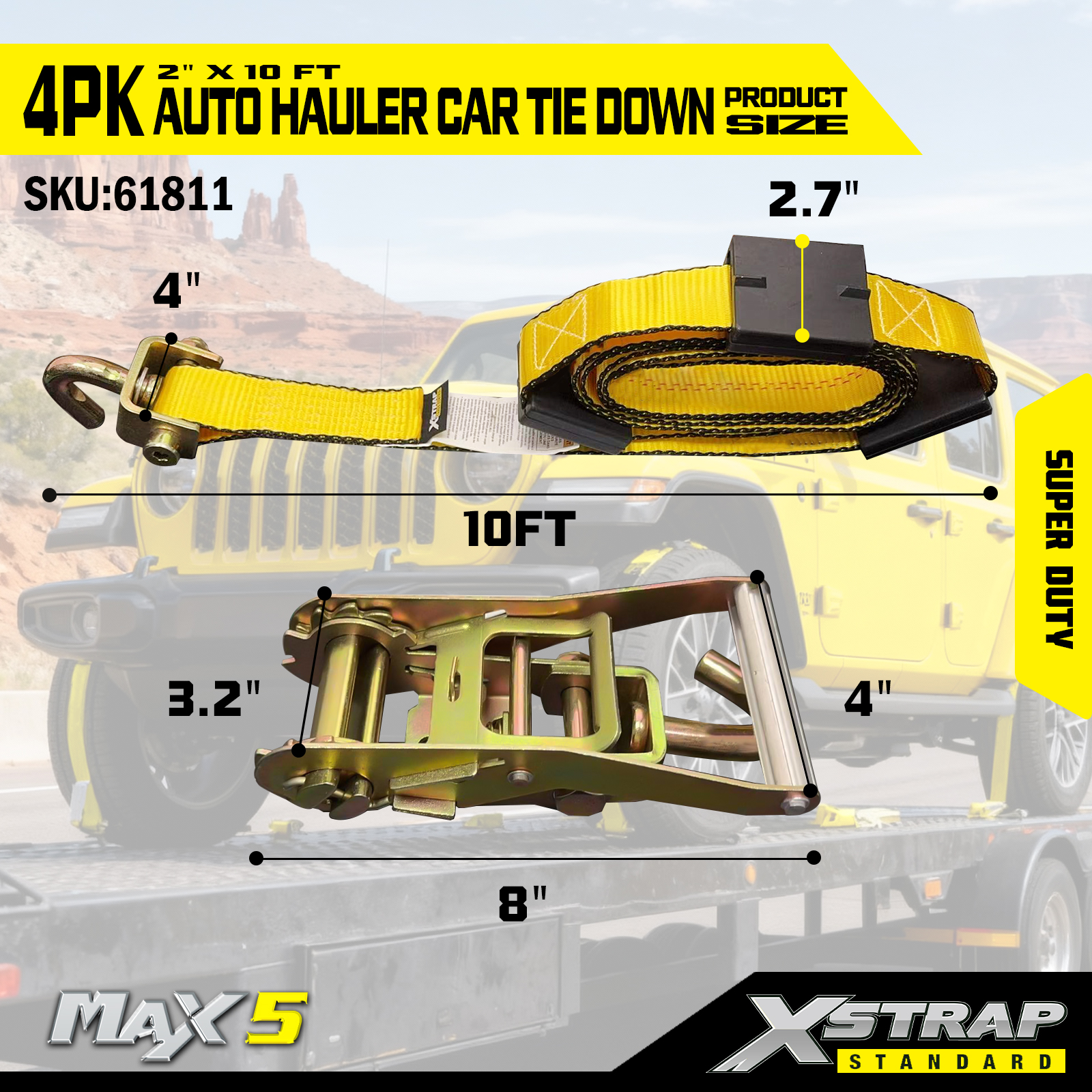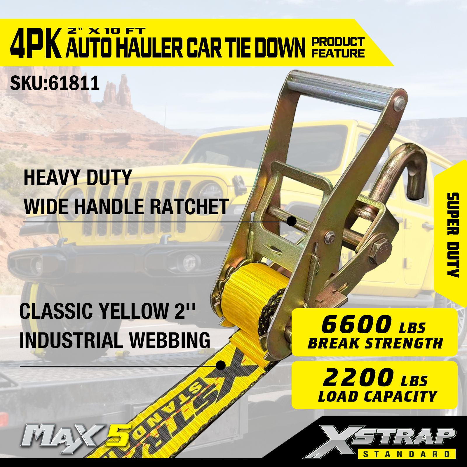 - Super Duty Performance: Svaki remen ima sigurno radno opterećenje od 2200. Sigurno radno opterećenje je utisnuto na pločici upozorenja svake trake za vezivanje radi lakšeg pregleda, napravljeno je za rukovanje teškim vozilima i zahtjevnim transportnim scenarijima.