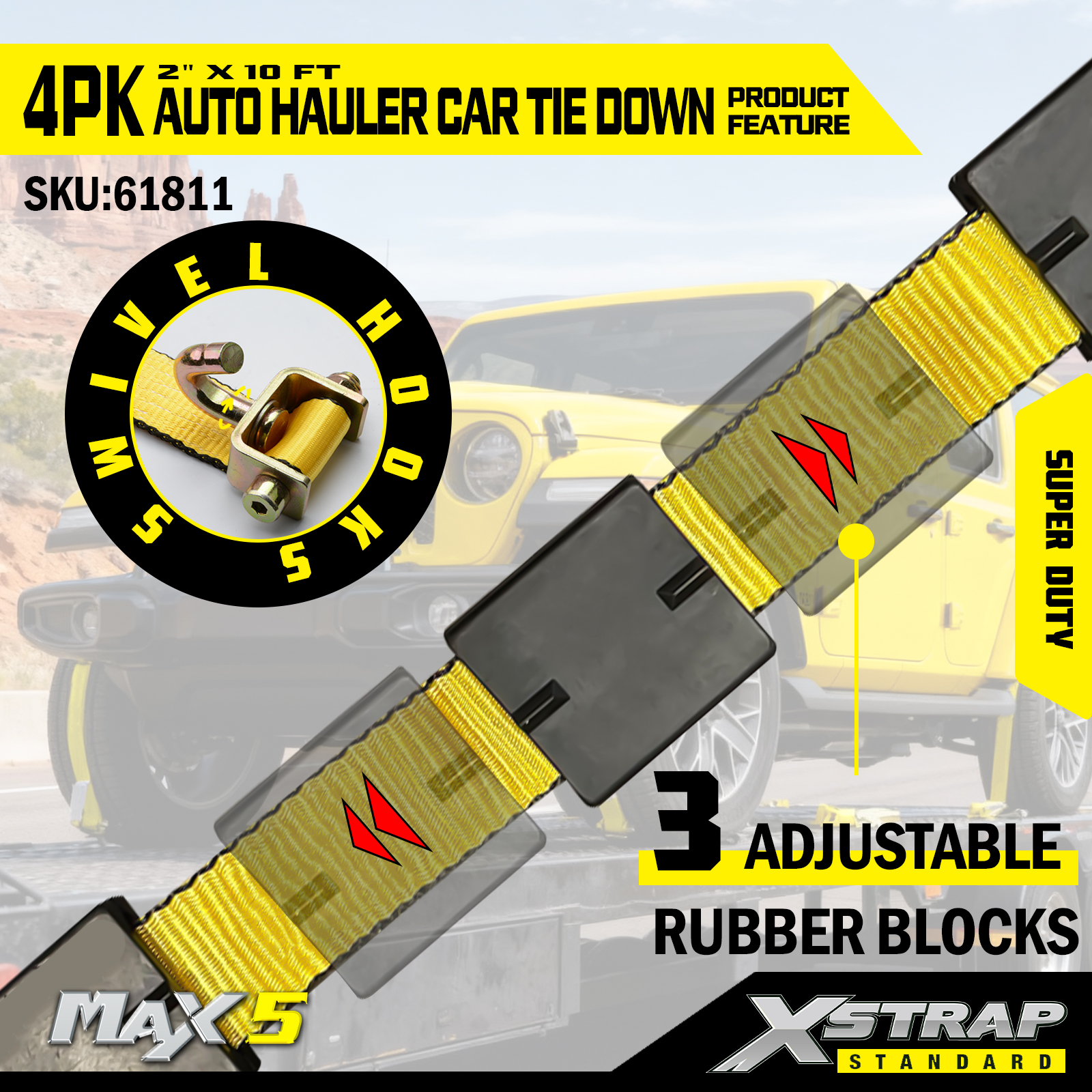 - Komponente industrijske čvrstoće - Svaki remen uključuje tri kuke, zatezač i tri gumene bitve, i omogućuje vozilu da se vozi na vlastitom ovjesu, eliminirajući prijenos udarca. Kuke za pražnjenje pristaju u standardne "rupe" ili "zvjezdaste rupe" za auto tegljače, a remen okružuje kotač i zateže se dalje od