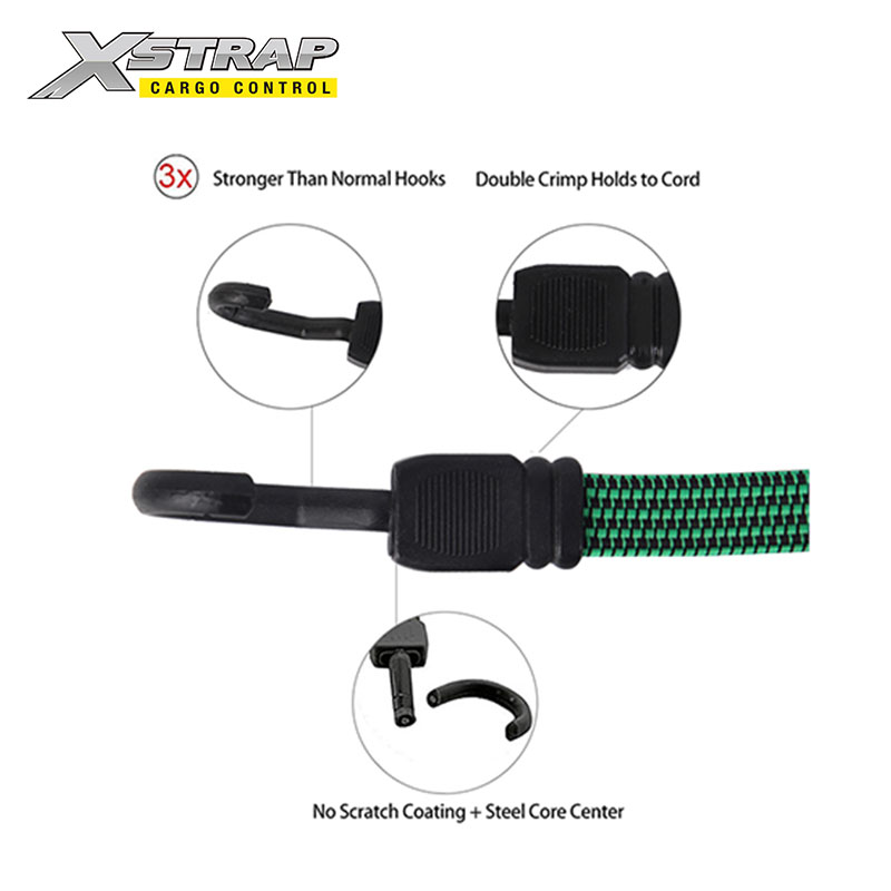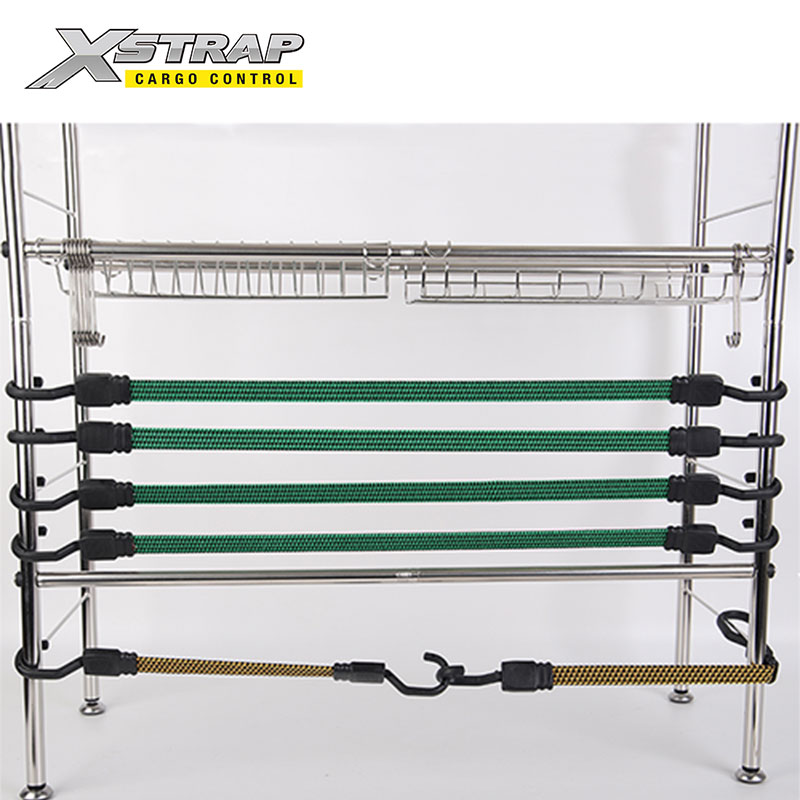 - Ravne bungee užadi mogu spriječiti klizanje s tereta kada ih koristite. Tako može povećati sigurnost. Manje je vjerojatno da će se kotrljati ili uvijati kada pričvršćujete predmete. To može biti posebno korisno kada osiguravate predmete nezgrapnog oblika ili kada ste u žurbi. A budući da je dizajn ravne mreže, pritisak je ravnomjerno raspoređen preko širokog pojasa. Ravne bungee užadi idealne su za vanjštinu, pokrivače s ceradom, ručni kamion, kampiranje, motocikl, automobile, bicikle, police za prtljagu.