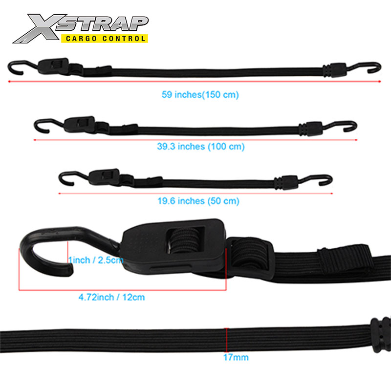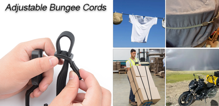 Podesivi bungee konopci nude povećanu stabilnost i smanjenu sklonost kopanju po predmetima. Oni su svestrani i prikladni za širok raspon primjena, uključujući opremu, organiziranje skladištenja, vezivanje prtljage ili cerada, sigurnu vanjsku opremu, vrt, garažu ili aplikacije na putovanju.