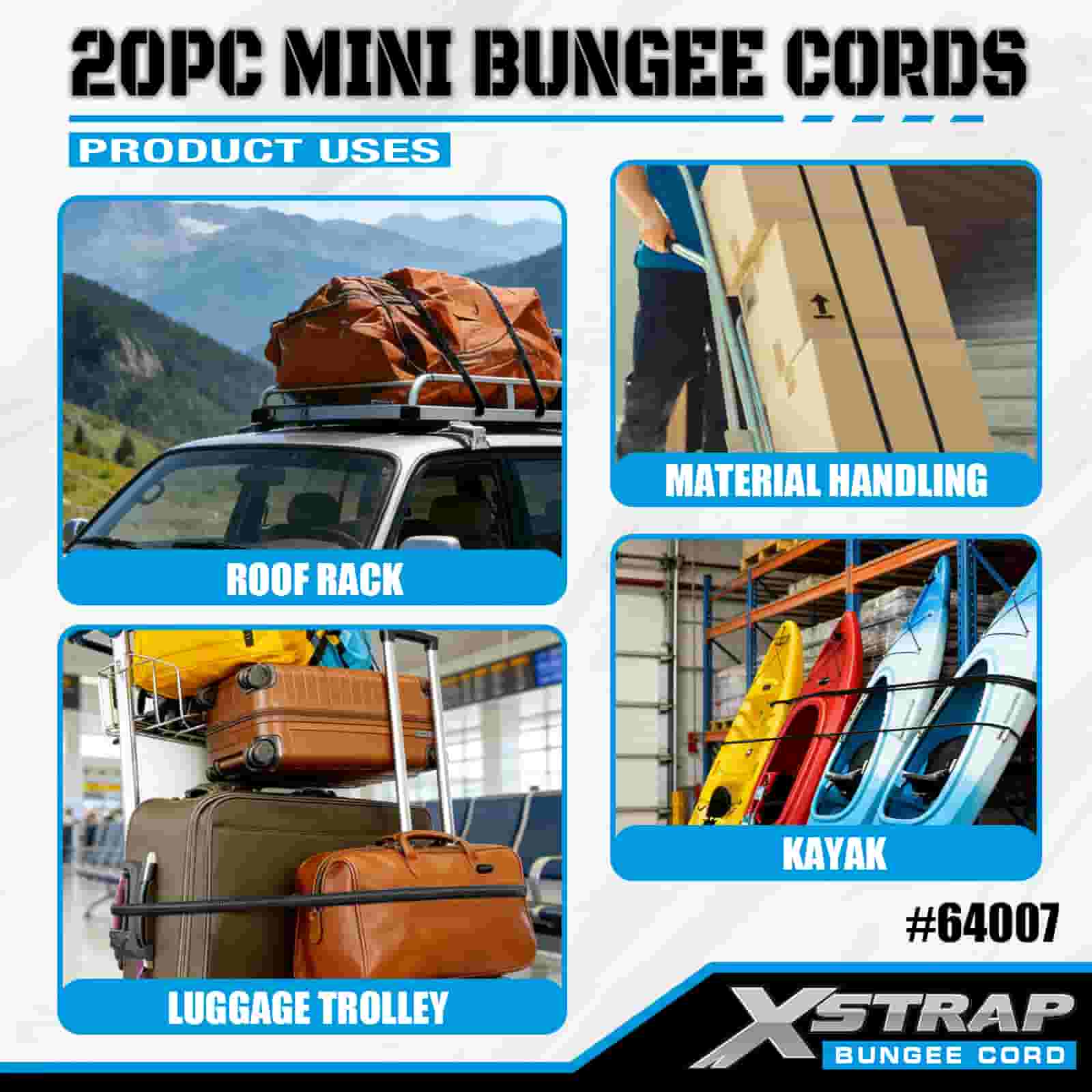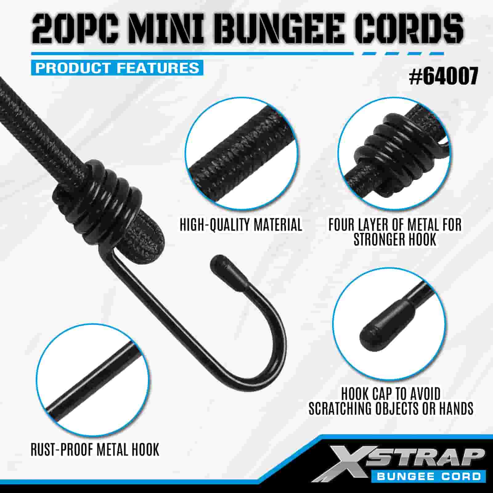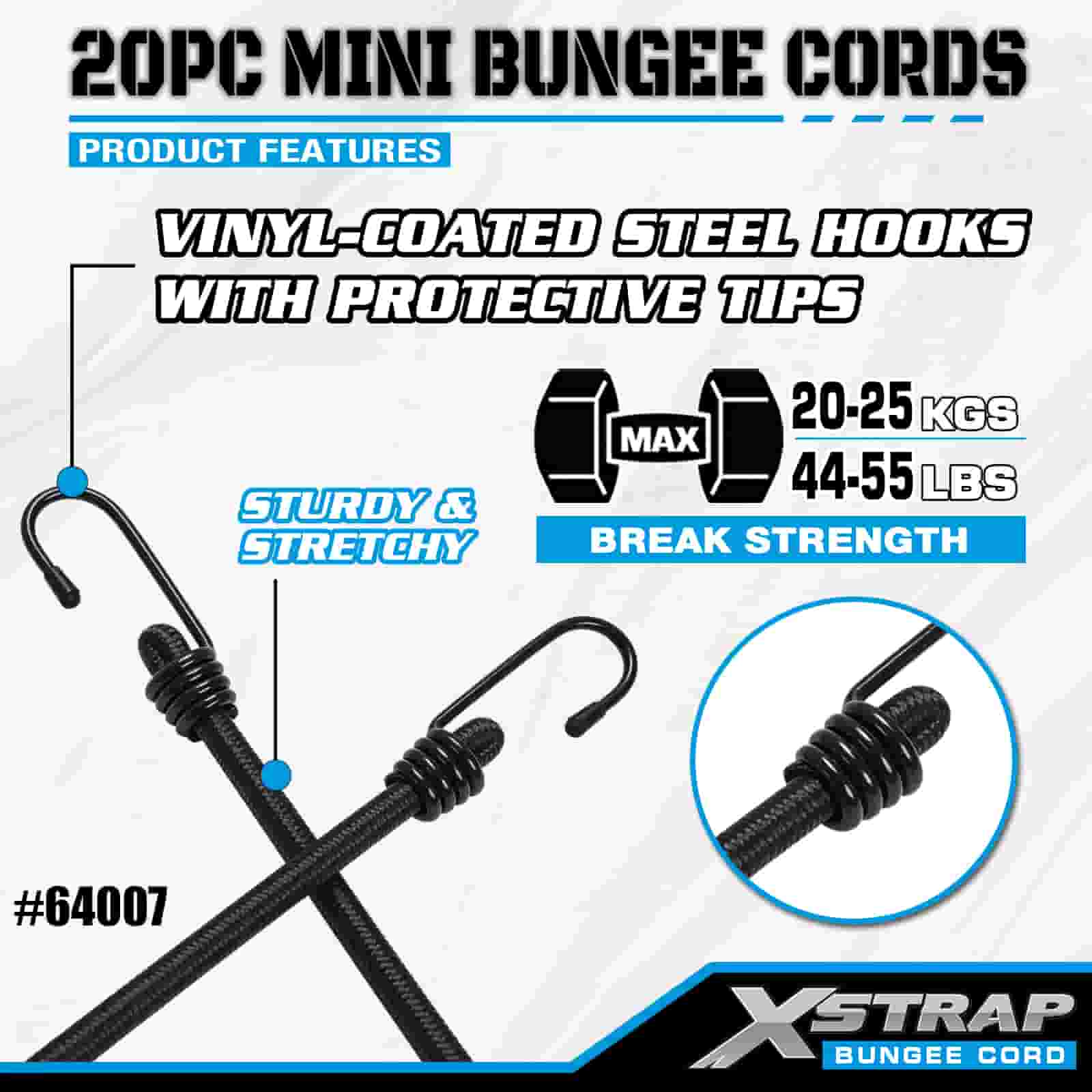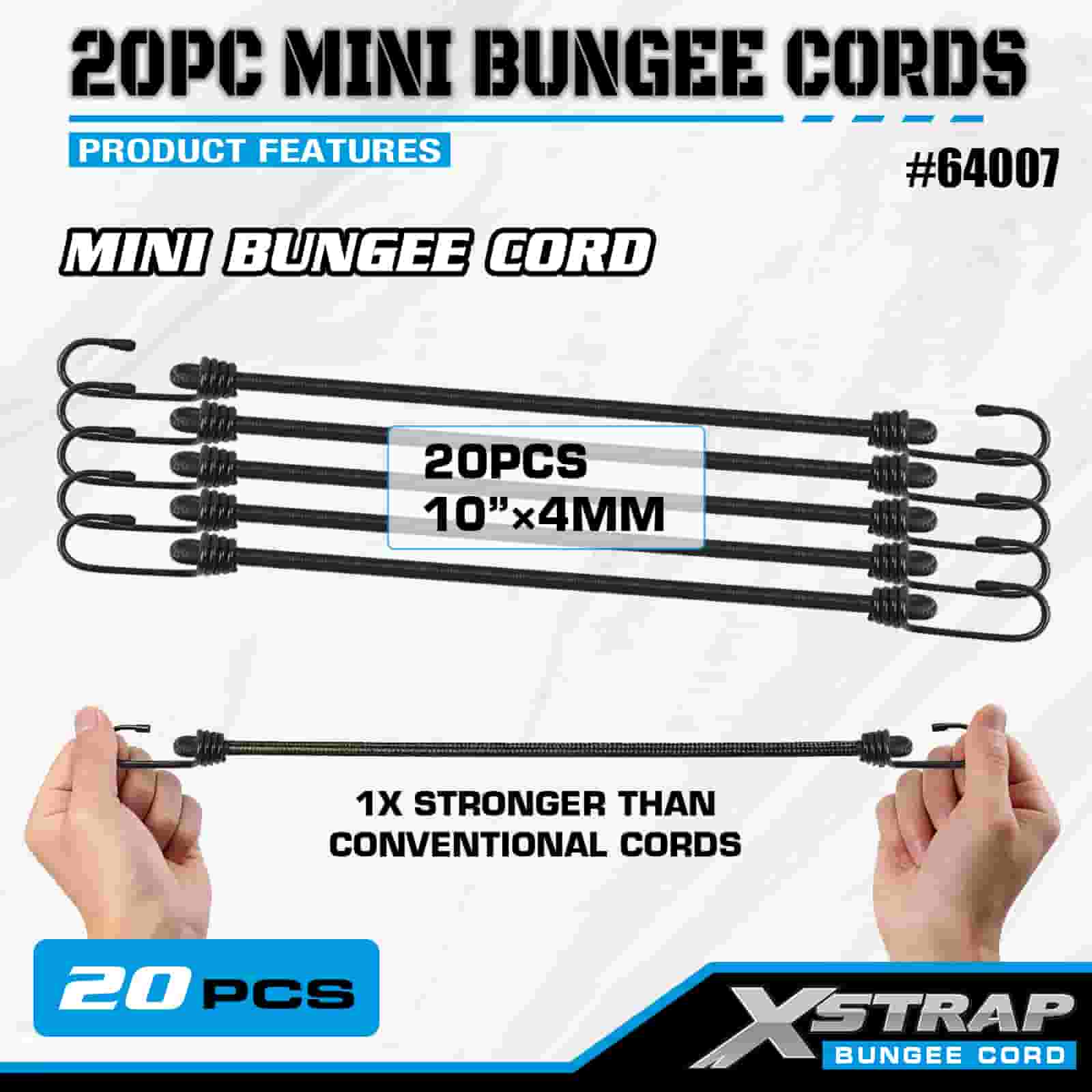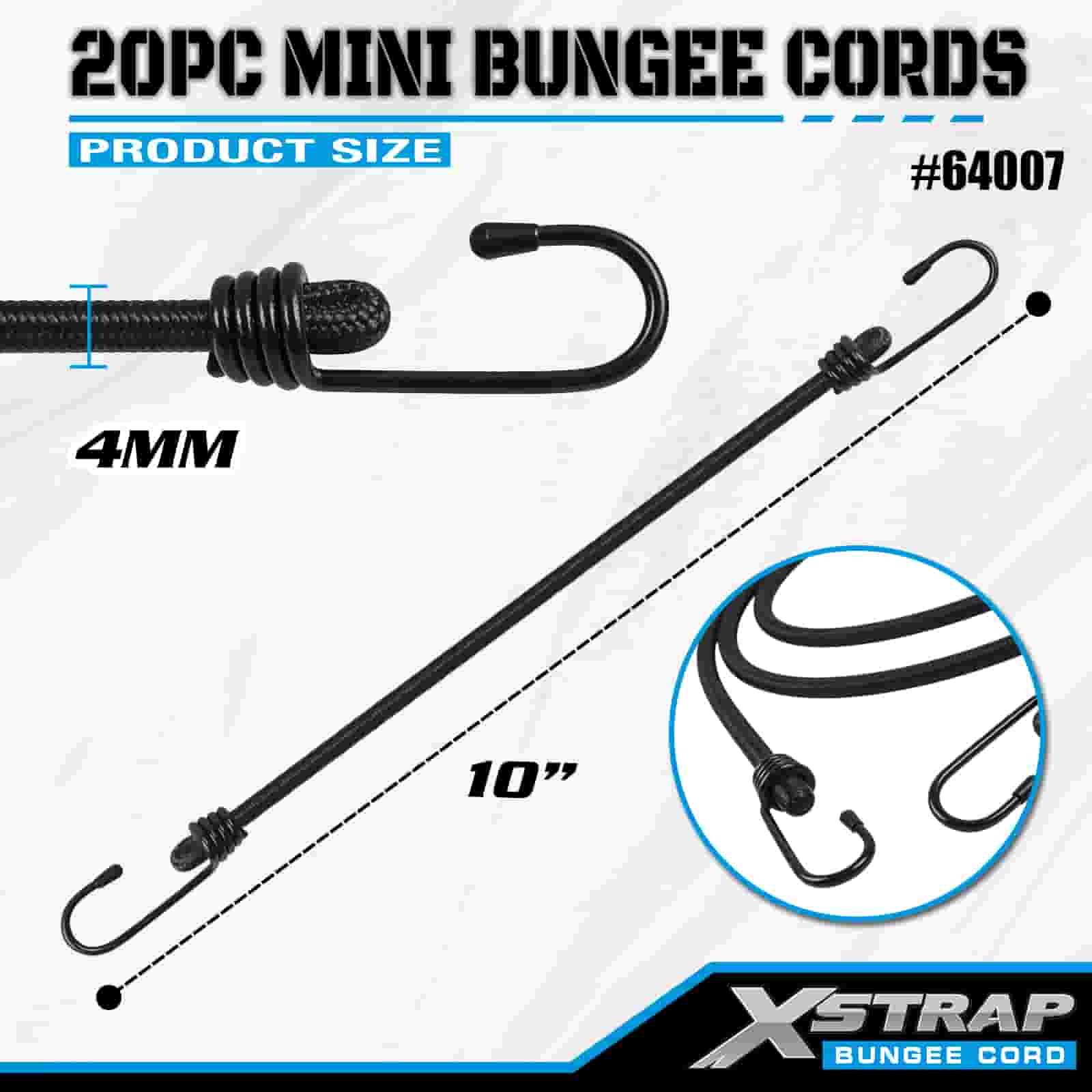 Xstrap 20PK MINI bungee konopci 4 mm x 10", 44-55 lbs čvrstoće na prekid s čeličnim kukama sa zaštitnim vrhovima i standardnim opružnim kukama.
