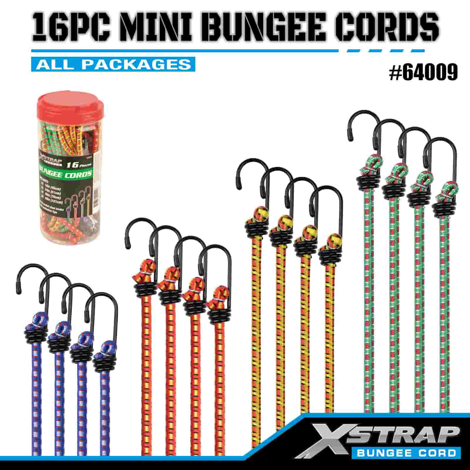 Xstrap 16PK Bungee kabeli 8 mm x 18”/24” /30”/ 40”, 44-55 lbs čvrstoće na prekid s čeličnim kukama sa zaštitnim vrhovima i standardnim opružnim kukama.