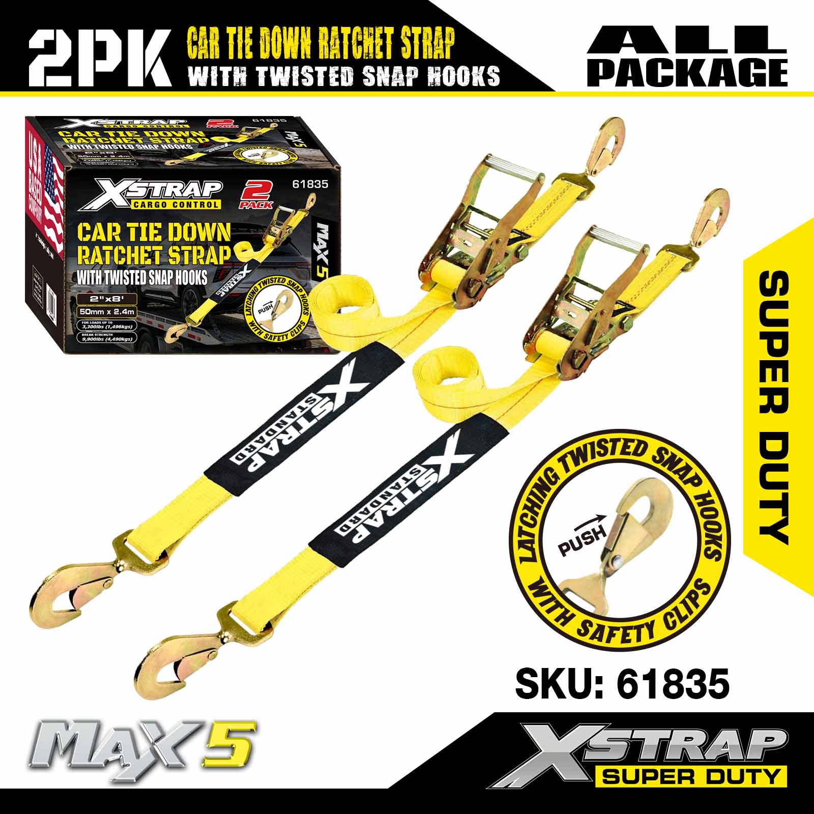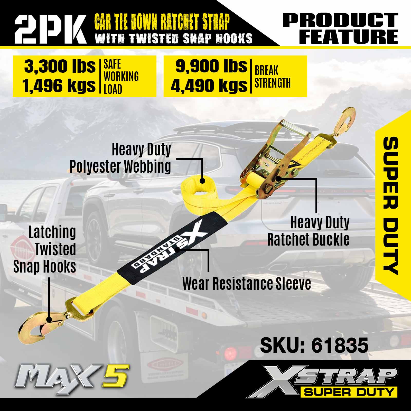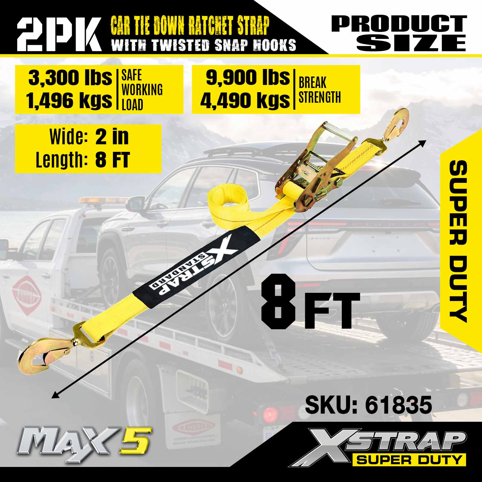 Xstrap trake za pričvršćivanje automobila za prikolice, 2 inča x 8 inča trake s čegrtaljkom za tegljače automobila, 2 PK, 10 000 lbs otpornost na prekid