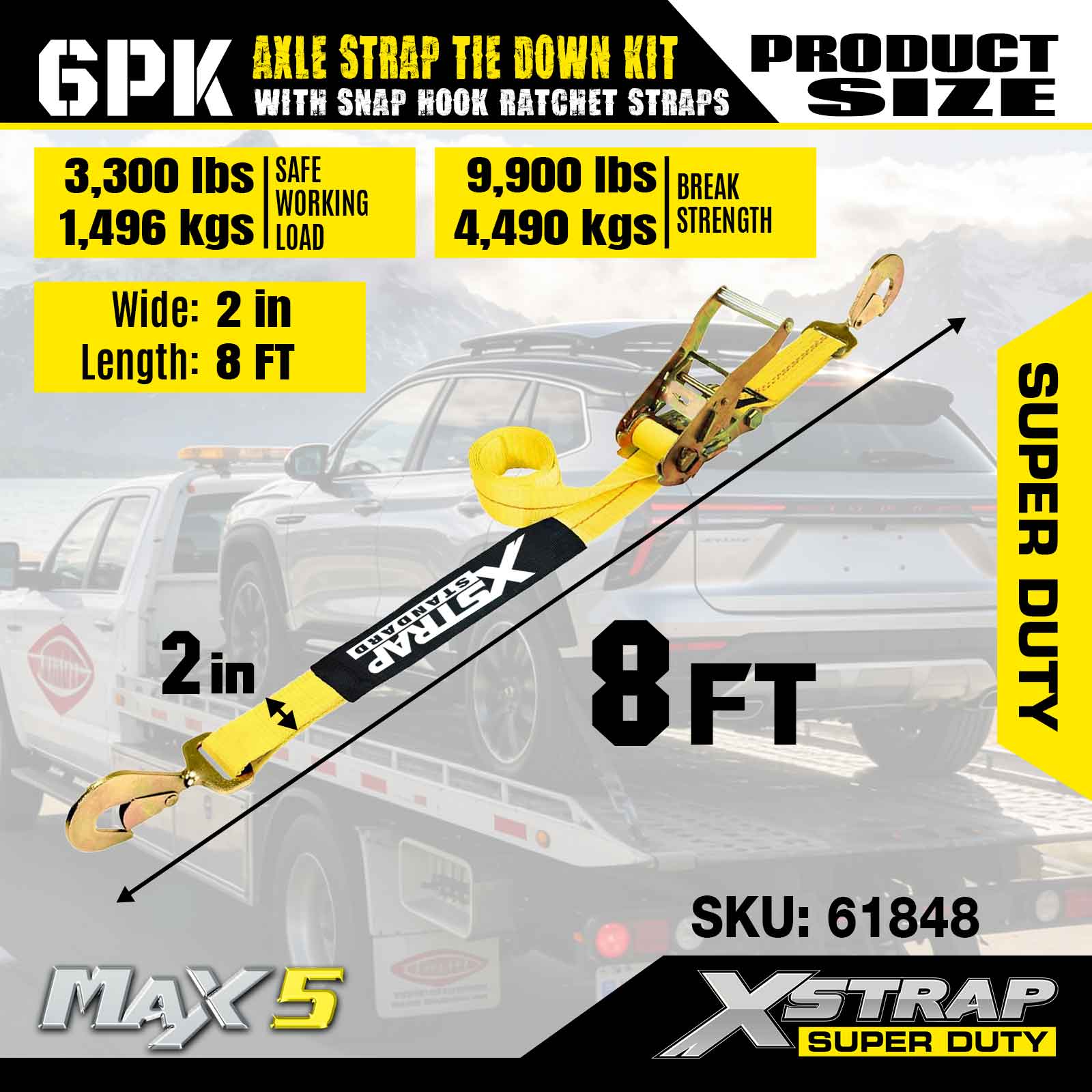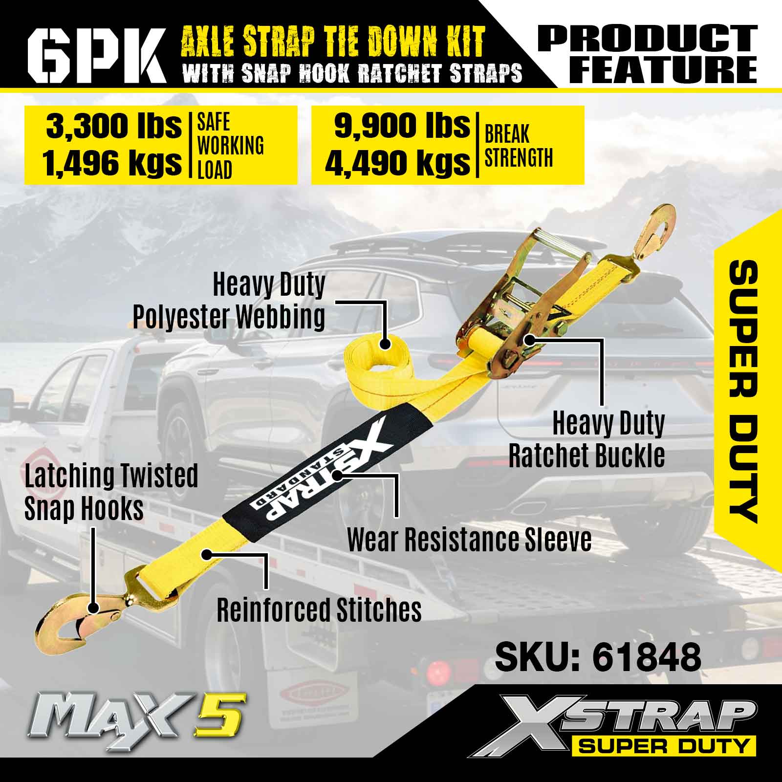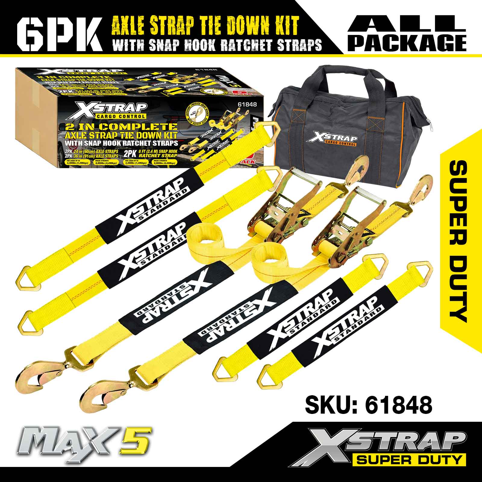 Xstrap 6PK komplet za pričvršćivanje remena za osovinu (s karabinom s čegrtaljkom) – Super Duty. Ima sigurno radno opterećenje od 3,300 LBS (1,496 KG) i čvrstoću na prekid od 9,900 LBS (4,490 KG).