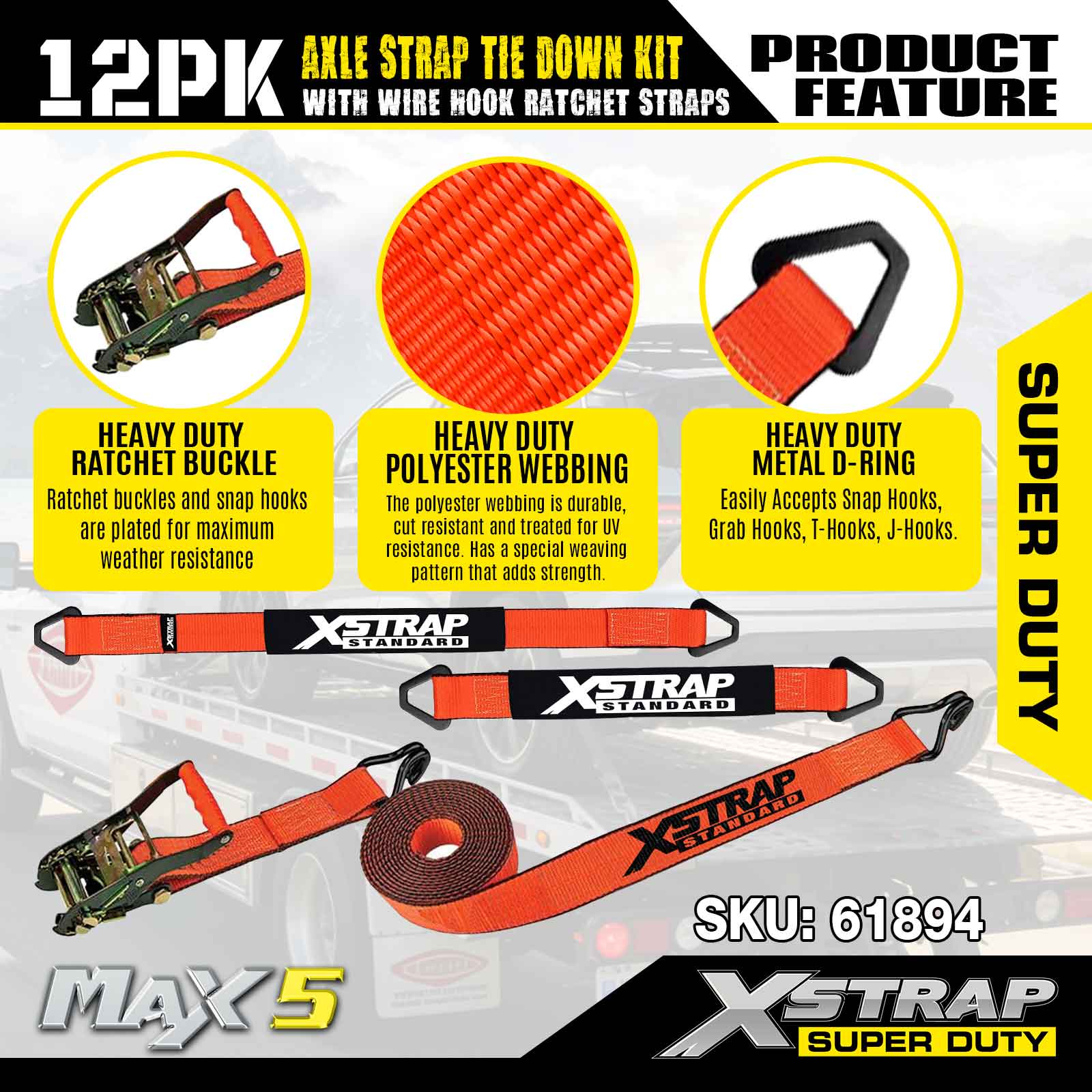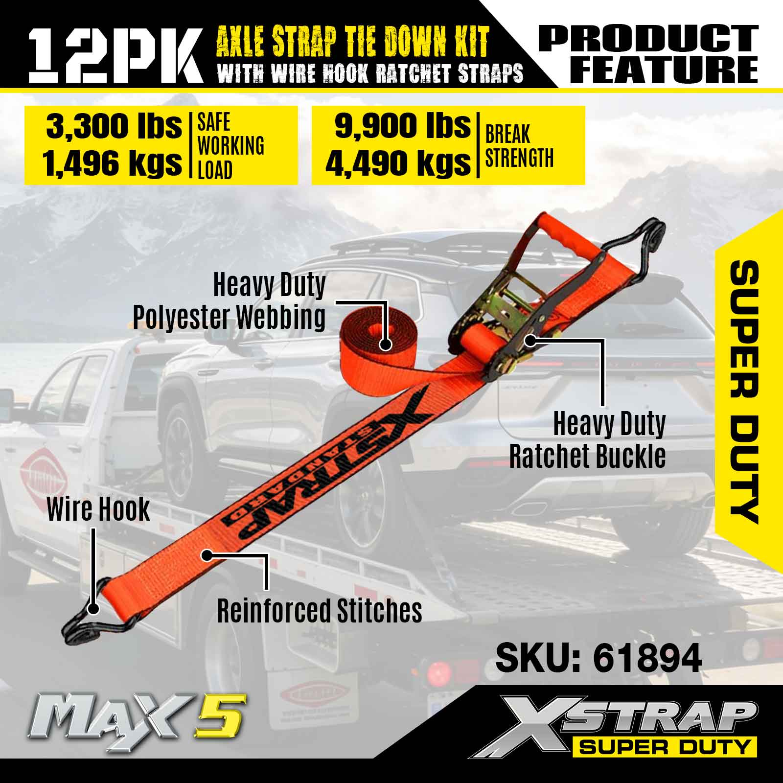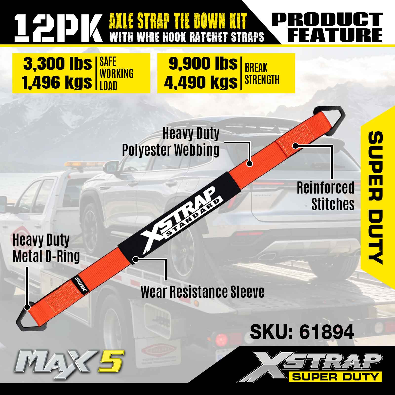 Xstrap 12PK pribor za pričvršćivanje remena za osovinu (sa žičanim remenima za zatvaranje kuke) – Super Duty. Ima sigurno radno opterećenje od 3,300 LBS (1,496 KG) i čvrstoću na prekid od 9,900 LBS (4,490 KG).