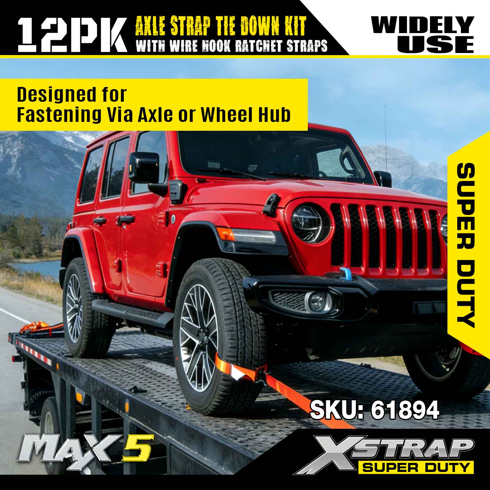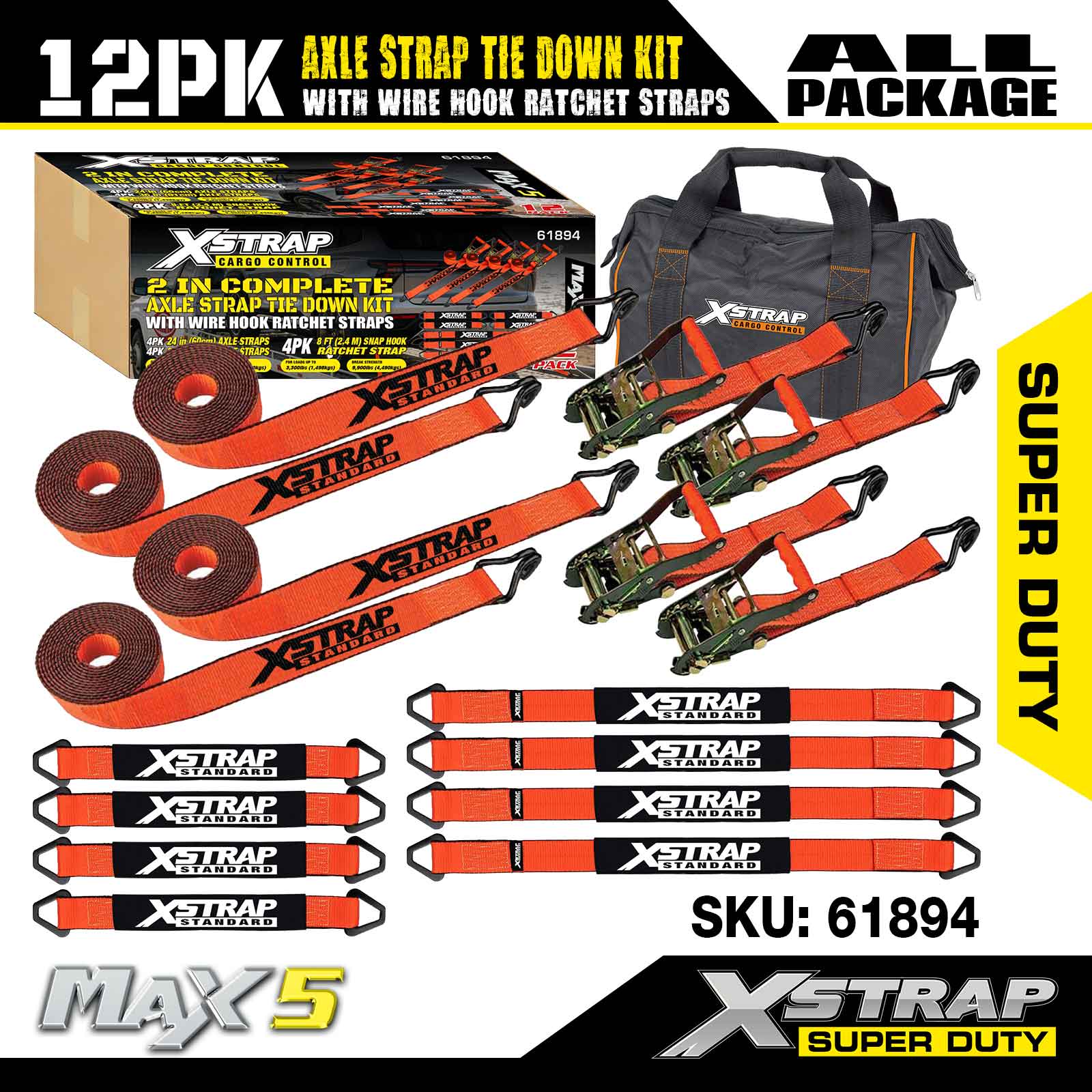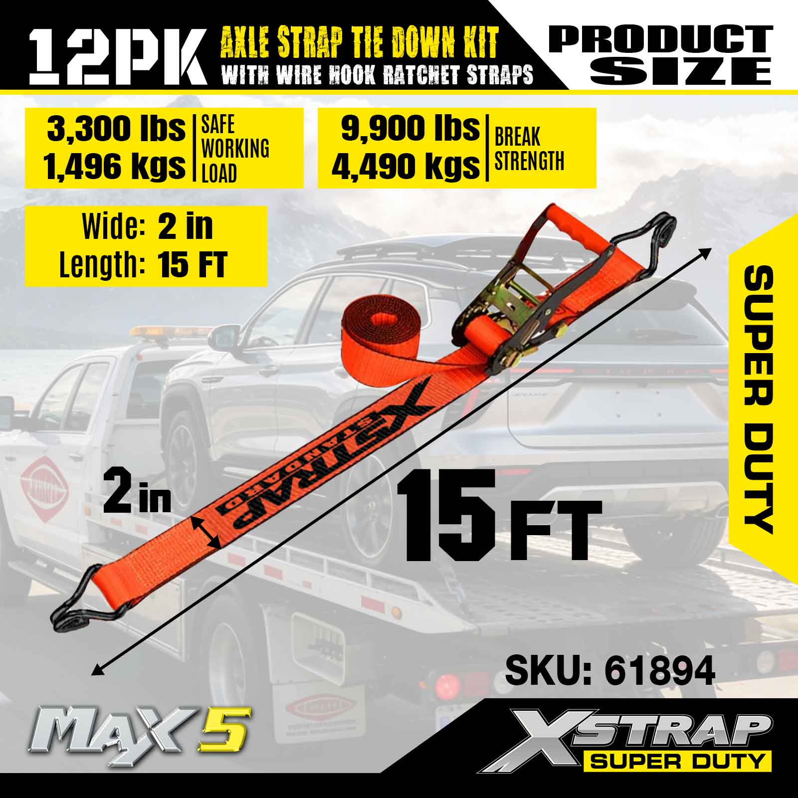 Xstrap 12PK pribor za pričvršćivanje remena za osovinu (sa žičanim remenima za zatvaranje kuke) – Super Duty. Ima sigurno radno opterećenje od 3,300 LBS (1,496 KG) i čvrstoću na prekid od 9,900 LBS (4,490 KG).