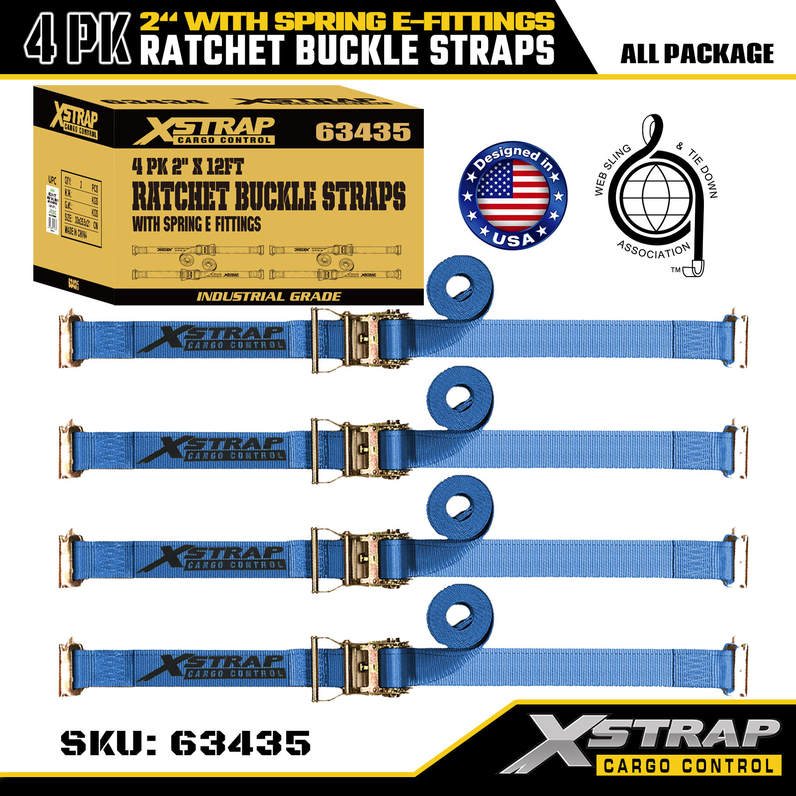 Xstrap 4 paketa traka za pričvršćivanje s čegrtaljkom, 2" x 12' poliesterskih traka za pričvršćivanje tereta s opružnim E-priključcima, 1467 lbs sigurno radno opterećenje (SWL) i 4401 lbs čvrstoća na kidanje, za kamione, kosilice, terenska vozila
