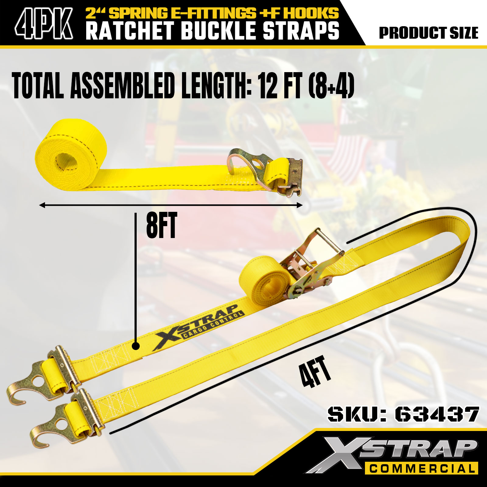 Xstrap 4 pakiranja traka za vezivanje s čegrtaljkom, 2" x 12' Poliester visoke čvrstoće s opružnim E priključcima i F kukama, 733 lbs vezice za teške terete za prikolice, kamione, kombije i motocikle