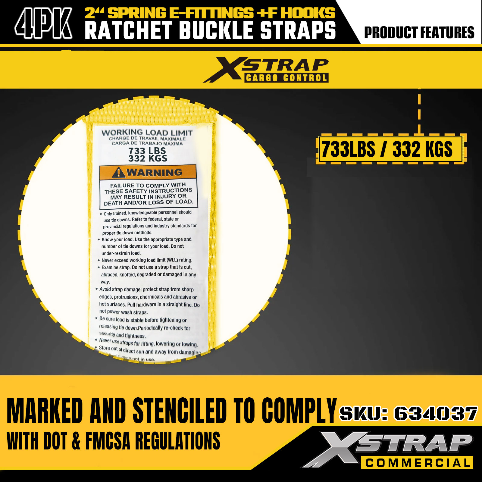 - Jasne oznake nosivosti: Svaki remen je jasno označen sa 733 lbs sigurnog radnog opterećenja (SWL) i 2199 lbs prekidne čvrstoće, pružajući kritične sigurnosne smjernice kako bi se osigurala ispravna i sigurna kontrola tereta.