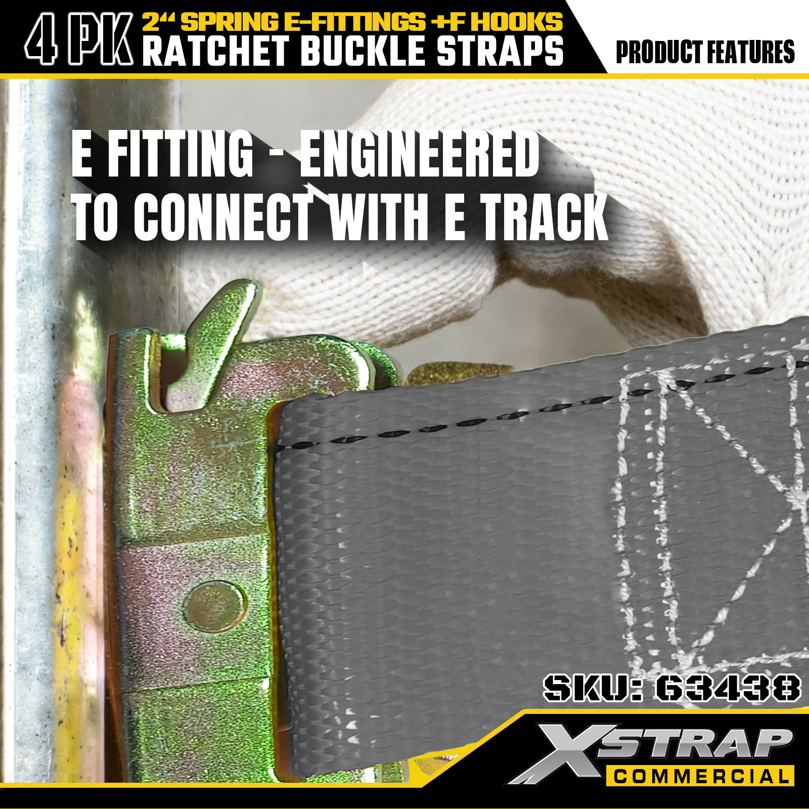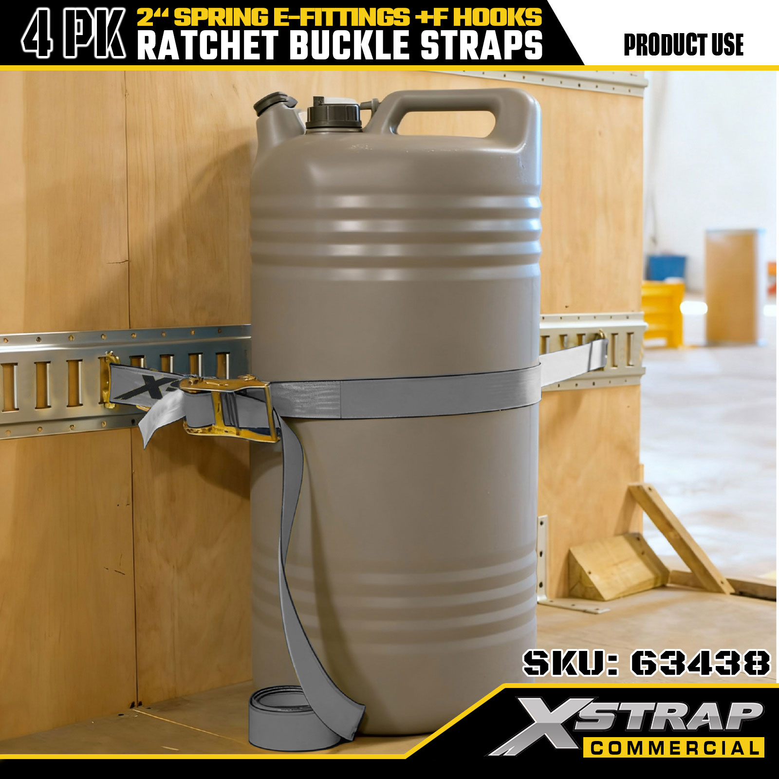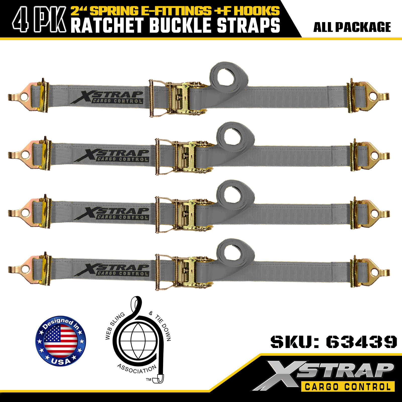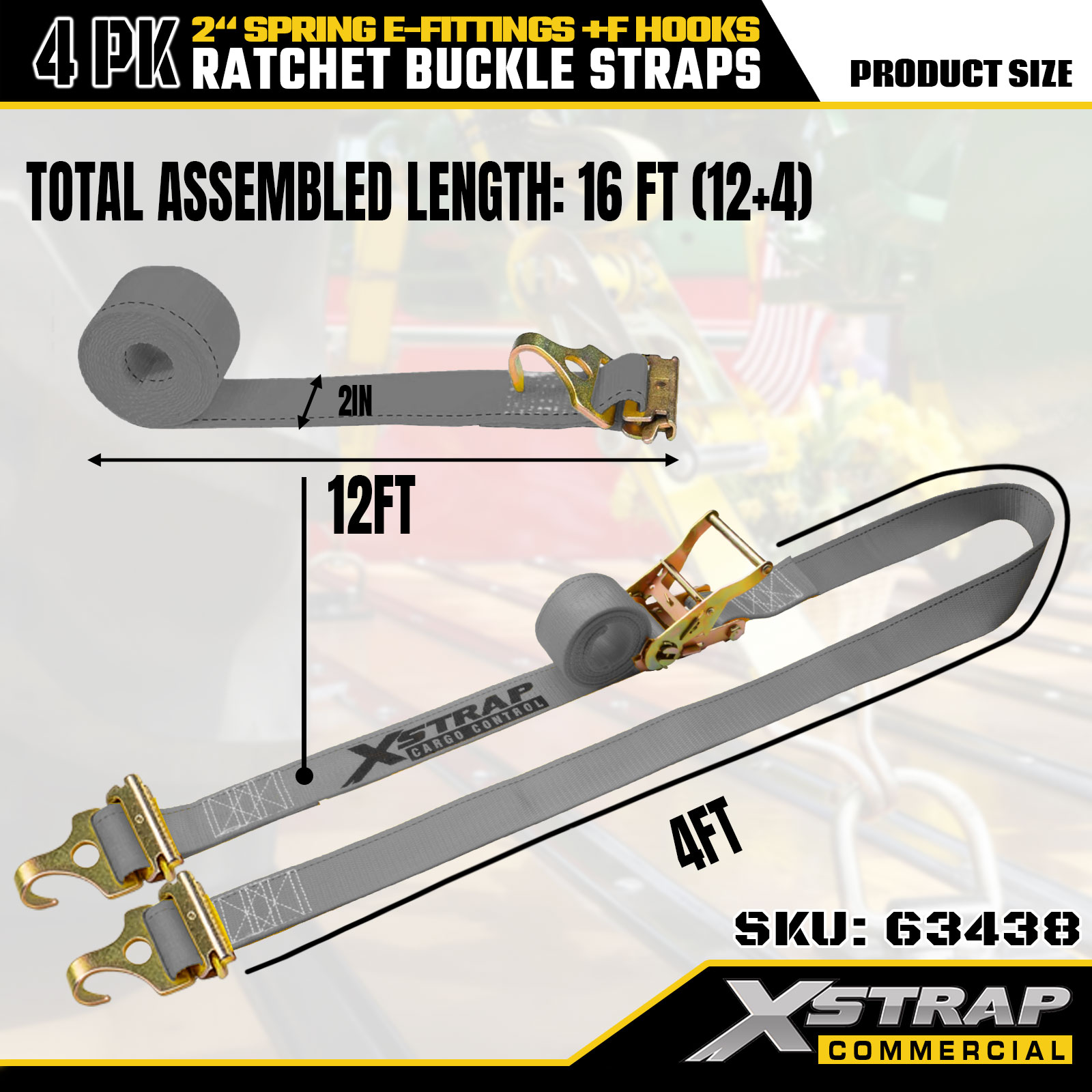 Xstrap 4 pakiranja 2" x 16" trake za pričvršćivanje s čegrtaljkom - sivi poliester s opružnim E-priključcima i F kukama, 733 lbs SWL za selidbe, kamione i prijevoz općeg tereta