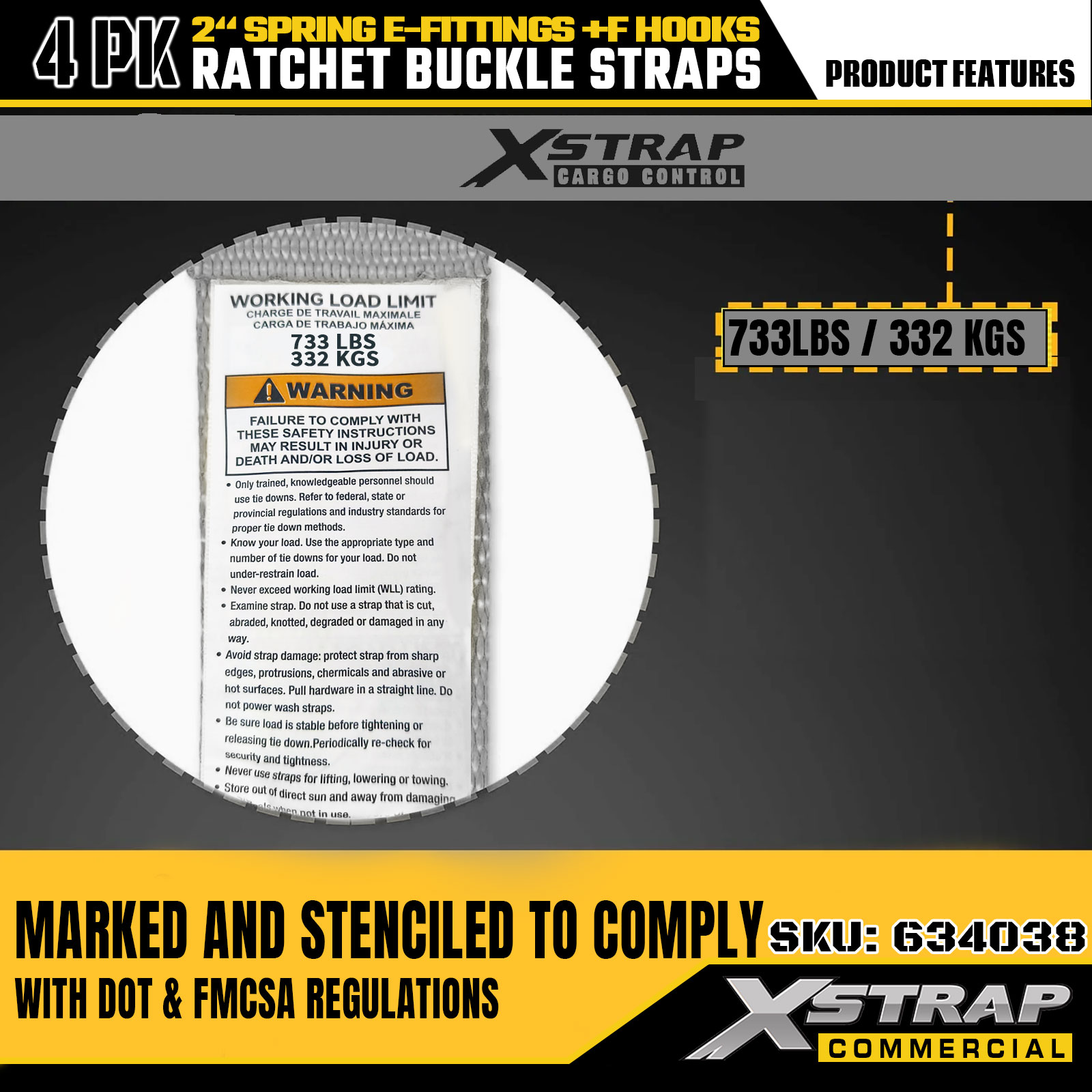 - Jasne sigurnosne oznake: Svaki remen označen je s 733 lbs SWL i 332 lbs prekidne čvrstoće, pružajući bitne sigurnosne smjernice za izbjegavanje preopterećenja. Sigurno za pričvršćivanje kutija, namještaja, uređaja itd.