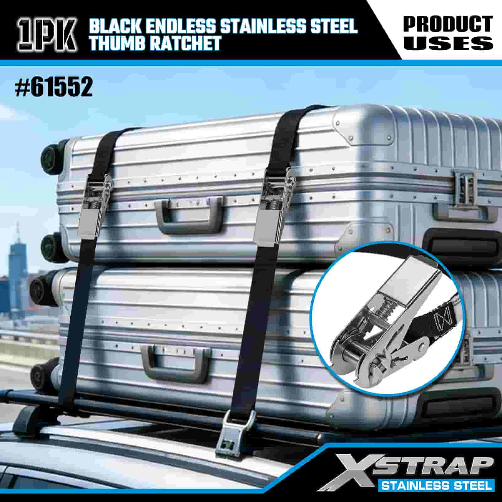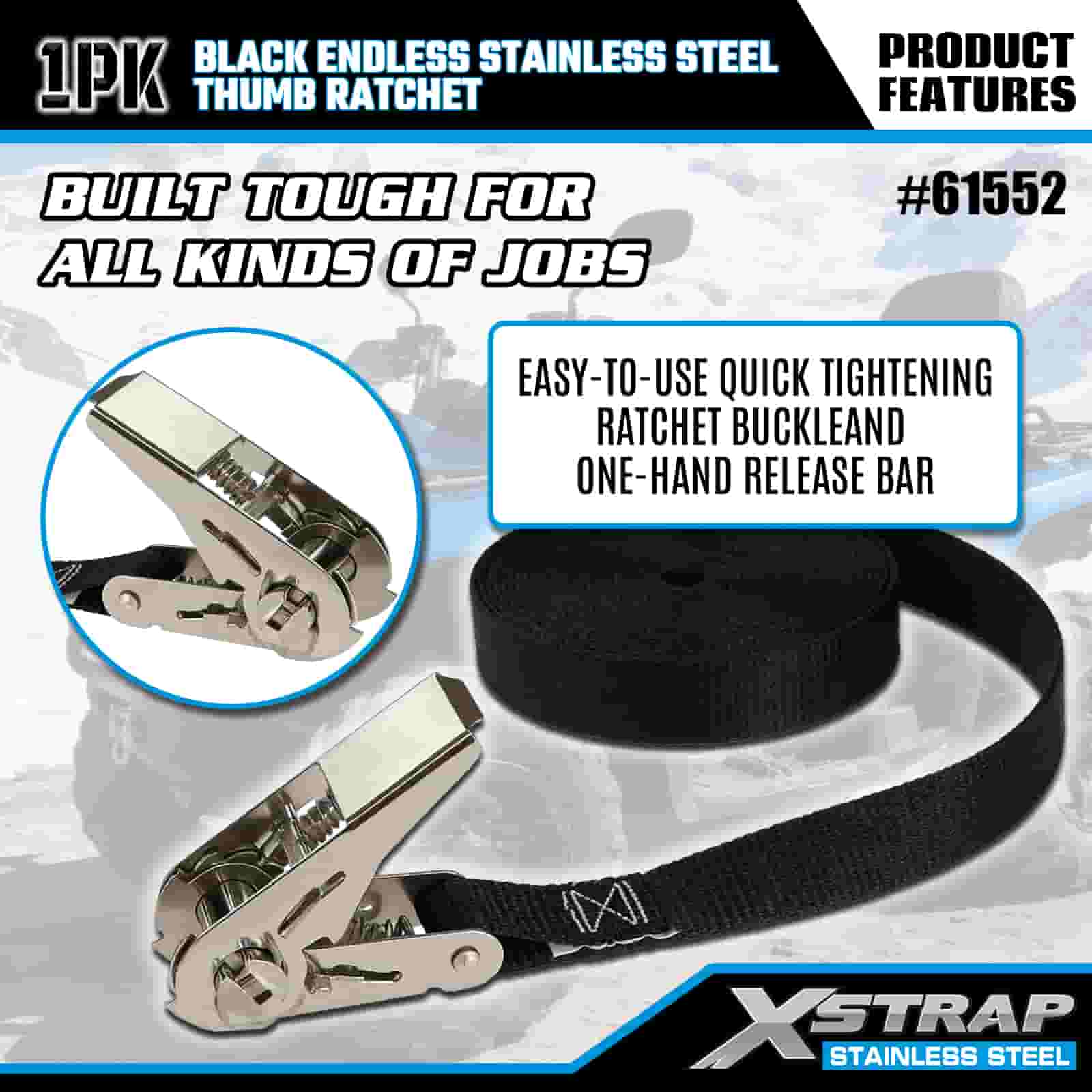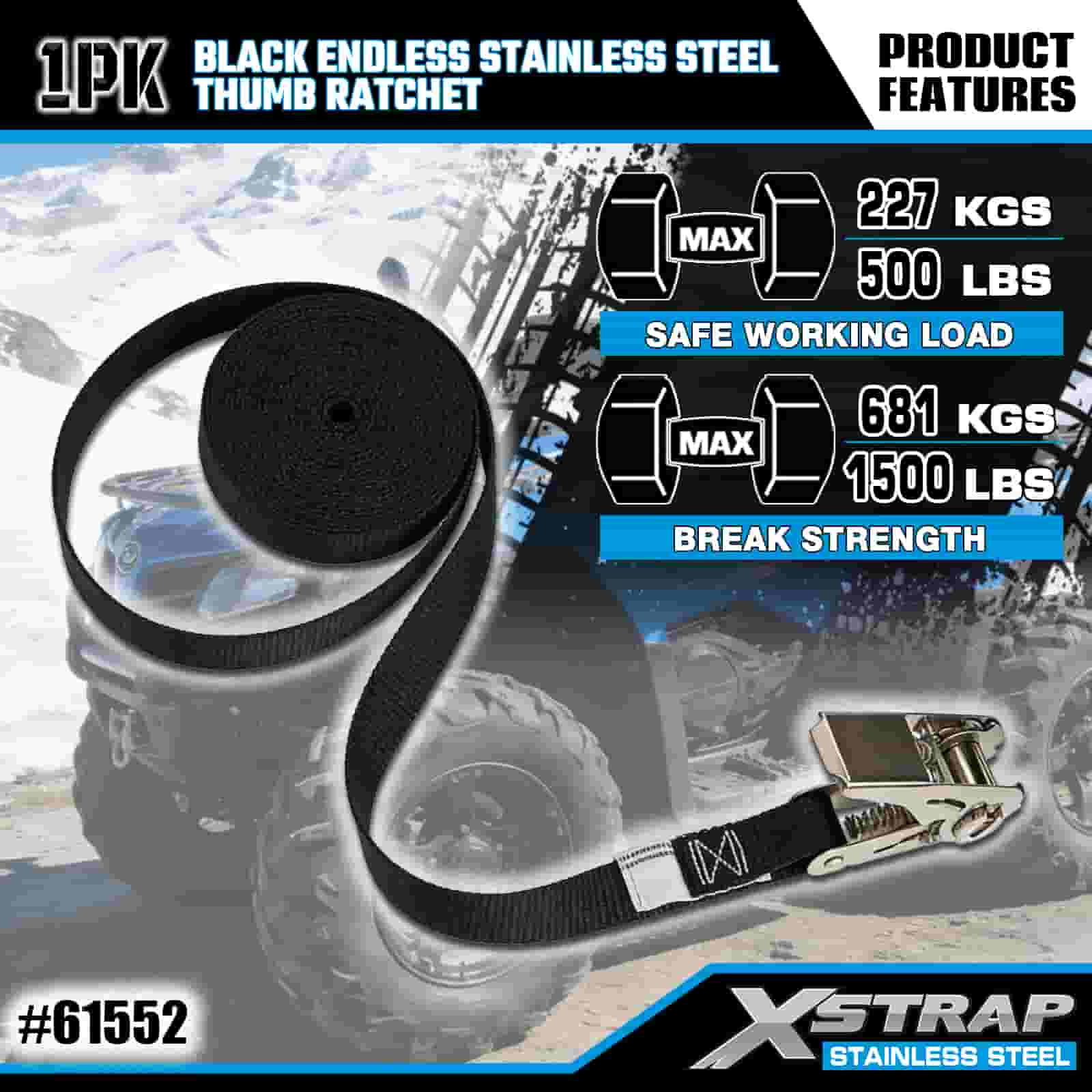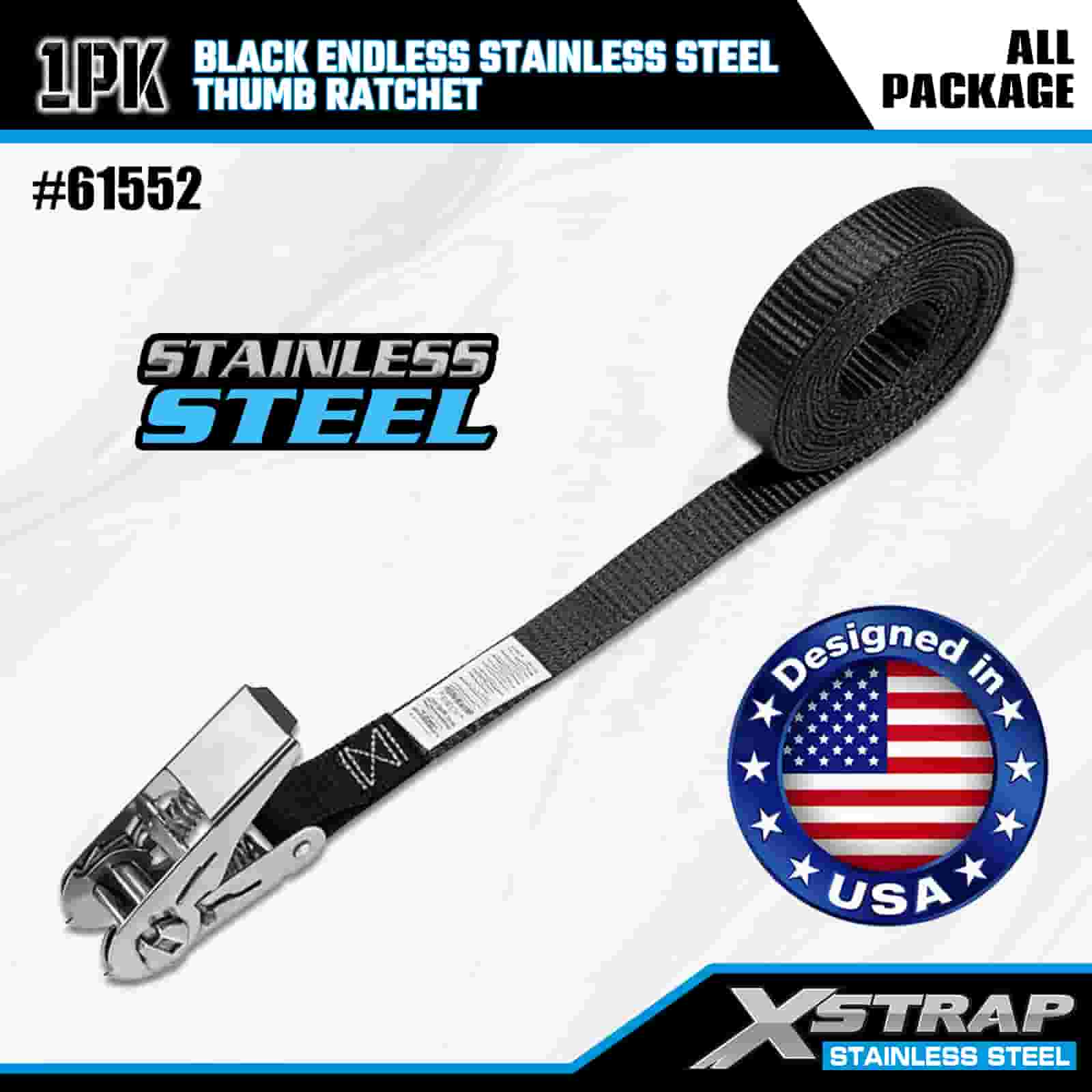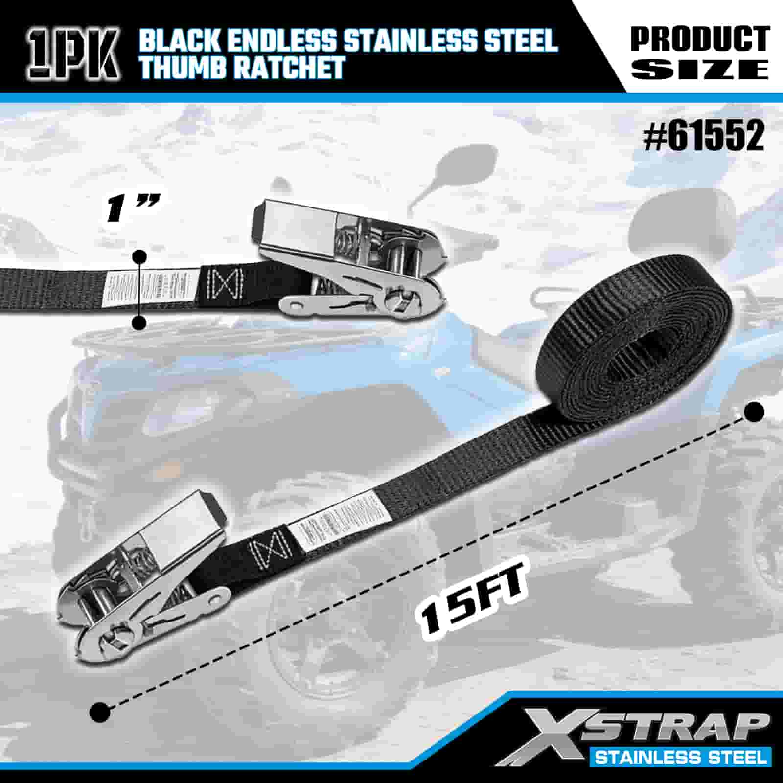 Xstrap crna beskonačna čegrtaljka od nehrđajućeg čelika, 1” x 15’ poliesterska traka za vezivanje, traka za pričvršćivanje tereta kapaciteta 500 lbs za prikolicu, prikolicu s ravnim krevetom, skijaški čamac, mali automobil, tešku opremu.