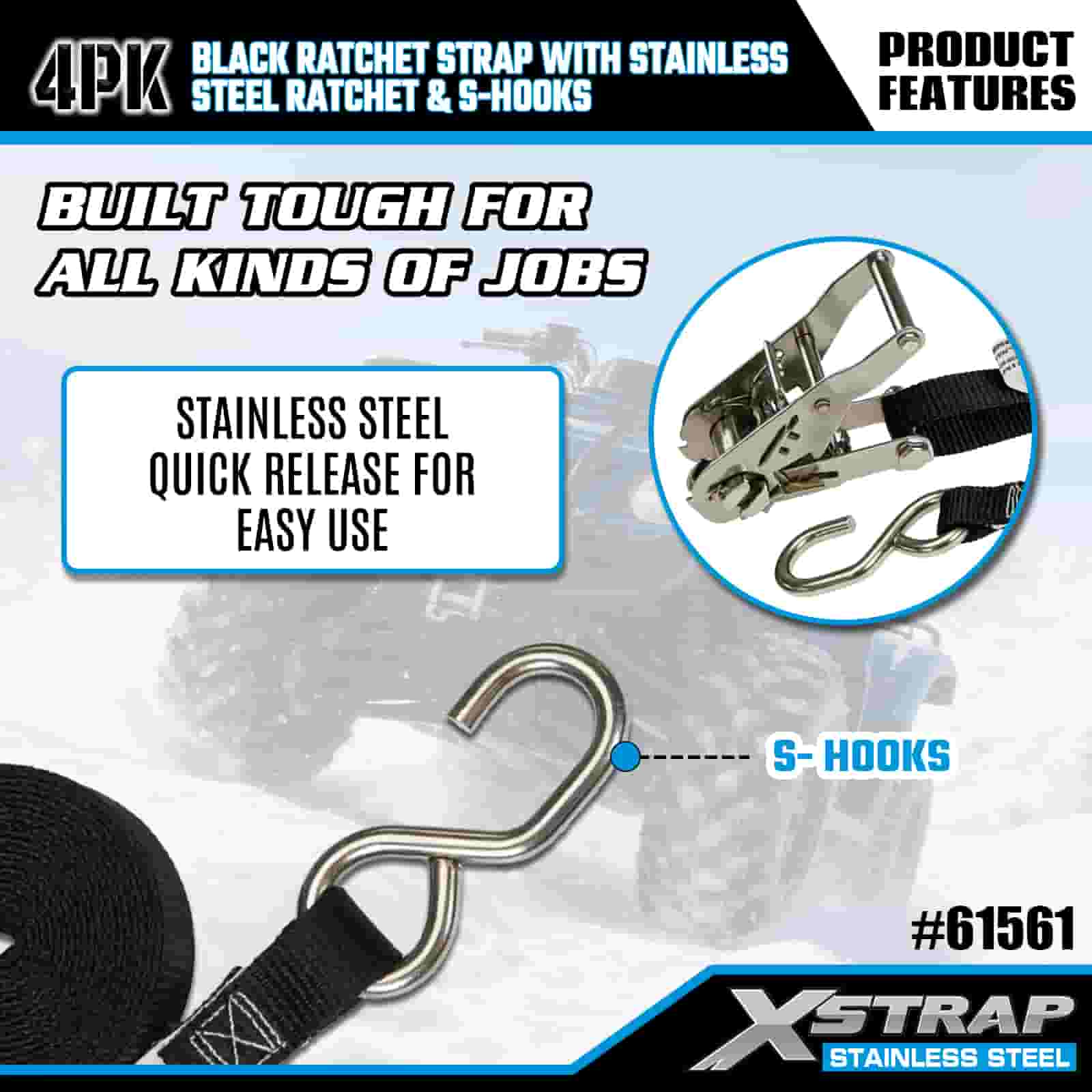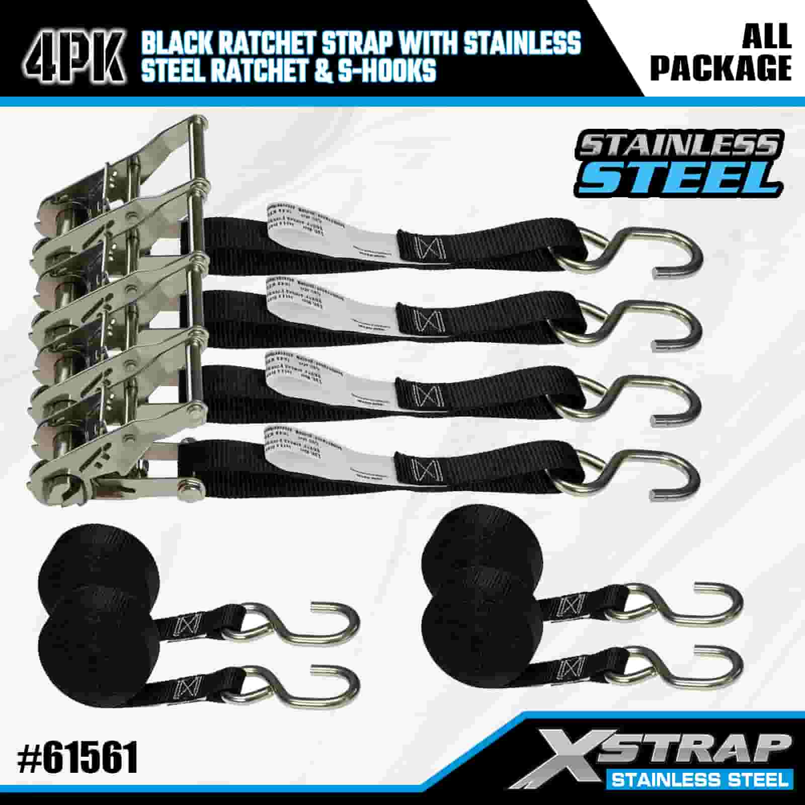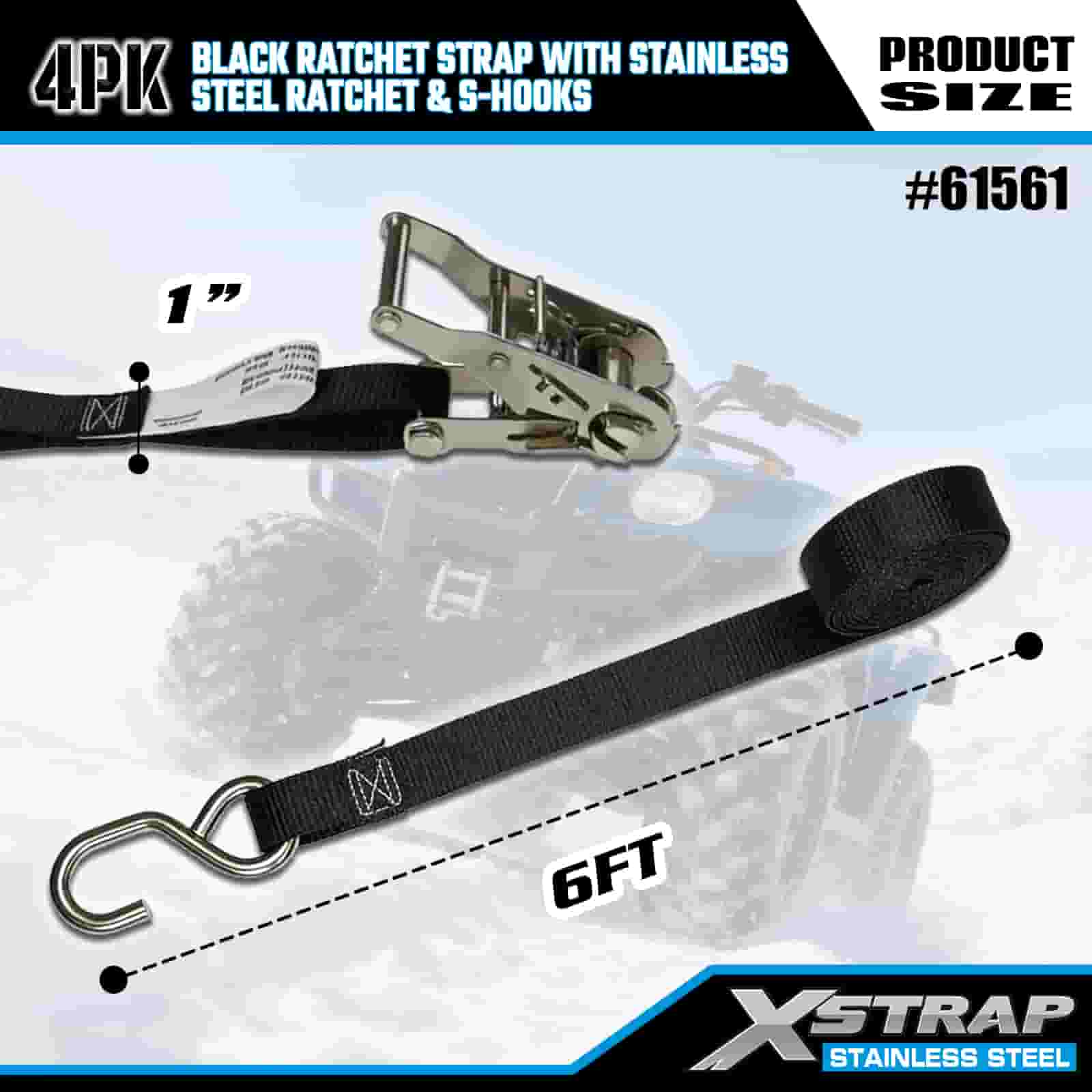 Xstrap 4PK crni remen s čegrtaljkom s čegrtaljkom od nehrđajućeg čelika i S kukama, 1” x 6’ poliesterski remen za vezivanje s čegrtaljkom, trake za pričvršćivanje tereta nosivosti 400 lbs sa S kukama za prikolicu, prikolicu s ravnim krevetom, skijaški čamac, mali automobil, tešku opremu.