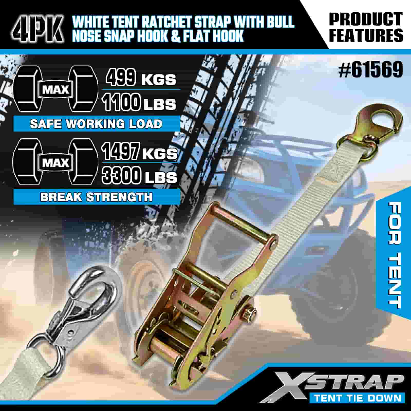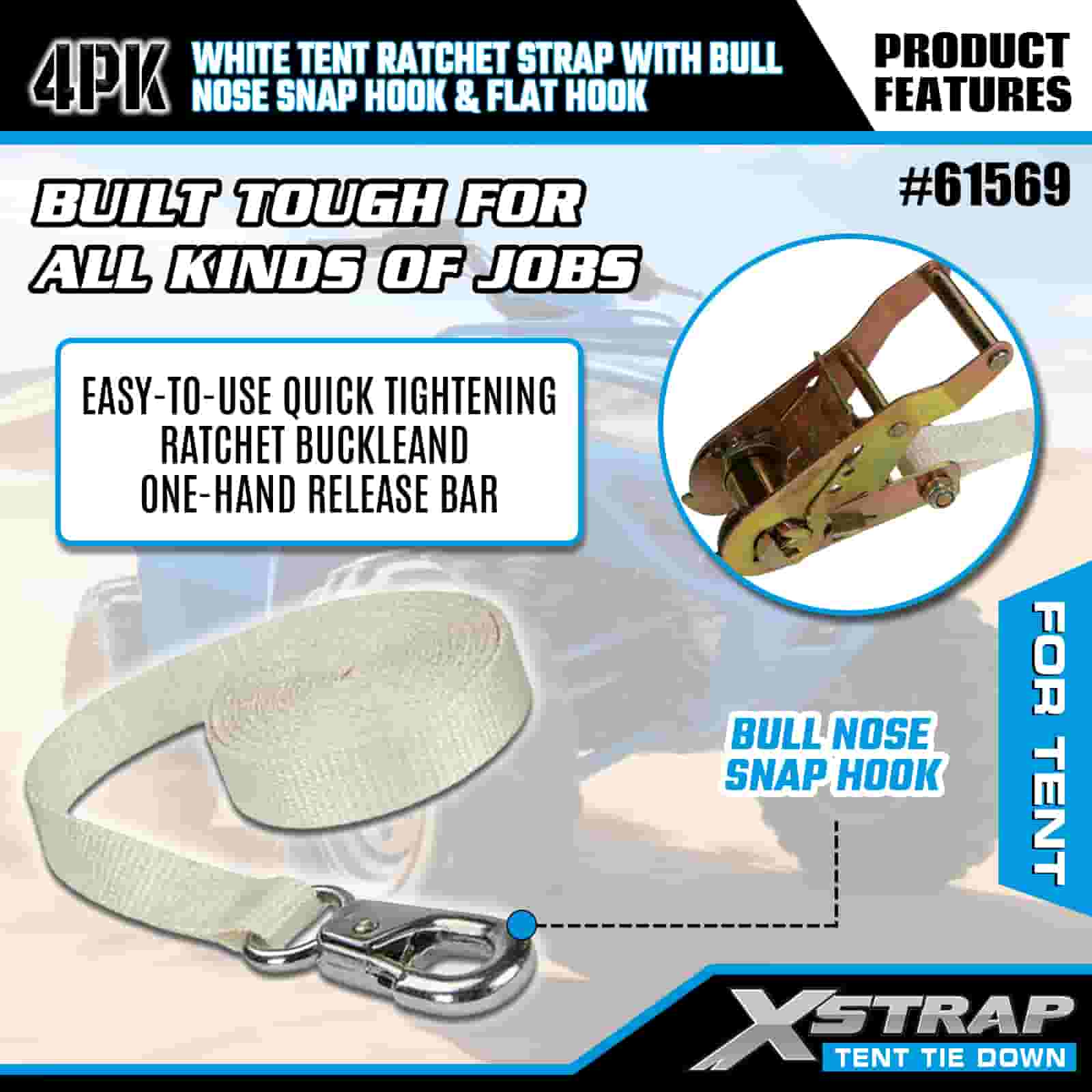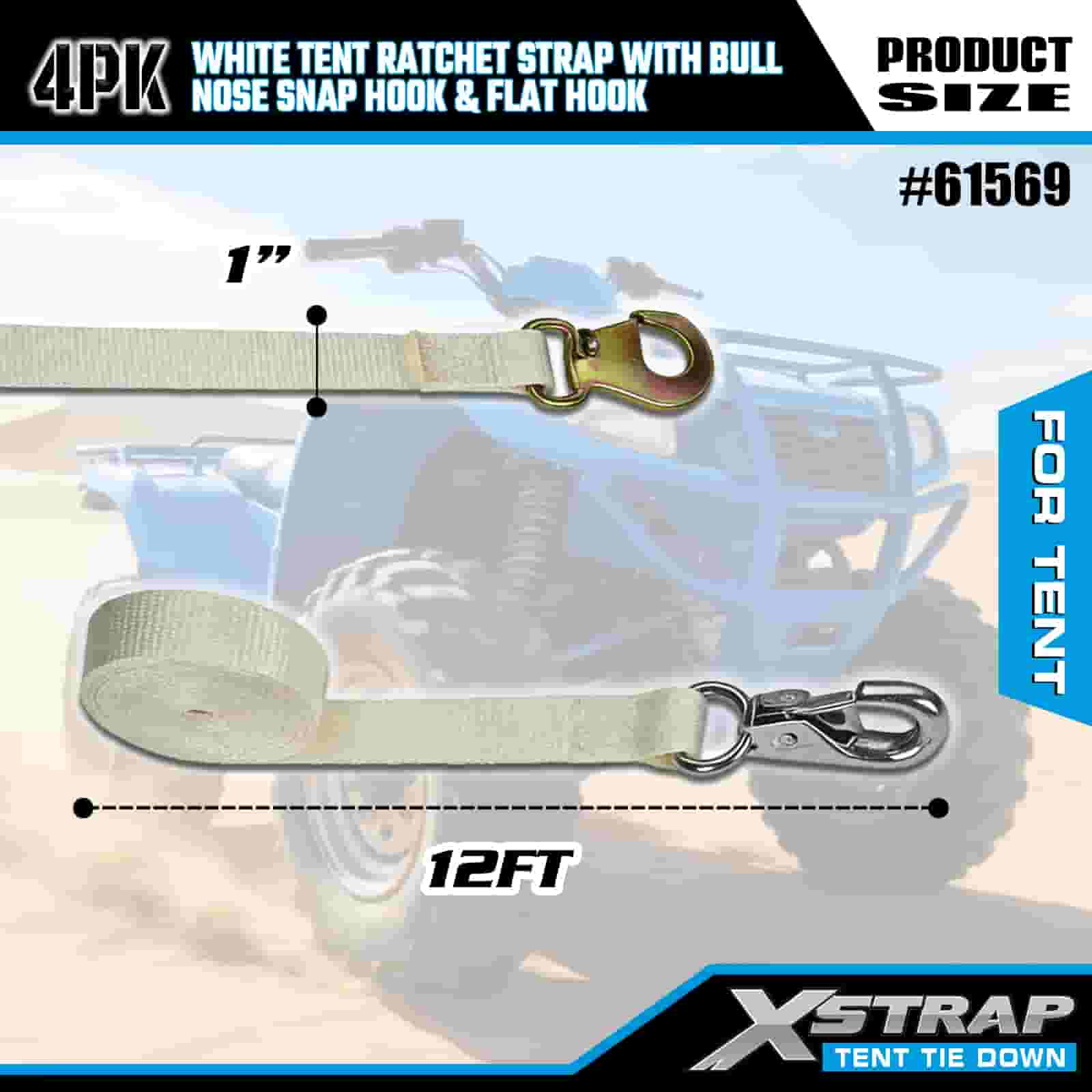 Xstrap 4PK bijeli remen s čegrtaljkom za šator s karabinom i ravnom kukom, 1” x 12’ poliesterski remen za vezivanje remen s čegrtaljkom, trake za pričvršćivanje tereta kapaciteta 1100 lbs s karabinom i ravnom kukom za kontrolu tereta, pričvršćivanje za šator.