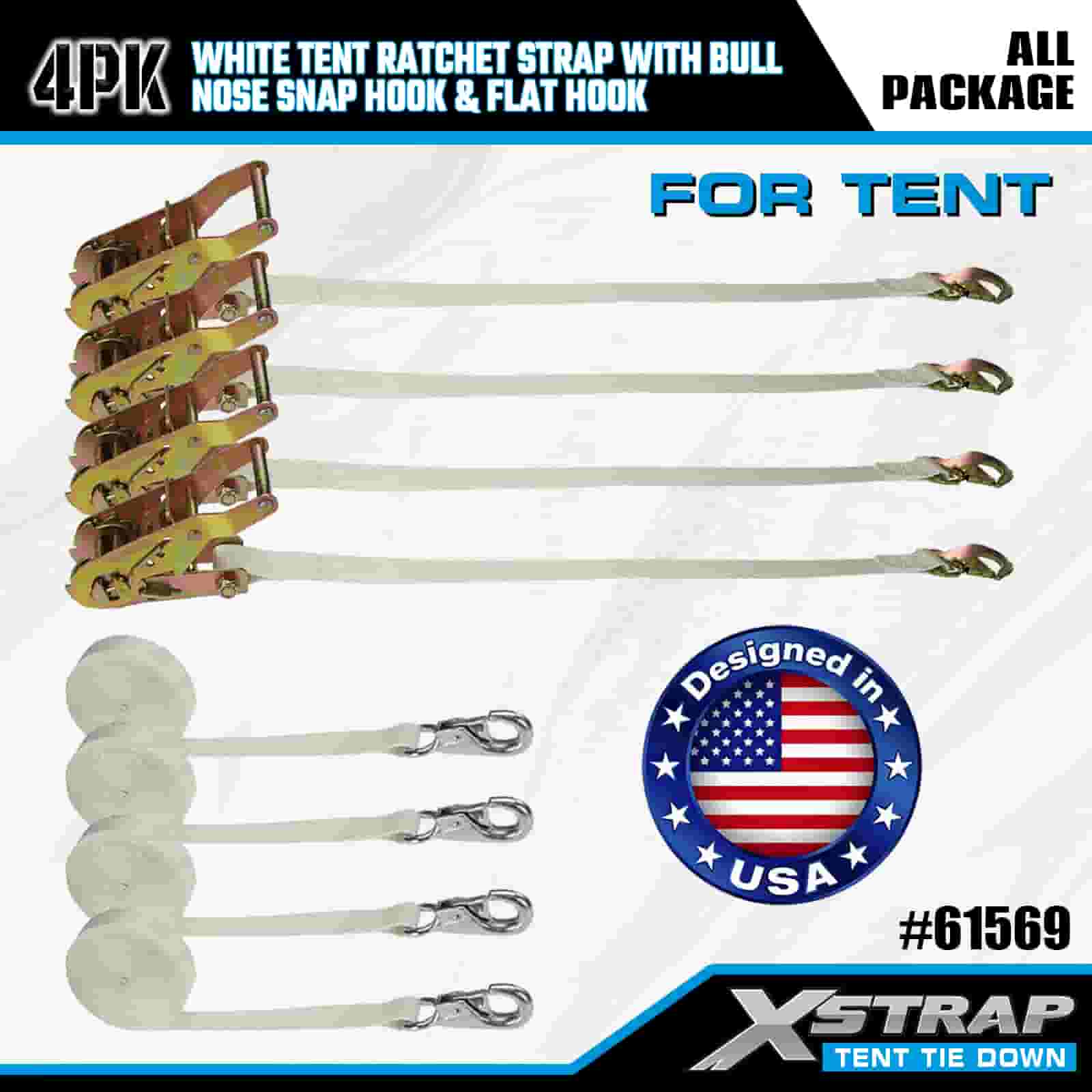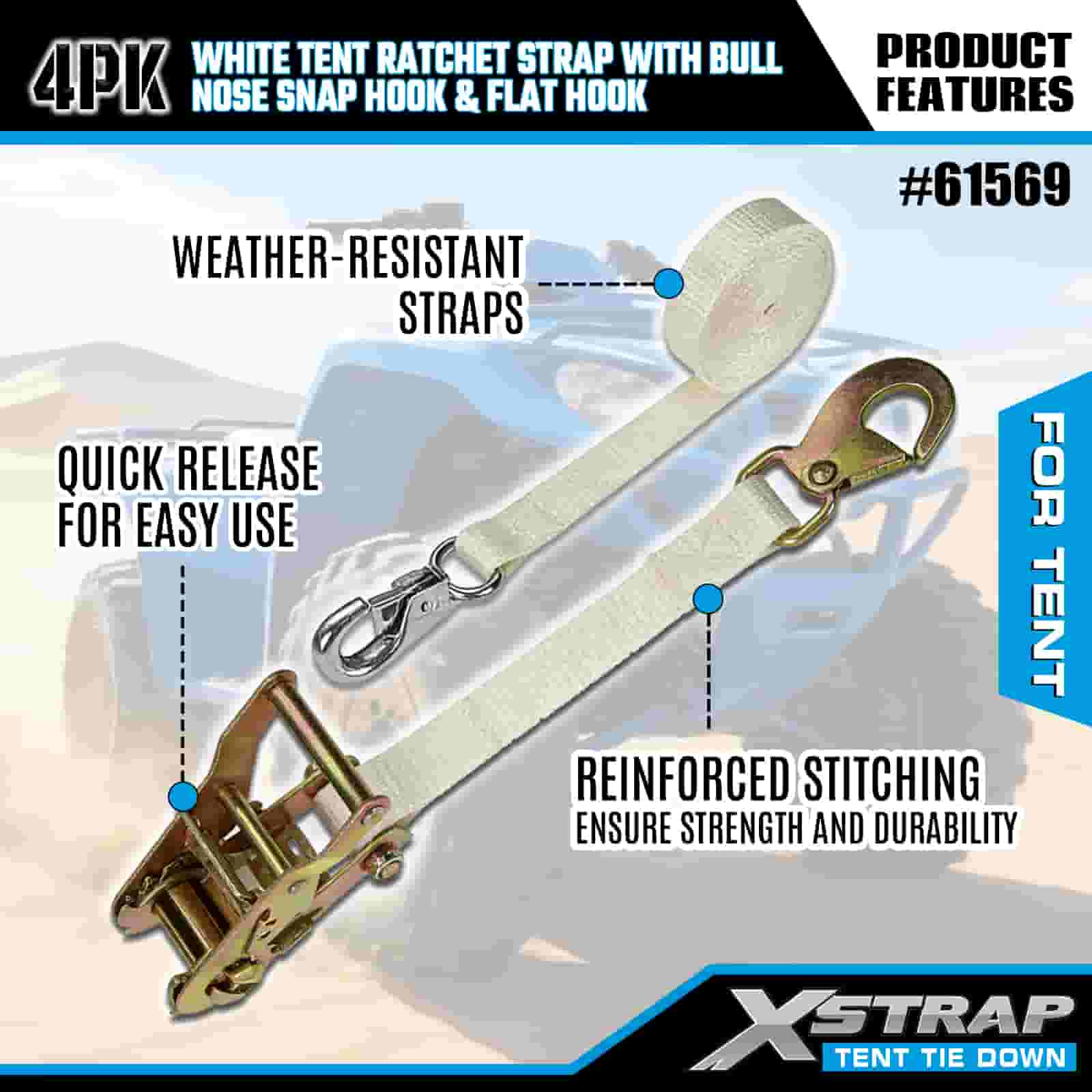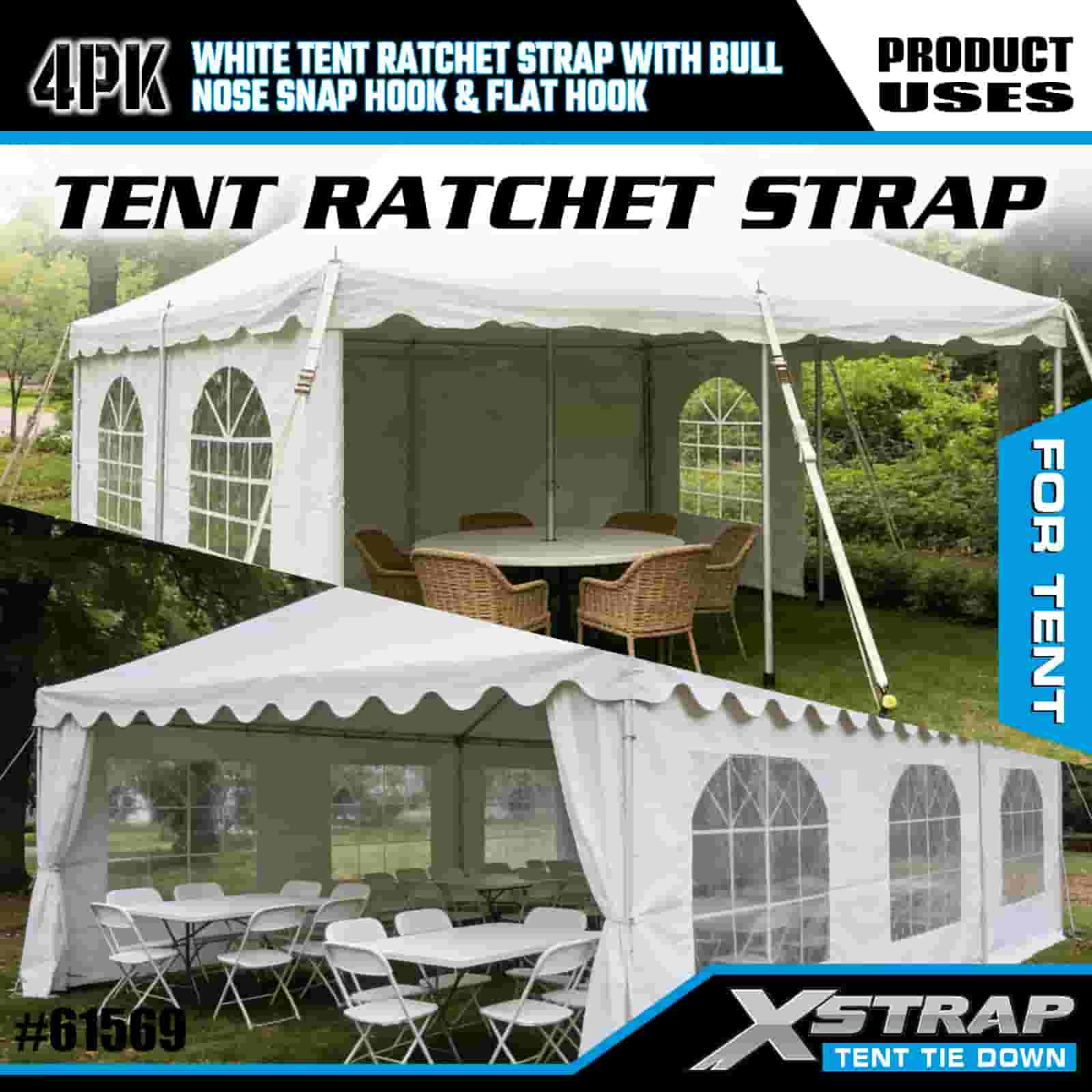 Xstrap 4PK bijeli remen s čegrtaljkom za šator s karabinom i ravnom kukom, 1” x 12’ poliesterski remen za vezivanje remen s čegrtaljkom, trake za pričvršćivanje tereta kapaciteta 1100 lbs s karabinom i ravnom kukom za kontrolu tereta, pričvršćivanje za šator.