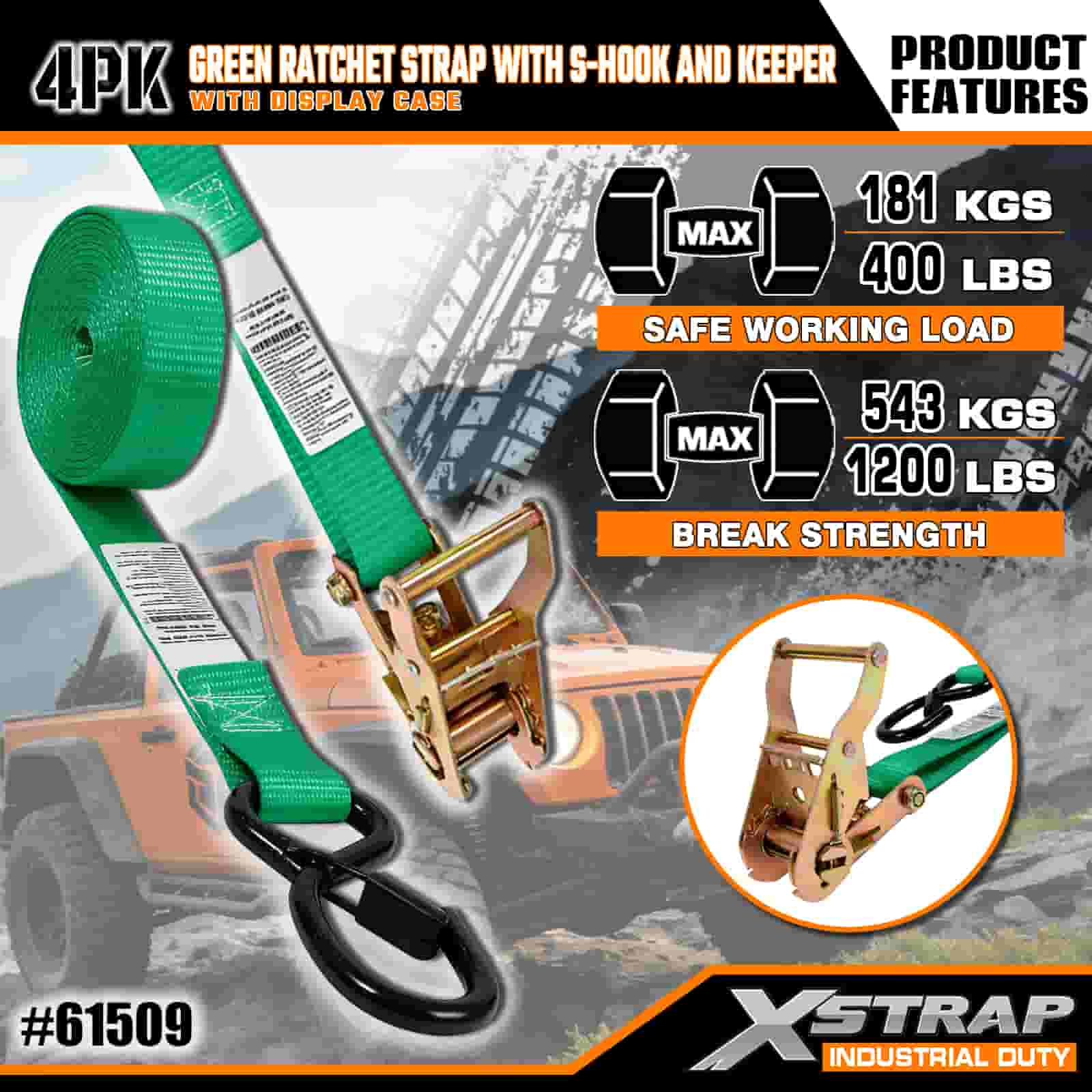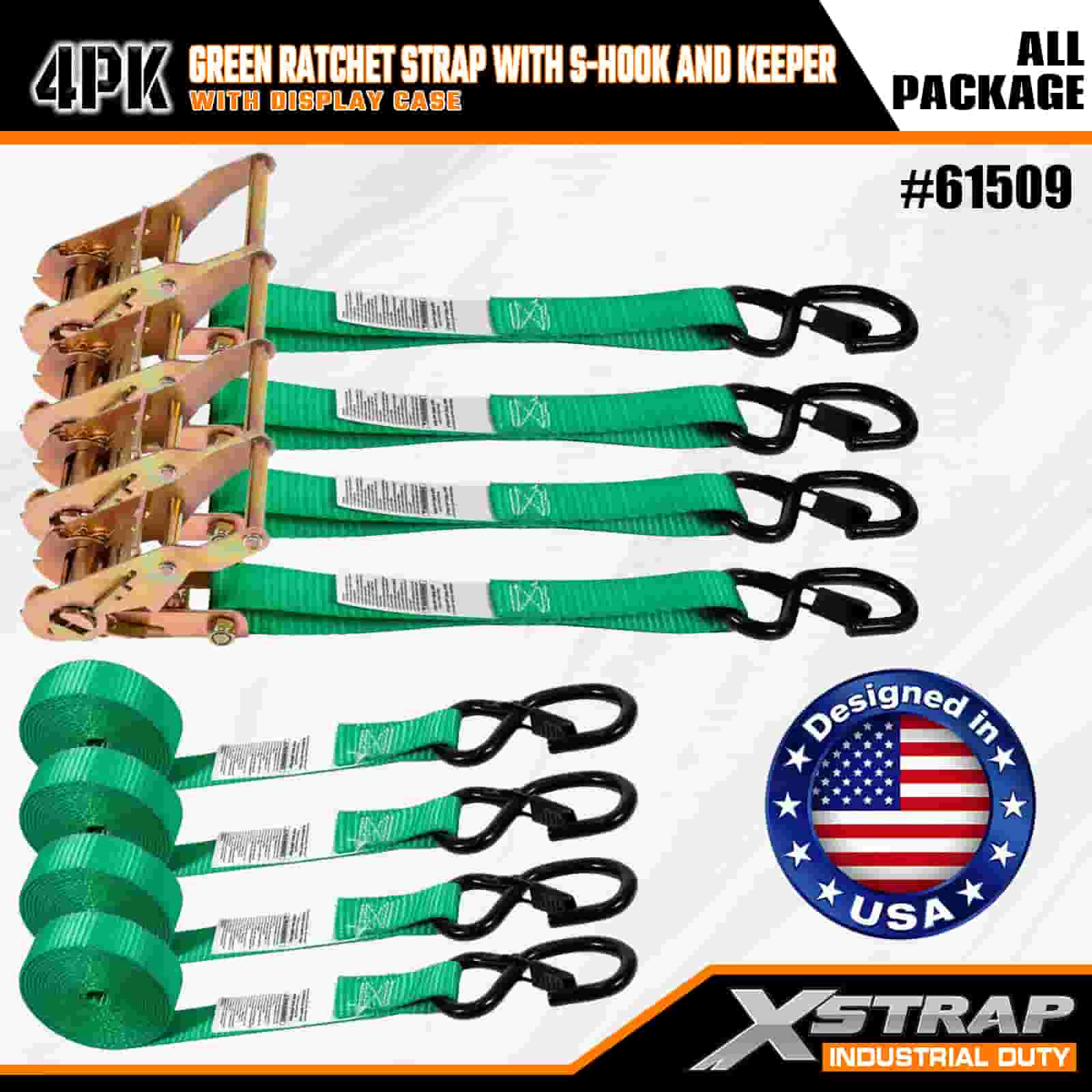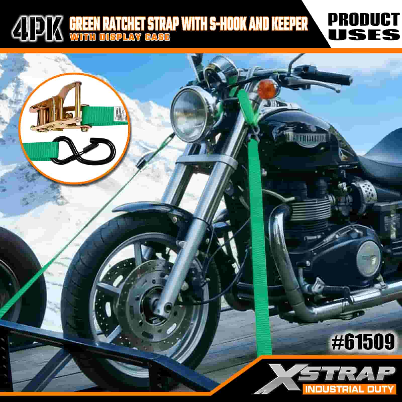 - Paket od 4 komada s organiziranom pohranom: Prodaje se kao set s 4 remena (u izložbenom pakiranju) s ugrađenim kalemima za pohranu za uredno držanje. S dimenzijama od 1 inča širine × 15 stopa duljine, idealan je za pričvršćivanje motocikala, vanjske opreme i općeg tereta.