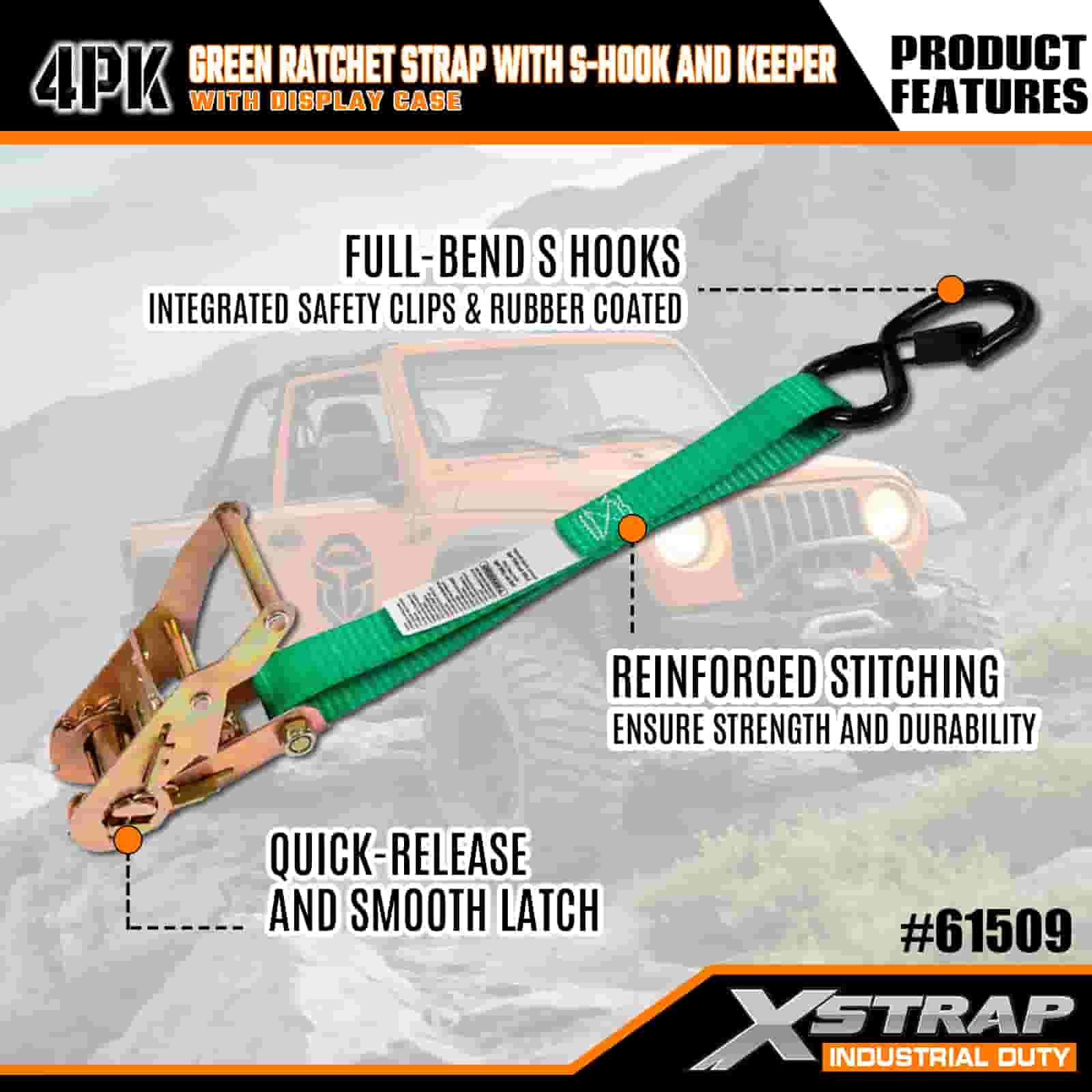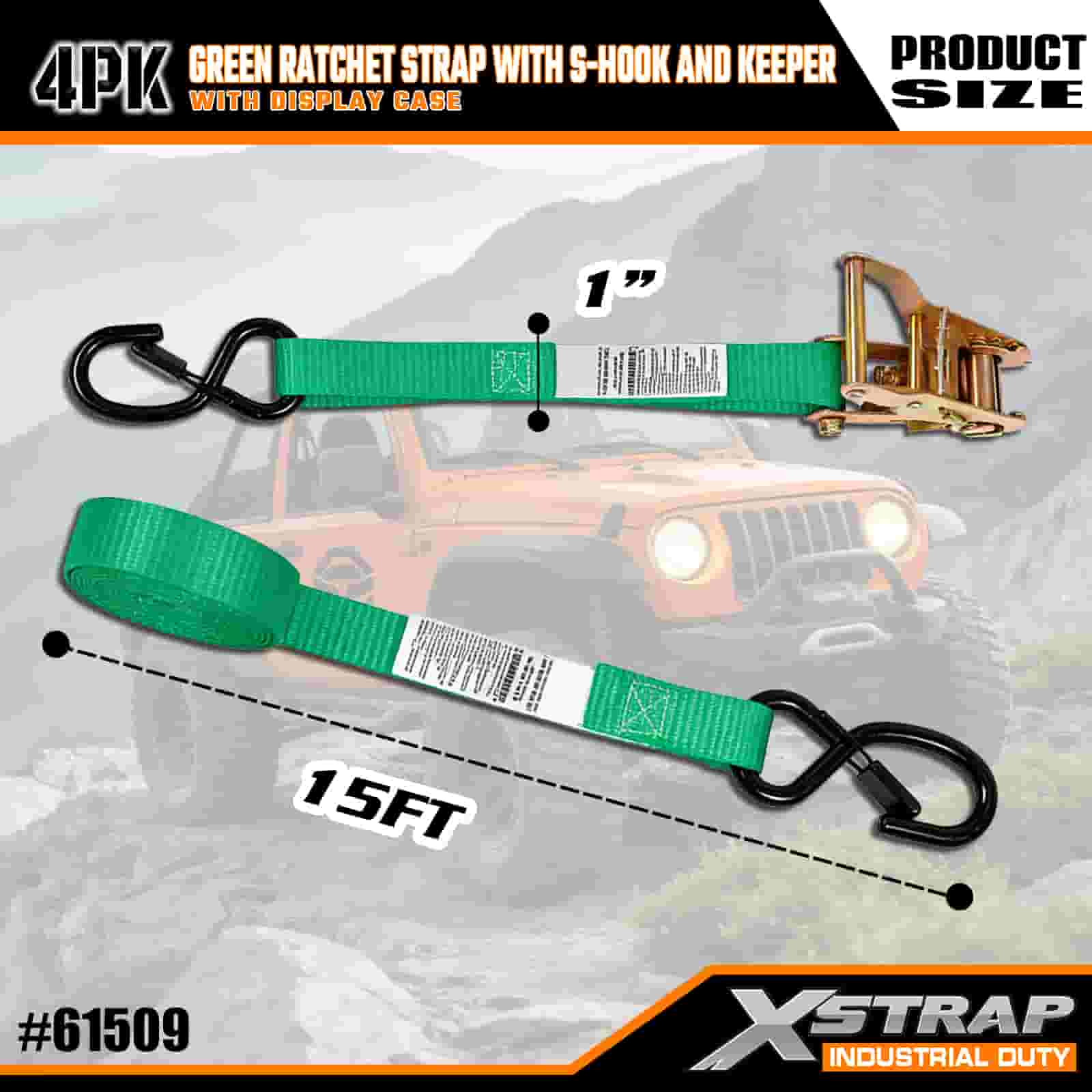 Xstrap 4 pakiranja remena sa čegrtaljkom sa sigurnosnim S kukama, 1” x 15’ poliesterski remen za vezivanje Pull Ratchet remen, pričvrsne trake za pričvršćivanje tereta kapaciteta 400 lbs sa sigurnosnim S kukama za ozbiljnog profesionalca za pričvršćivanje teretne prikolice, prikolice s ravnim krevetom, skijaškog čamca, malog automobila.