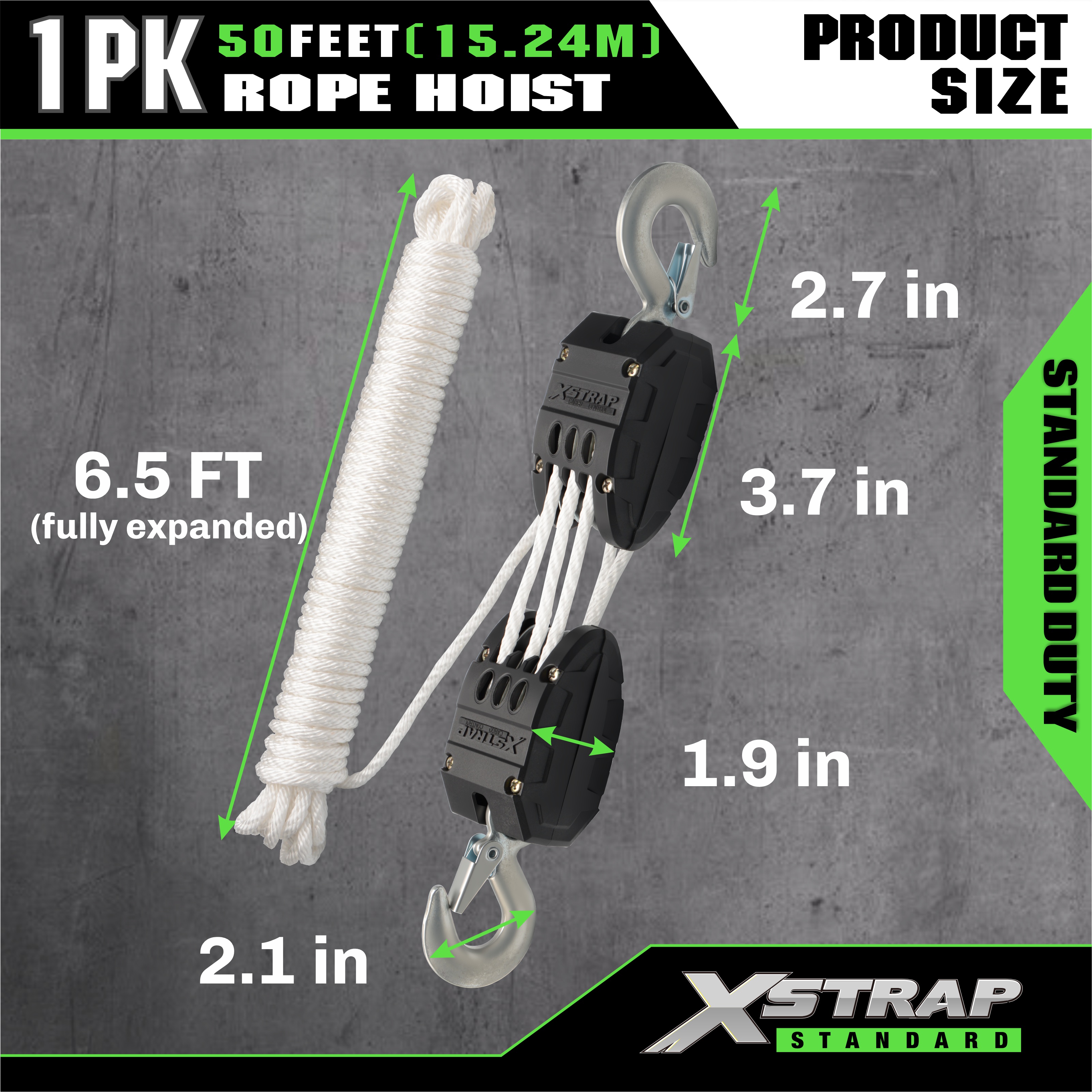Ovo je Xstrap standardni sustav remenica za dizalicu s užetom. Kapacitet je 1000 lbs, čvrstoća na prekid je 2000 lbs. Snaga podizanja 5:1 50ft Teški koloturnik za lov, podizanje teških predmeta s radnim rukavicama protiv klizanja, 2 komada mekih petlji.