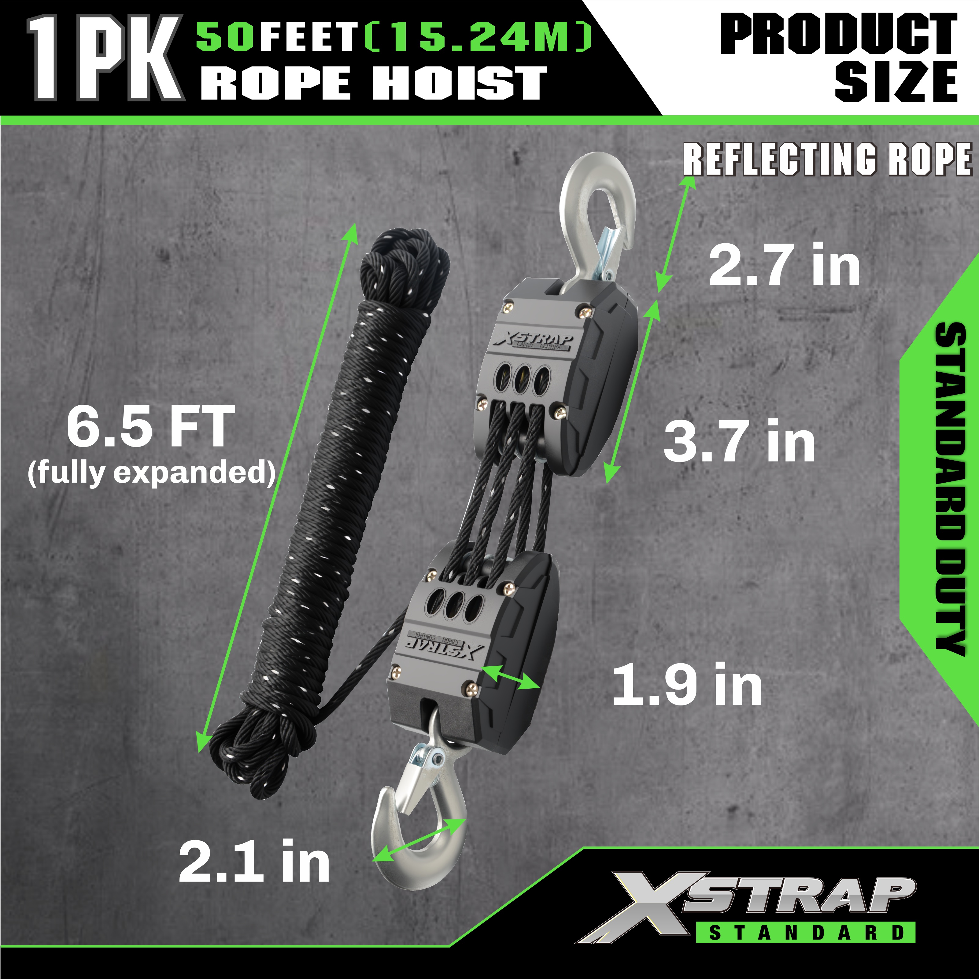 Ovo je XSTRAP STANDARD 2000 LB reflektirajuća remenica za dizalicu s užetom za teške uvjete rada. Dizajniran je s blokom kotača od 50 stopa i sustavom hvatanja. A u ovom setu također ima 2pk mekanih petlji od 18 inča i 1 par radnih rukavica.