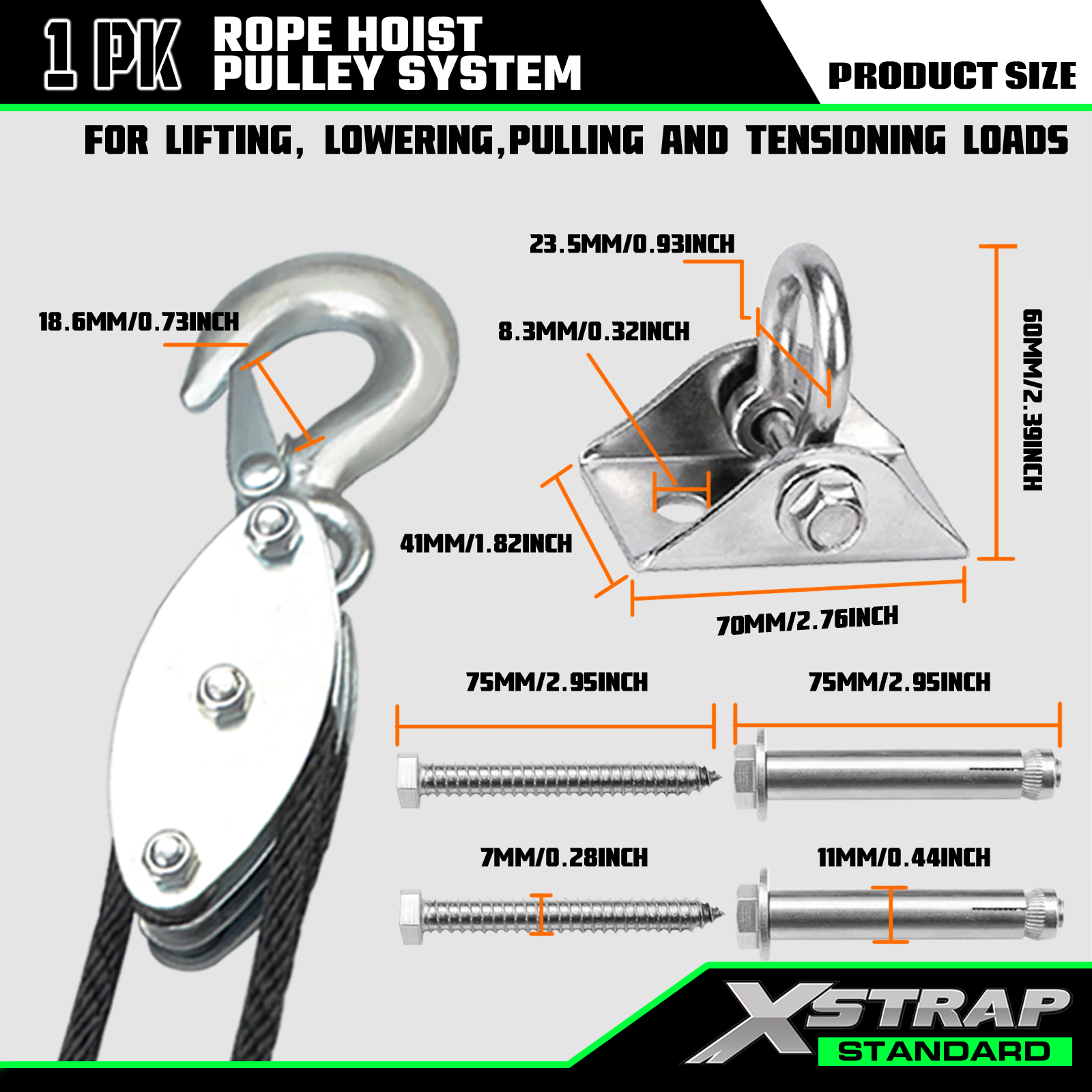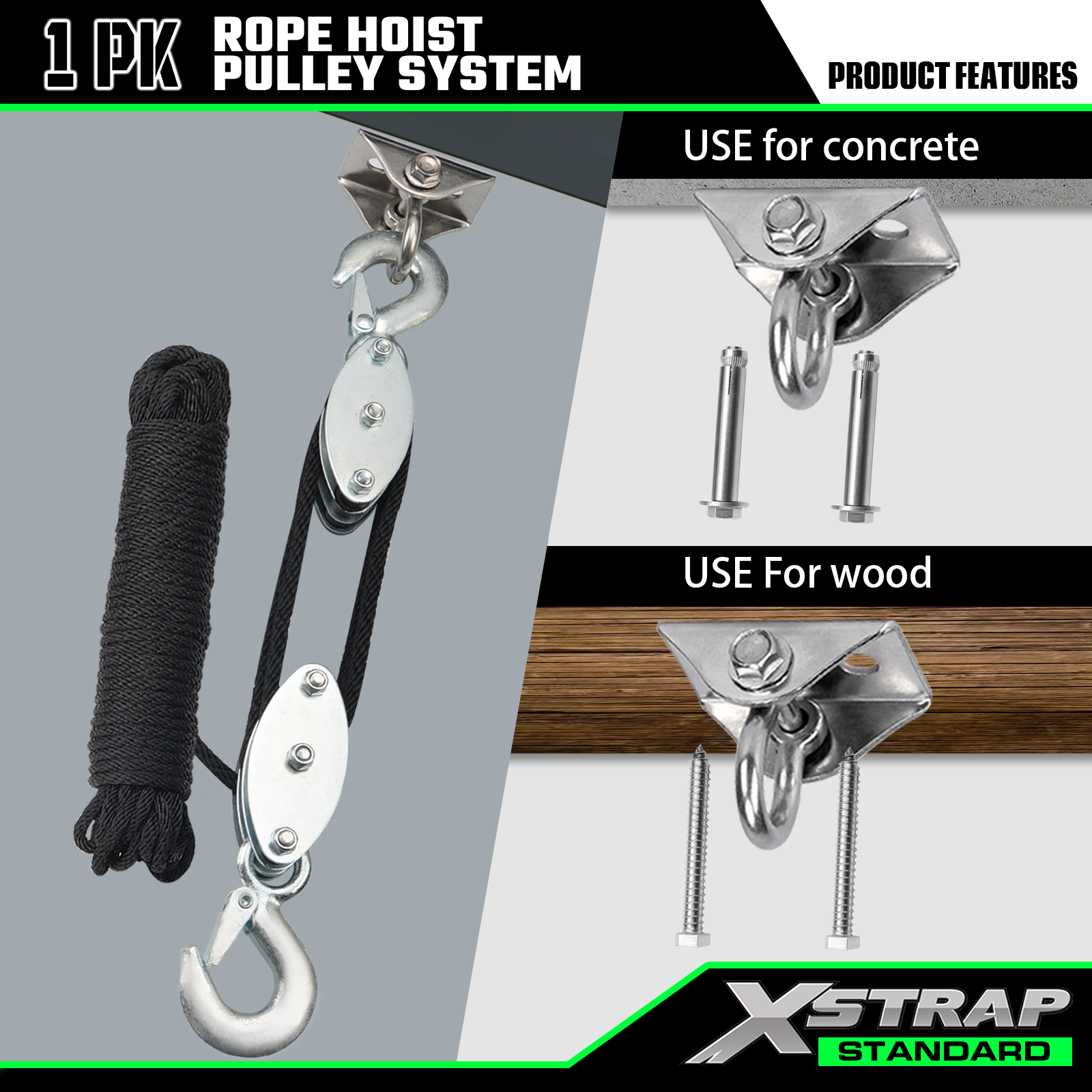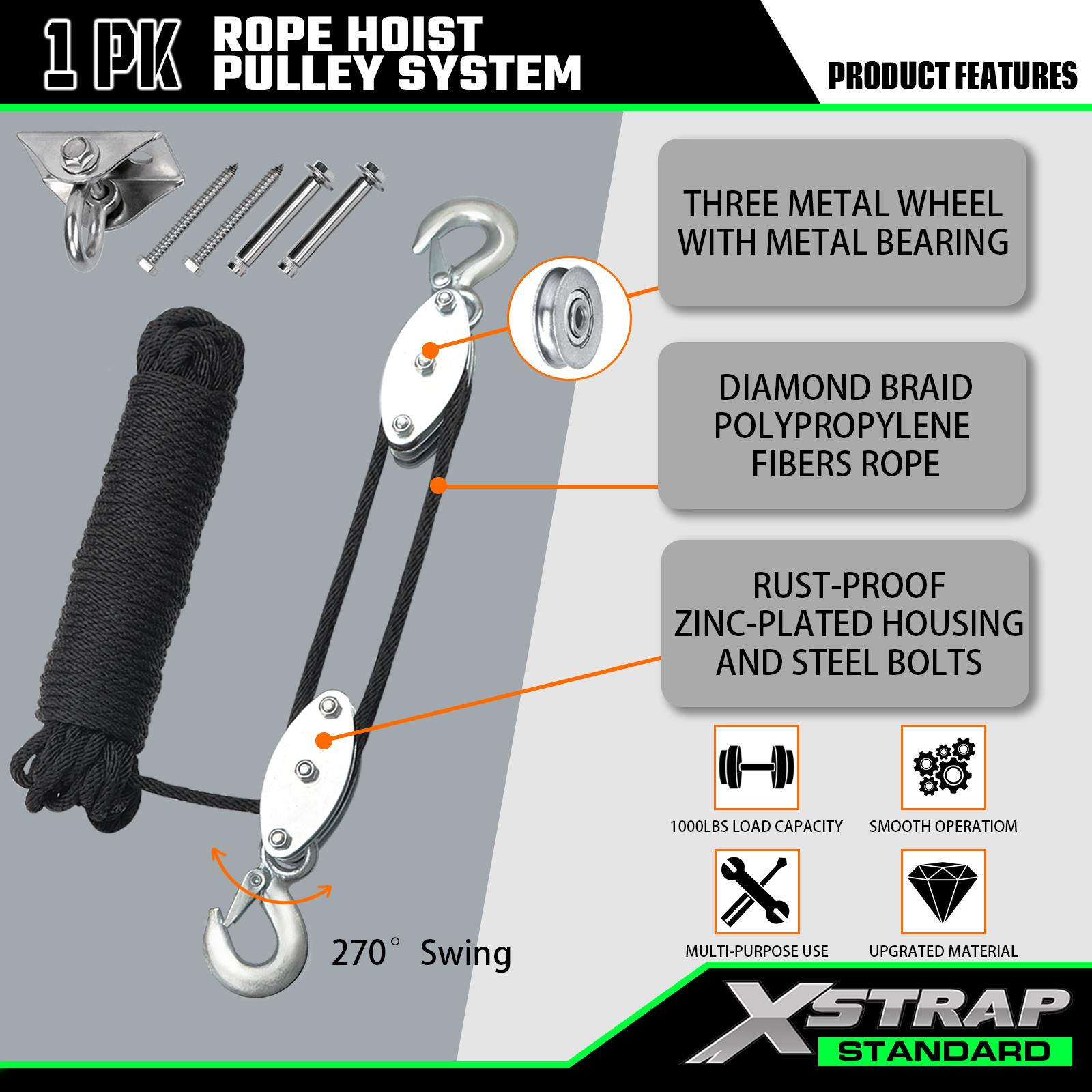 - Kapacitet velikog opterećenja: sigurno radno opterećenje je 1000 lbs, a čvrstoća na prekid je 2000 lbs. Dizalica s užetom može pomoći pri dizanju teških i lakih predmeta u isto vrijeme. Nema razloga za brigu o oštećenjima zbog prekomjernog opterećenja.