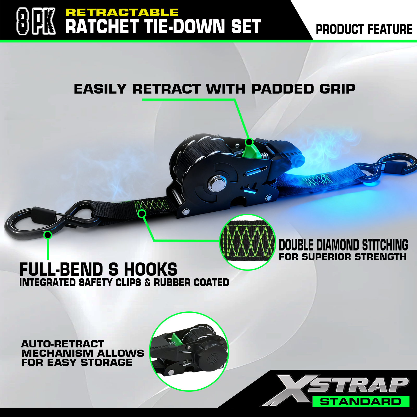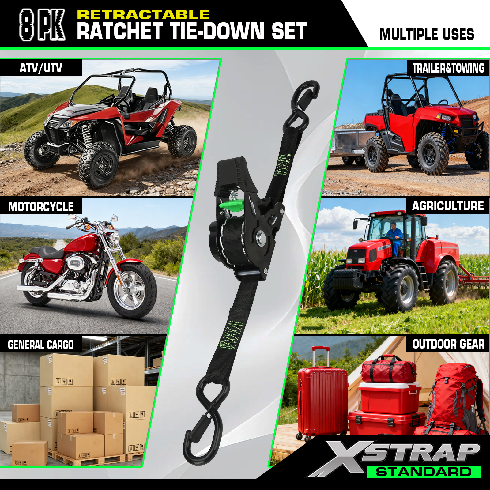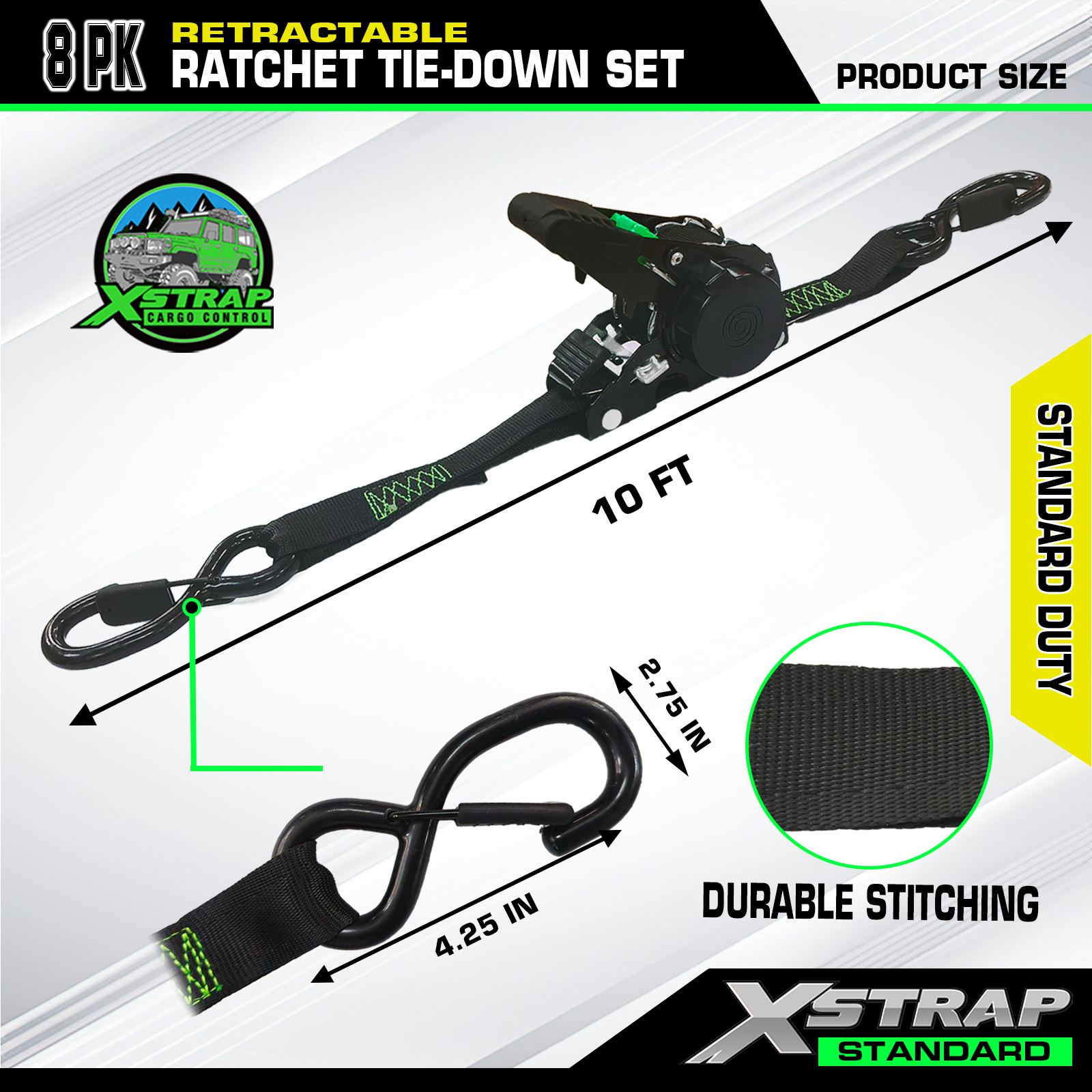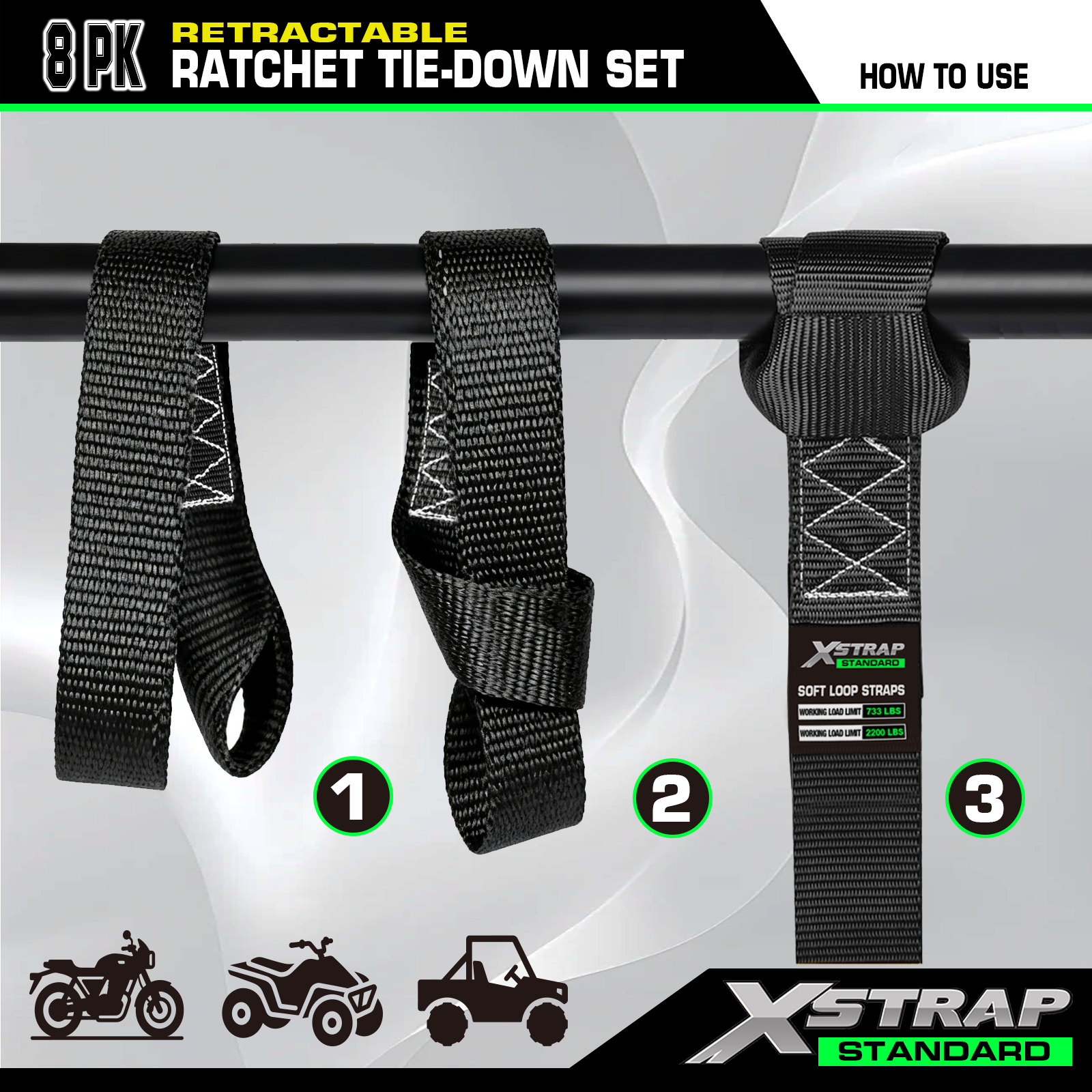 - Uključuje 4 mekane omče za vezivanje-- mekane omče mogu pomoći u stvaranju sidrišnih točaka na krovnim nosačima, krevetima kamiona, upravljačima. Tako možete koristiti naše uvlačive trake s čegrtaljkom u mnogim scenarijima.