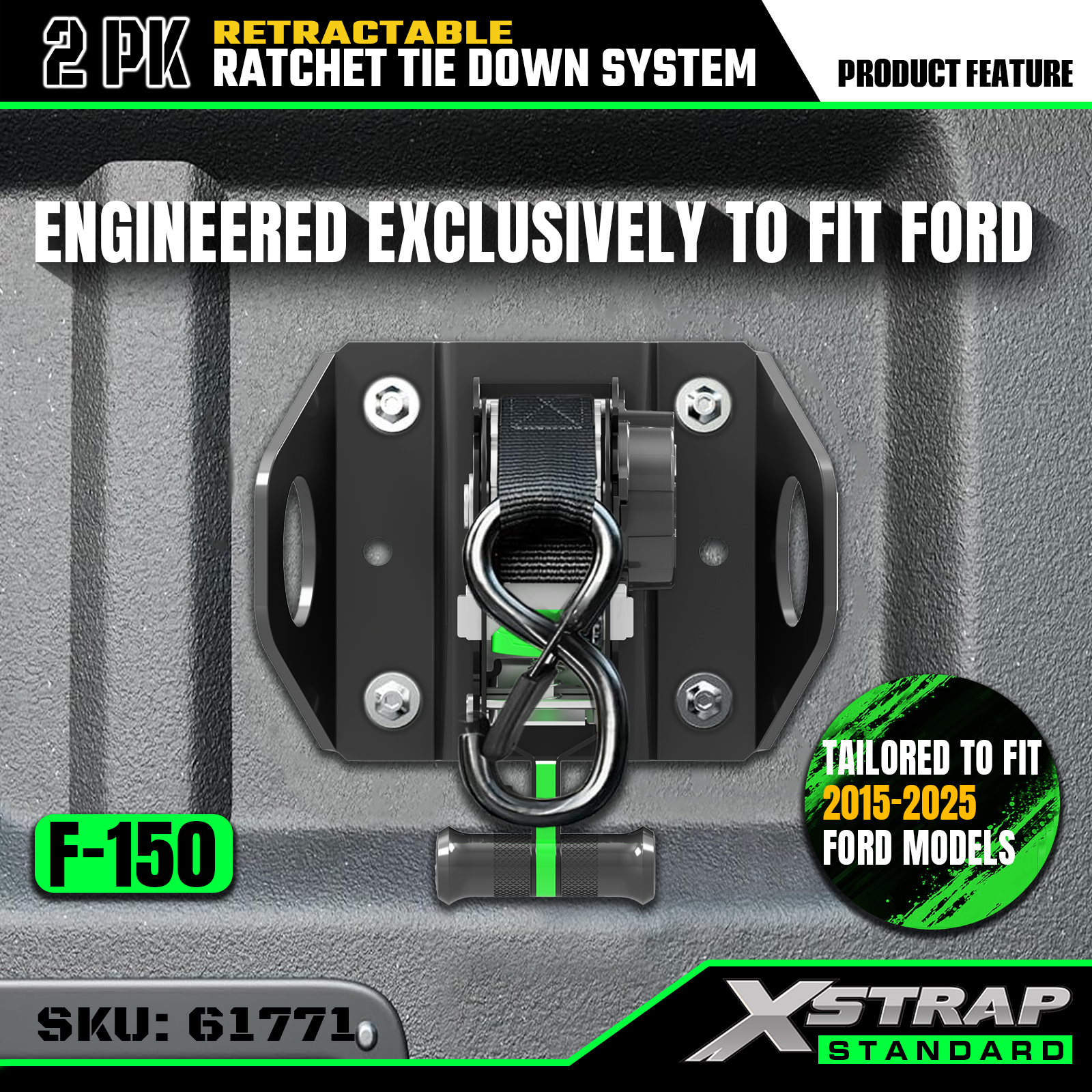 Ovo su Xstrap trake za vezivanje koje se mogu uvući i odgovaraju za Ford F150 2015-2026 sa sigurnosnim S kukama. Sigurno radno opterećenje je 500 lbs, a prekidna čvrstoća je 1500 lbs.