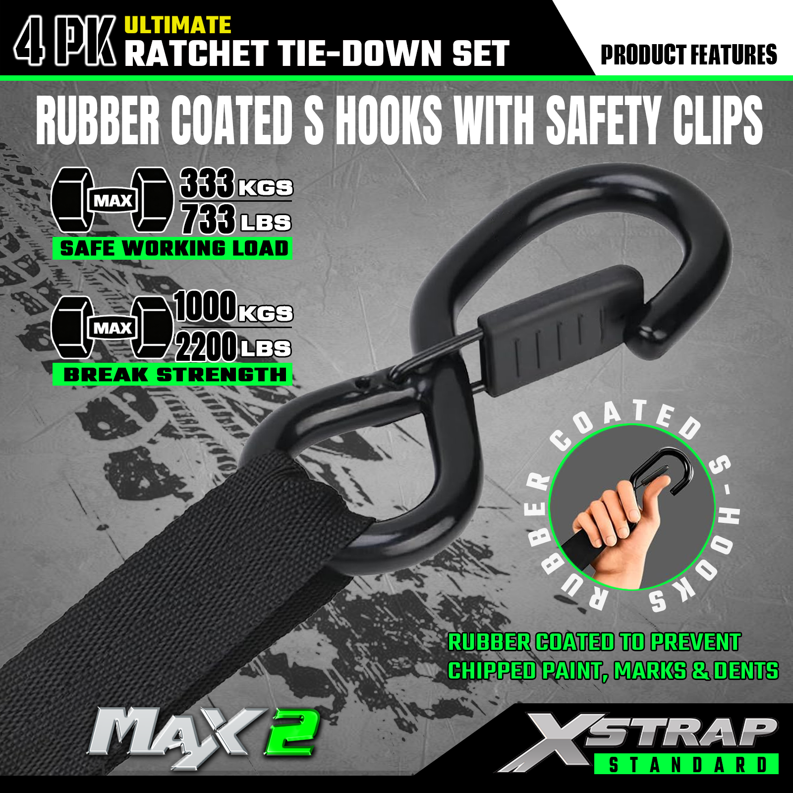 Ovo su naše trake za vezivanje za motocikle od 1 inča od 15 stopa i 4 pk sa sigurnosnim kukama. Snaga na prekid je 2200 lbs. U ovom setu također ima 4 kom mekih petlji.
