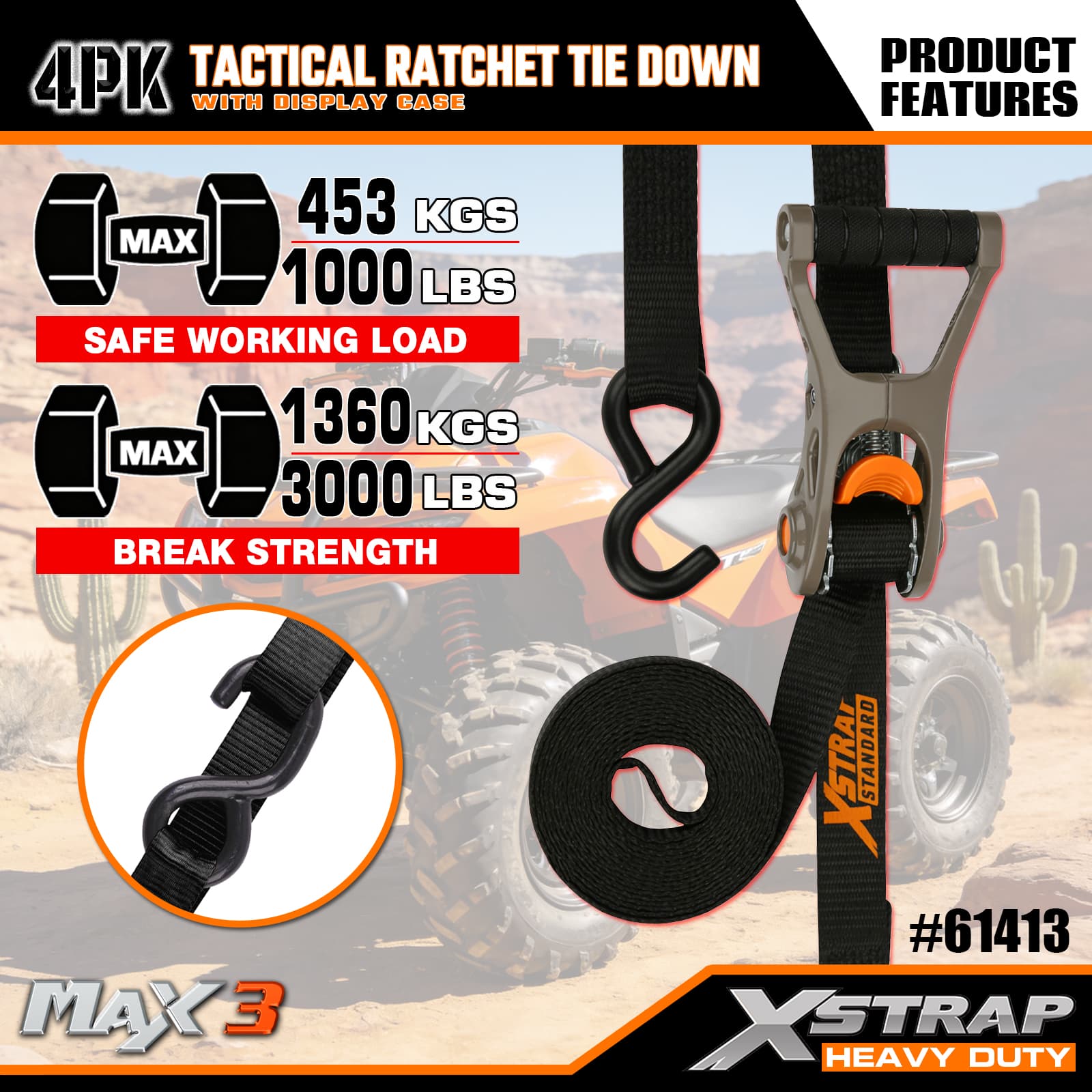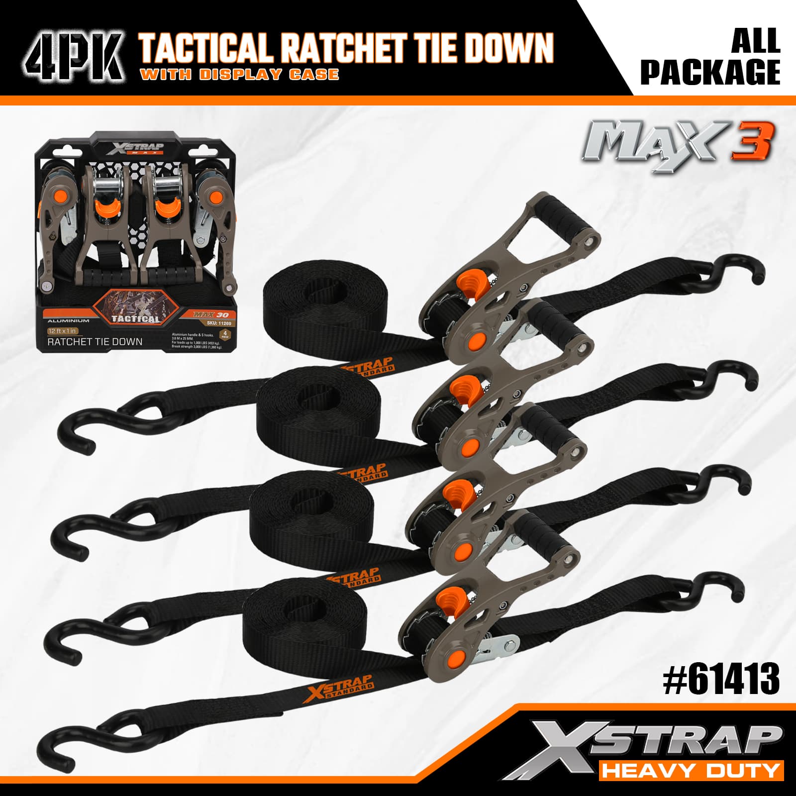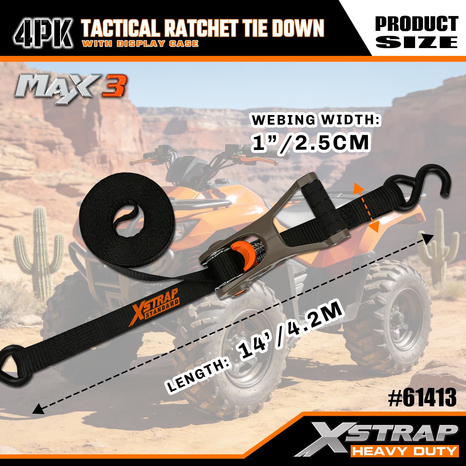 Xstrap 4 paket taktičke čegrtaljke za vezivanje s mekom petljom, 1” x 14’ poliesterska traka za vezivanje, traka s čegrtaljkom za povlačenje, 1000 lbs Kapacitet trake za pričvršćivanje tereta sa S kukama za kamione, SUV, automobile, motocikle.