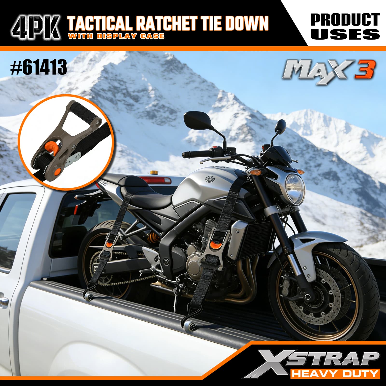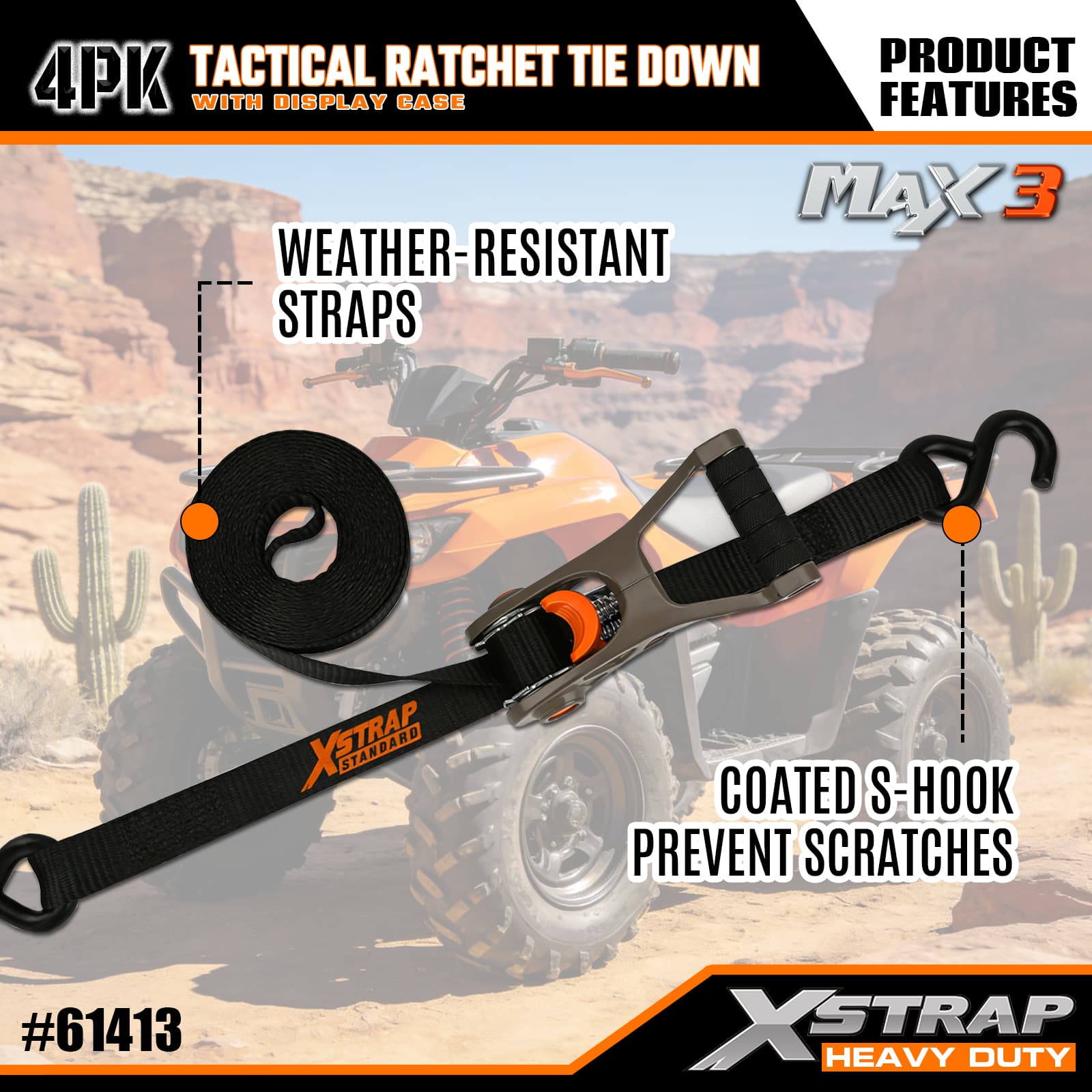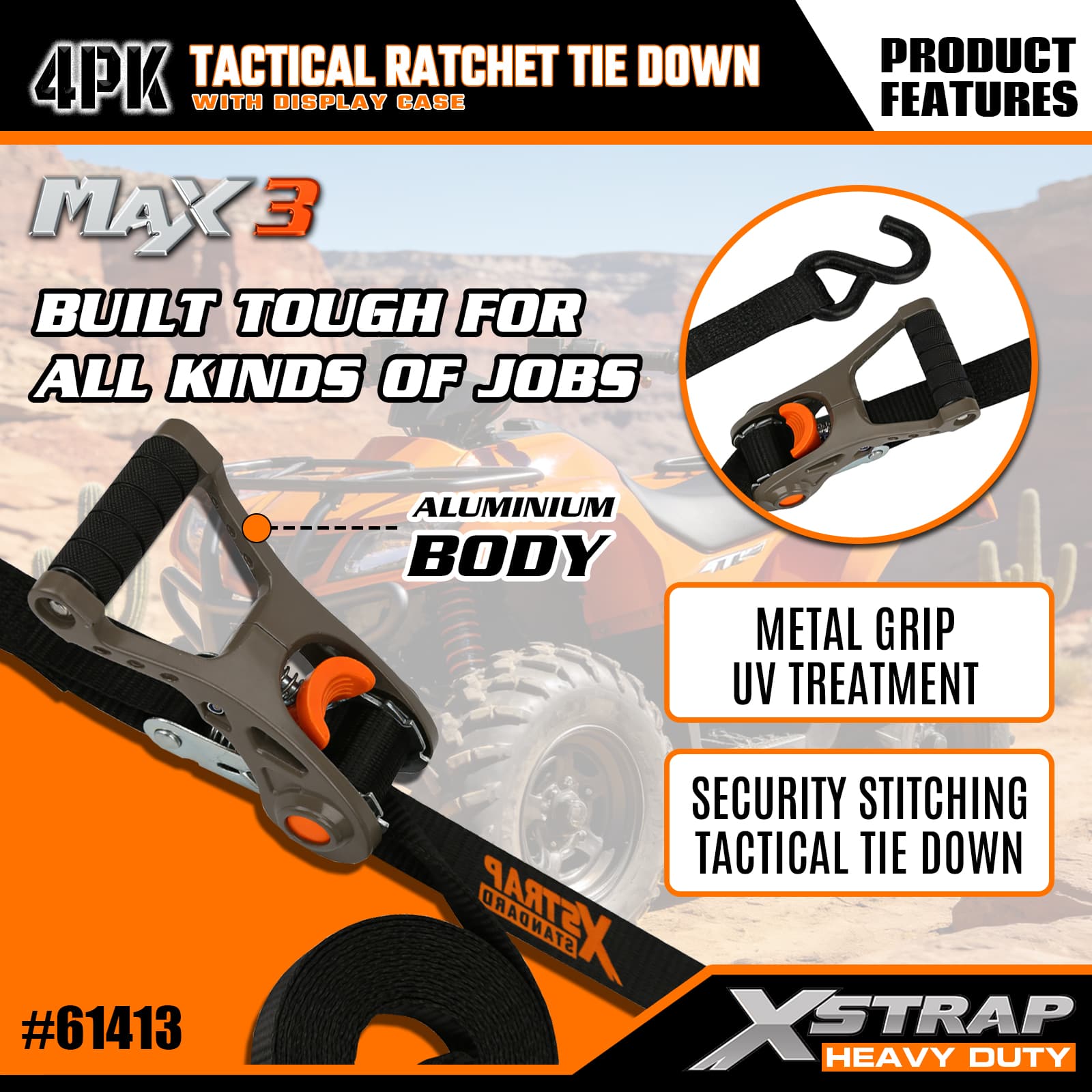 Xstrap 4 paket taktičke čegrtaljke za vezivanje s mekom petljom, 1” x 14’ poliesterska traka za vezivanje, traka s čegrtaljkom za povlačenje, 1000 lbs Kapacitet trake za pričvršćivanje tereta sa S kukama za kamione, SUV, automobile, motocikle.