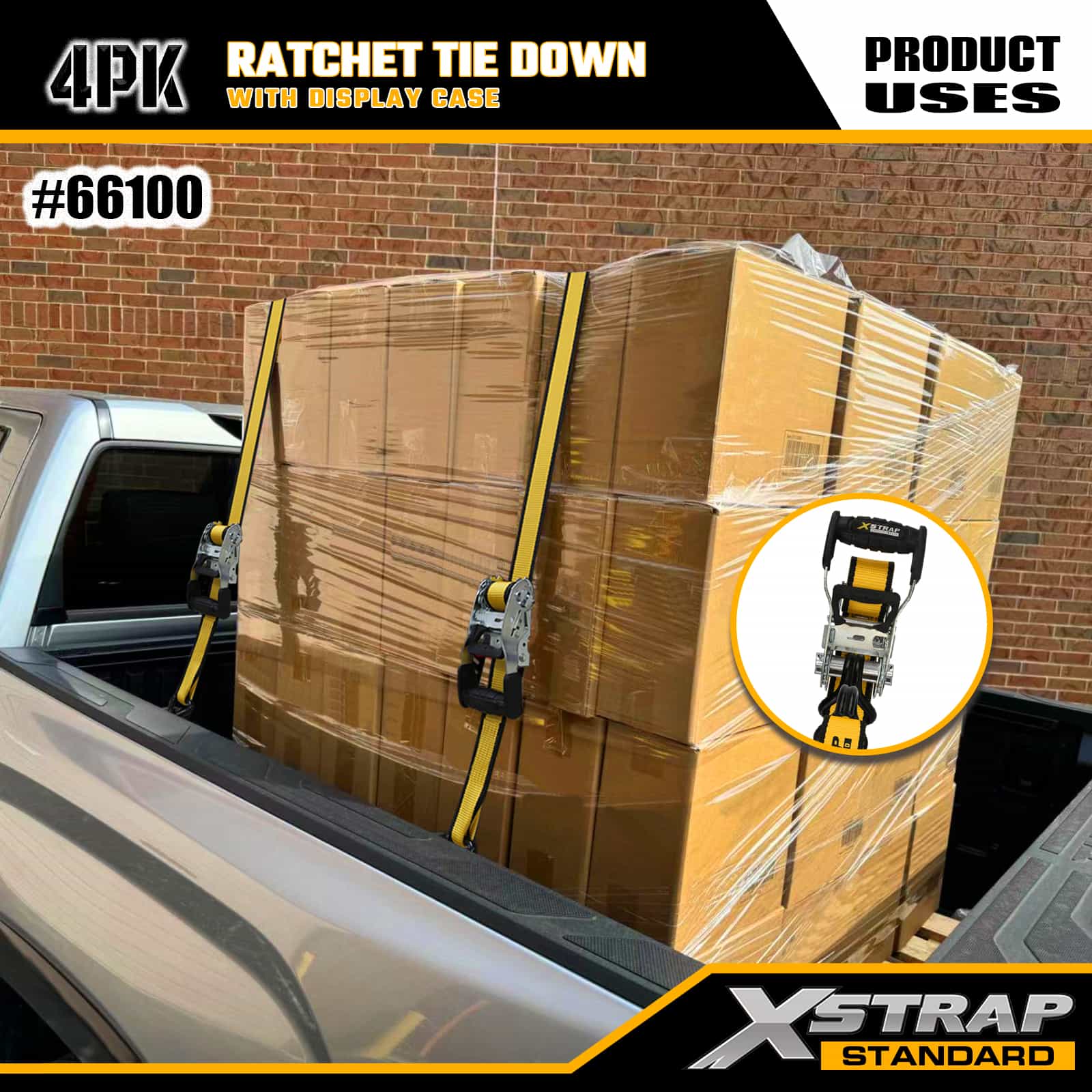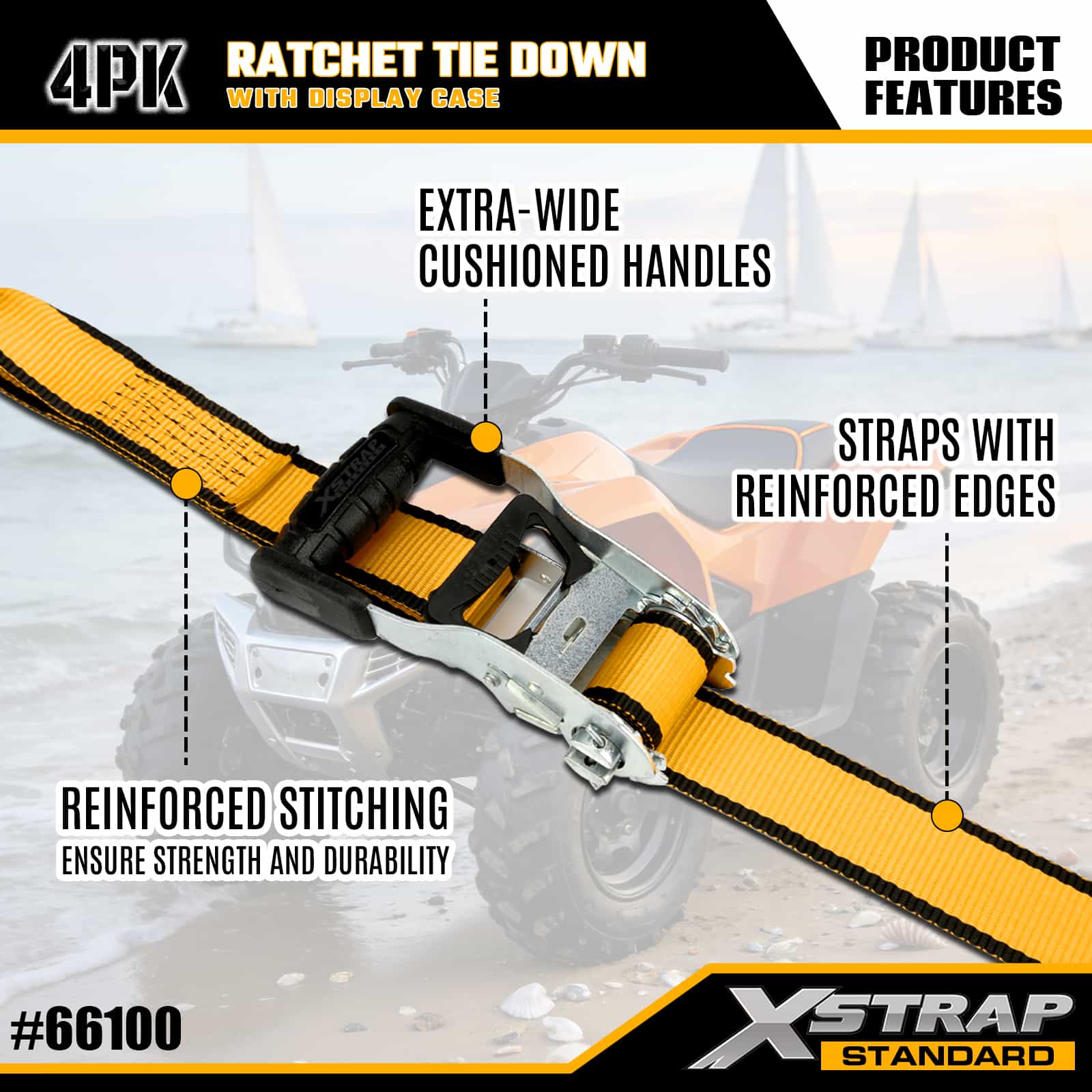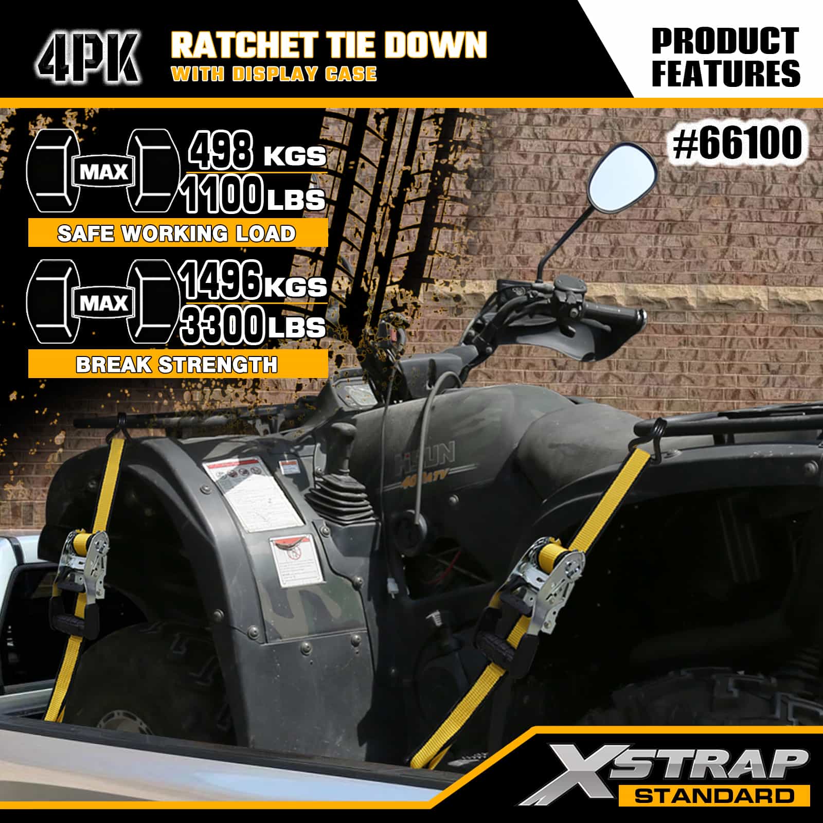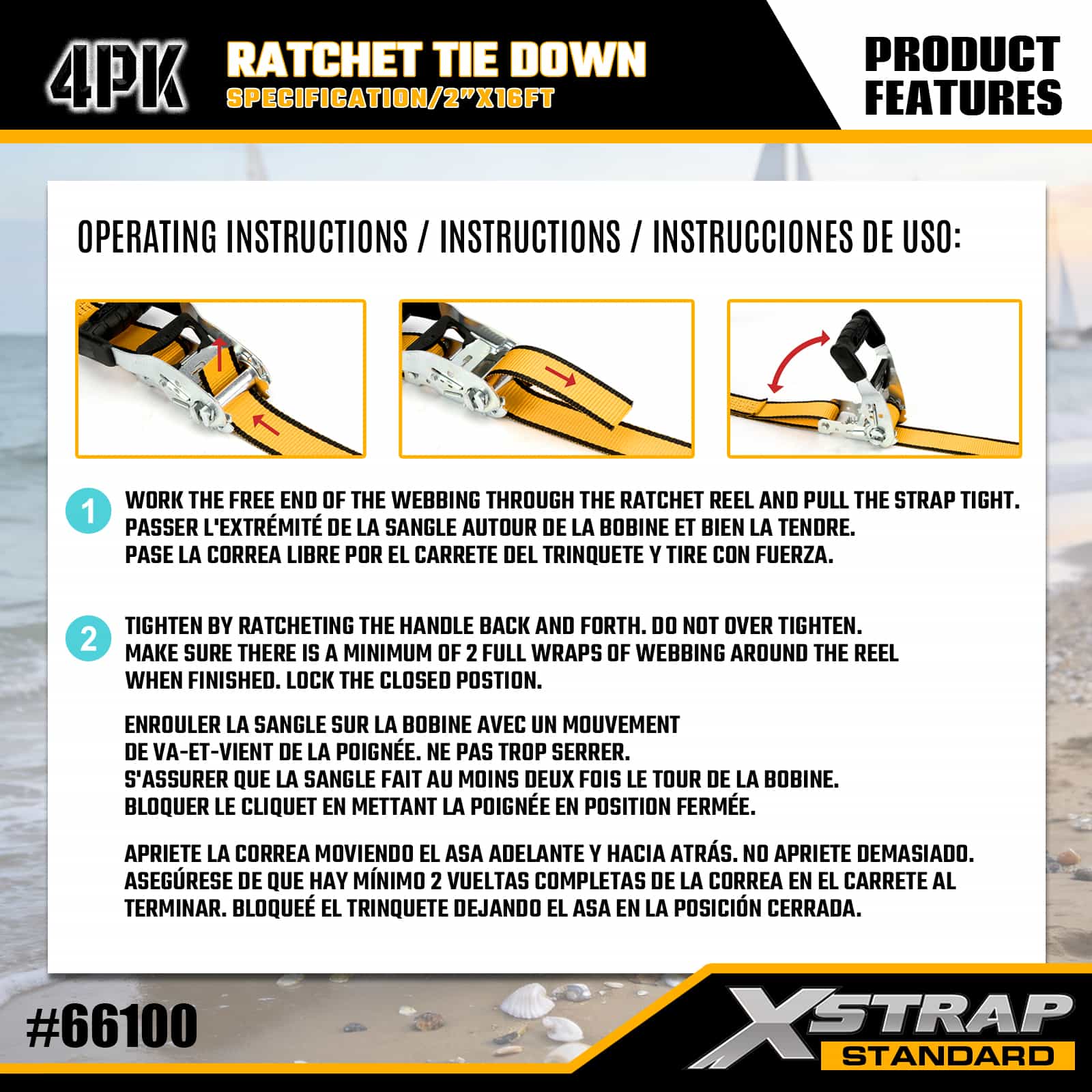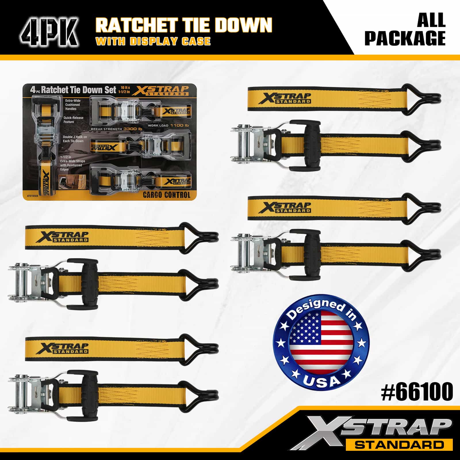 Xstrap 4 pakiranja s čegrtaljkom s dvostrukim J kukama, 1-1/2” x 16’ poliesterski remen za vezivanje, traka s čegrtaljkom za povlačenje, 1100 lbs nosivost trake za pričvršćivanje tereta s dvostrukim J kukama za kamionet, SUV, automobilske gornje nosače, motocikl, laki ribarski čamac, jet ski, motorne sanke, traktor za travu.