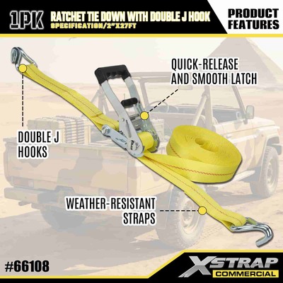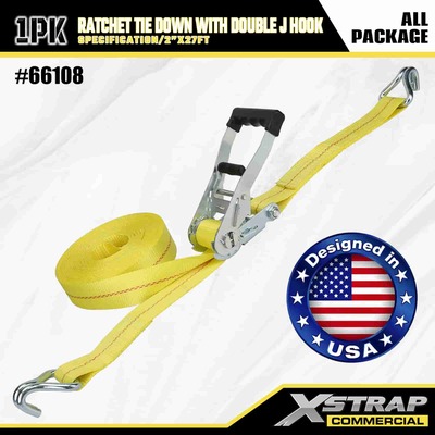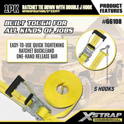 Xtrap Ratchet Teg Down s duplim J kukama, 2” x 27’ poliesterski remen za vezivanje Ratchetch remen za povlačenje, 3333 lbs kapacitet trake za pričvršćivanje tereta s dvostrukim J kukama za kamionet s kontrolom tereta, SUV, automobile, motocikle,.