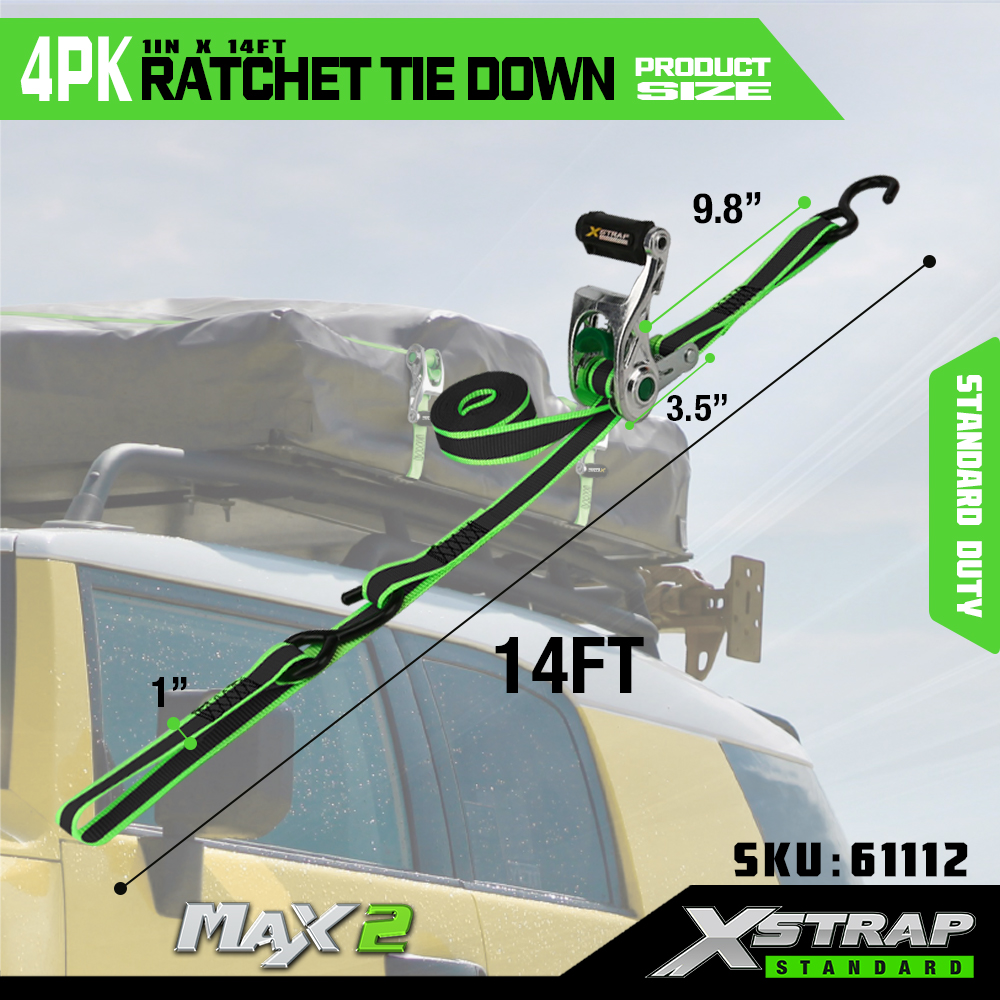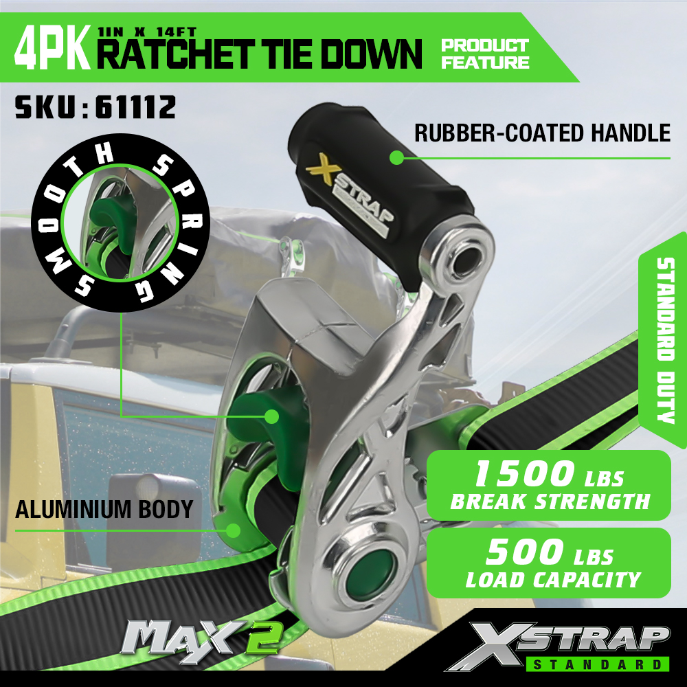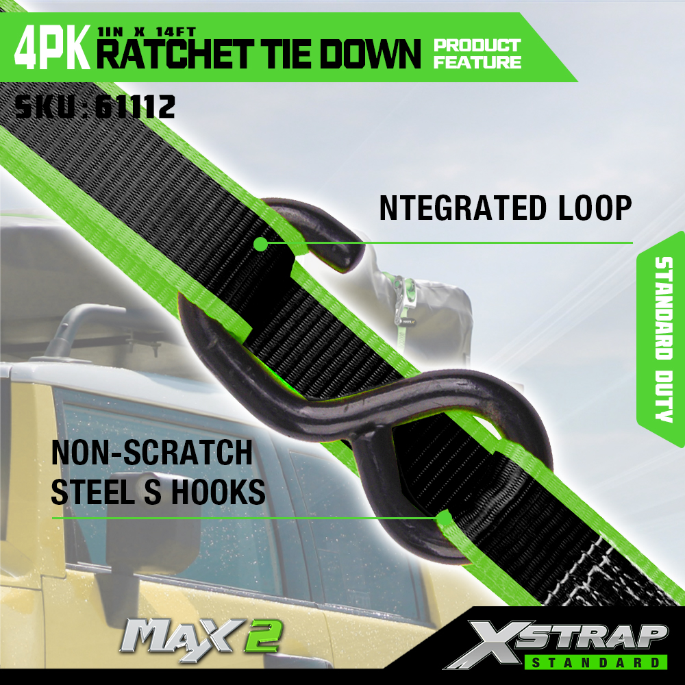 Xstrap 4 paketa pričvrsnih traka s otvorenom ručkom, 1"x 14' poliesterske čegrtaljke s mekom omčom, nosivost 1500 lbs (500 lbs) trake za pričvršćivanje tereta s aluminijskim čegrtaljkama i S kukama za teret, kamione, kosilice, terenska vozila