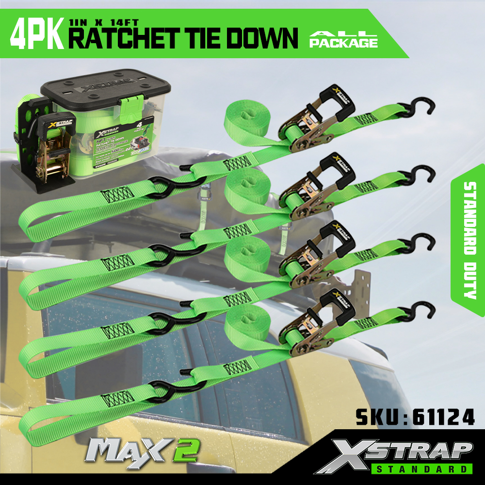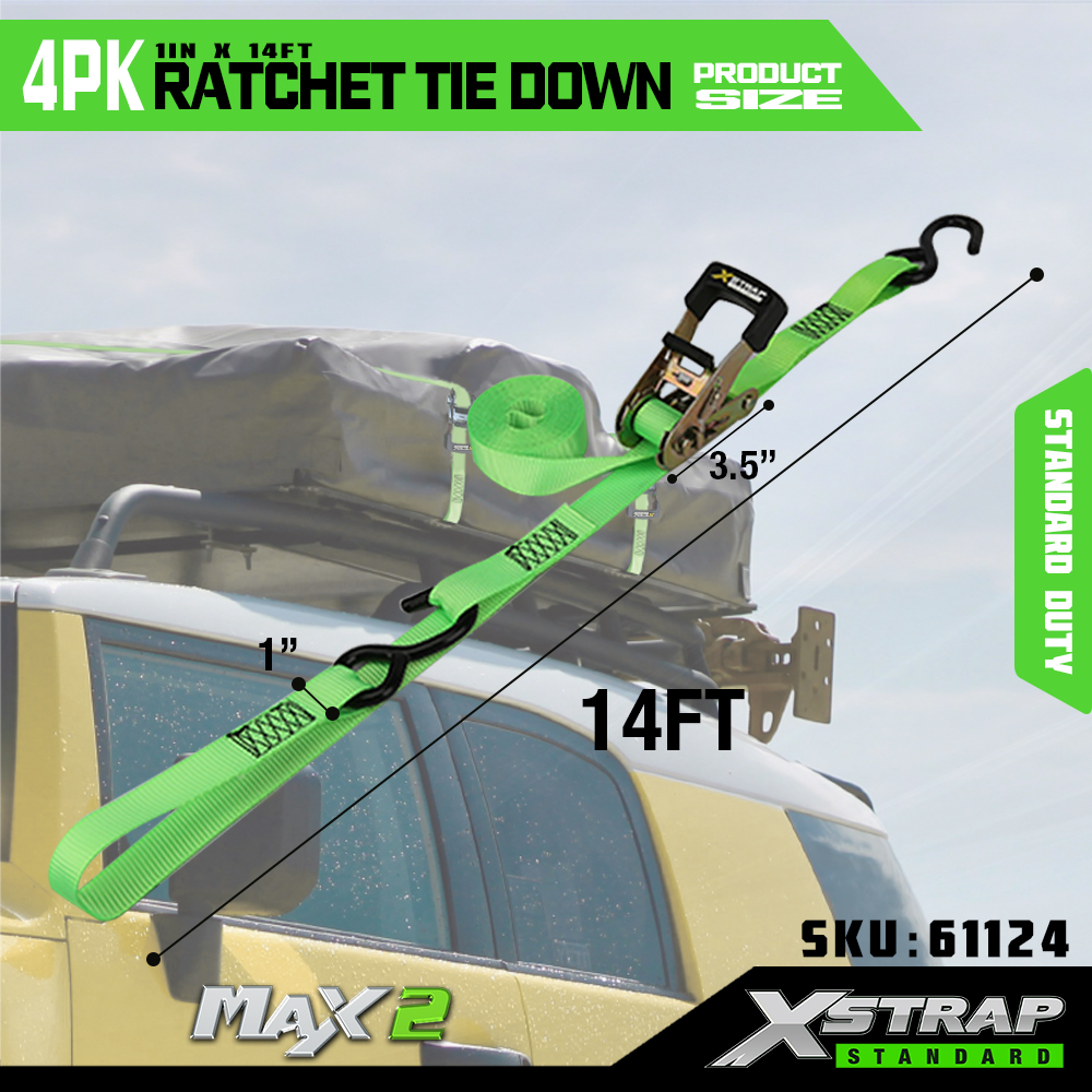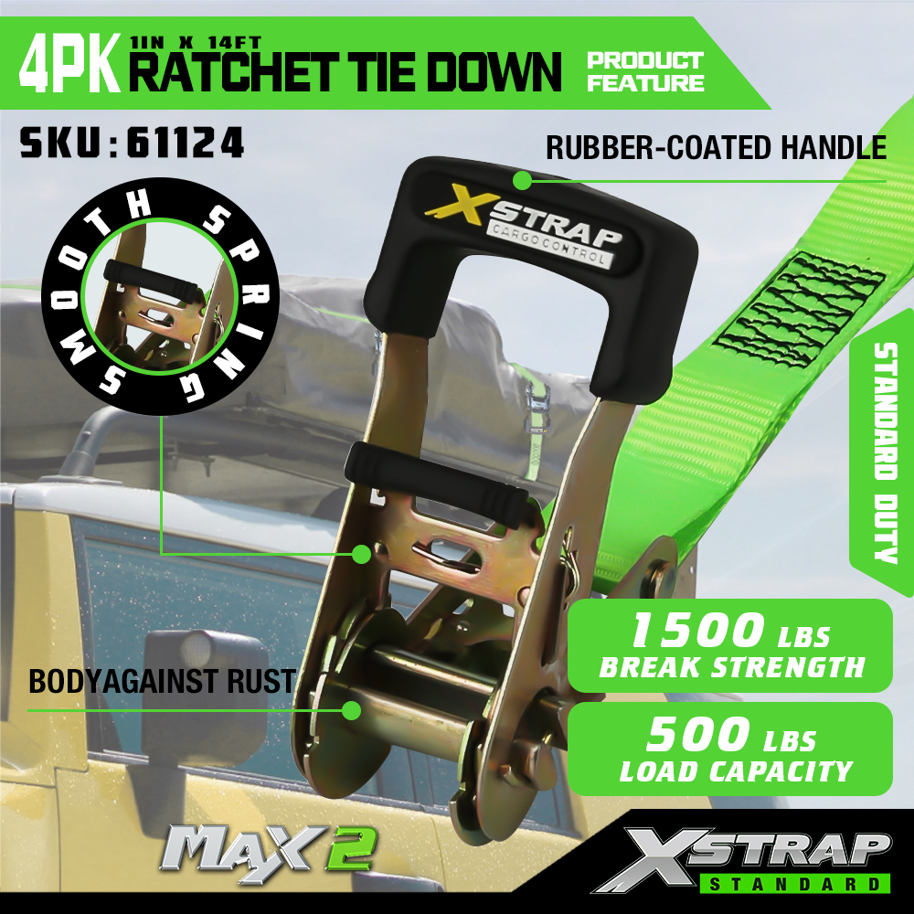 Xstrap 4 pakiranja traka za vezivanje s čegrtaljkama, 1"x 14' poliesterska traka za vezivanje s čegrtaljkama s mekom omčom, 1500 lbs (500 lbs) nosivosti Trake za pričvršćivanje tereta s metalnom čegrtaljkom i S kukama za teret, kamione, kosilice, terenska vozila.