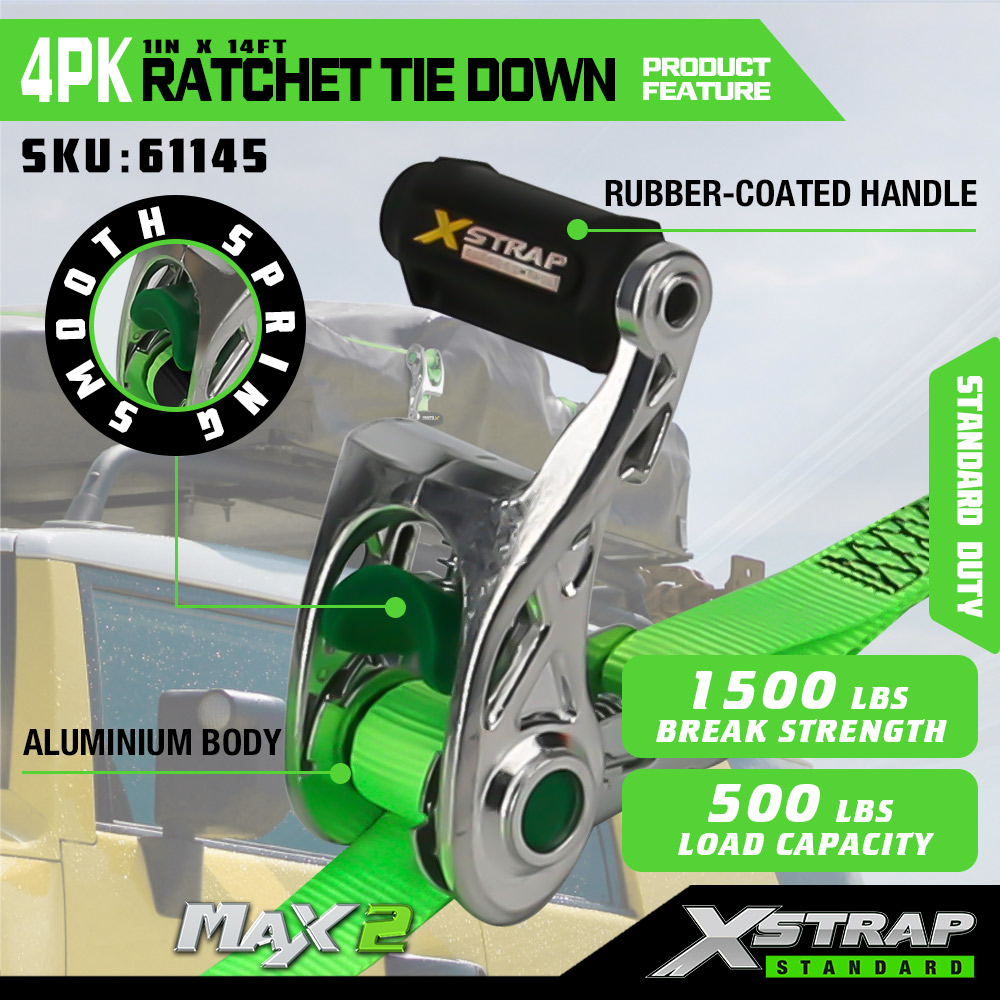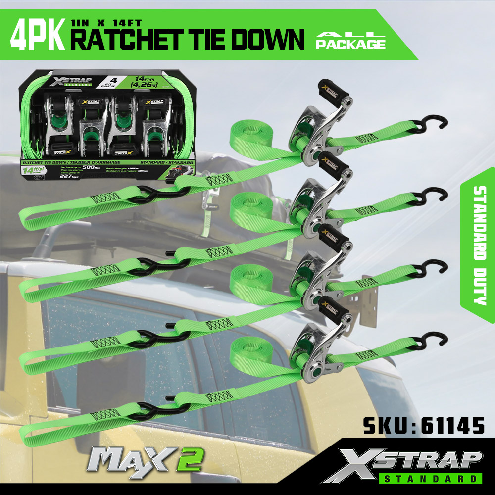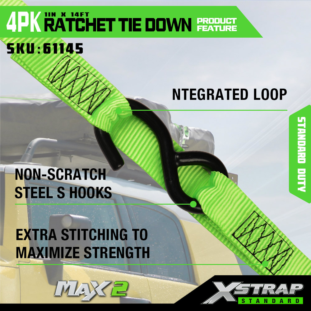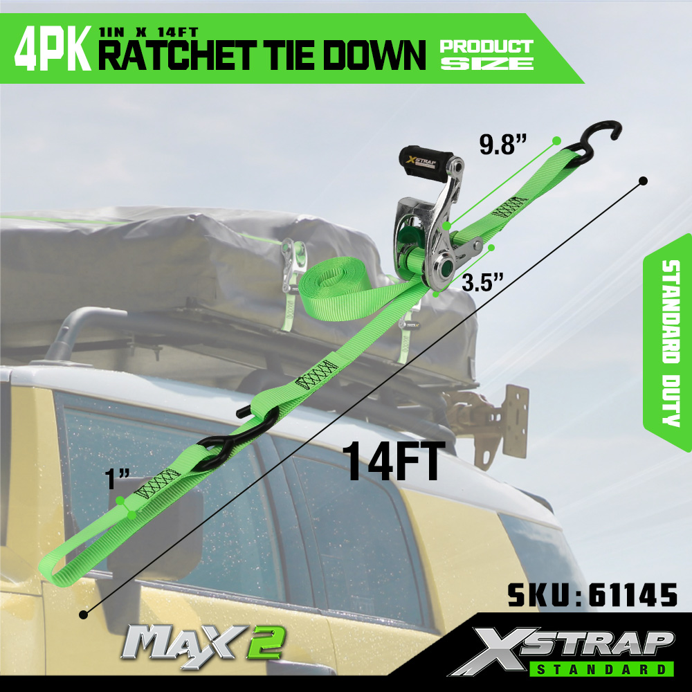 Xstrap 4 pakiranja s mekom omčom, 1” x 14’ poliesterski remen za pričvršćivanje, remen s čegrtaljkom za povlačenje, kapacitet 1000 lbs trake za pričvršćivanje tereta sa S kukama za kamione, SUV, automobile, motocikle.
