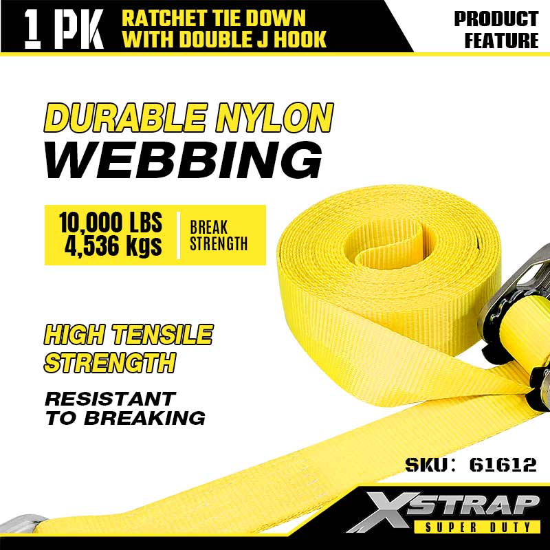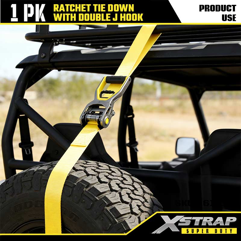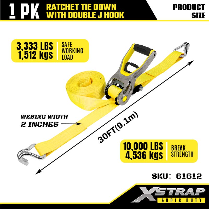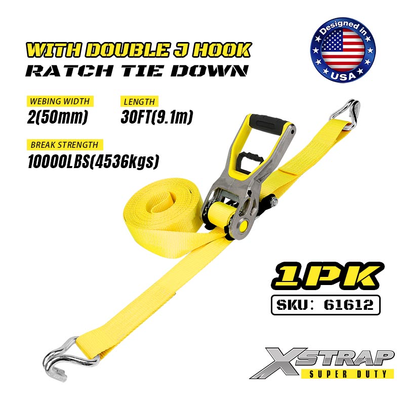 Xstrap 2PK Ratcet za pričvršćivanje s dvostrukim J kukama, 2” x 30’ poliesterski remen za vezivanje, remen za pričvršćivanje tereta nosivosti 3333 lbs s dvostrukim J kukama za prikolicu za teške uvjete, prikolicu s ravnim krevetom, skijaški čamac, mali automobil, tešku opremu.