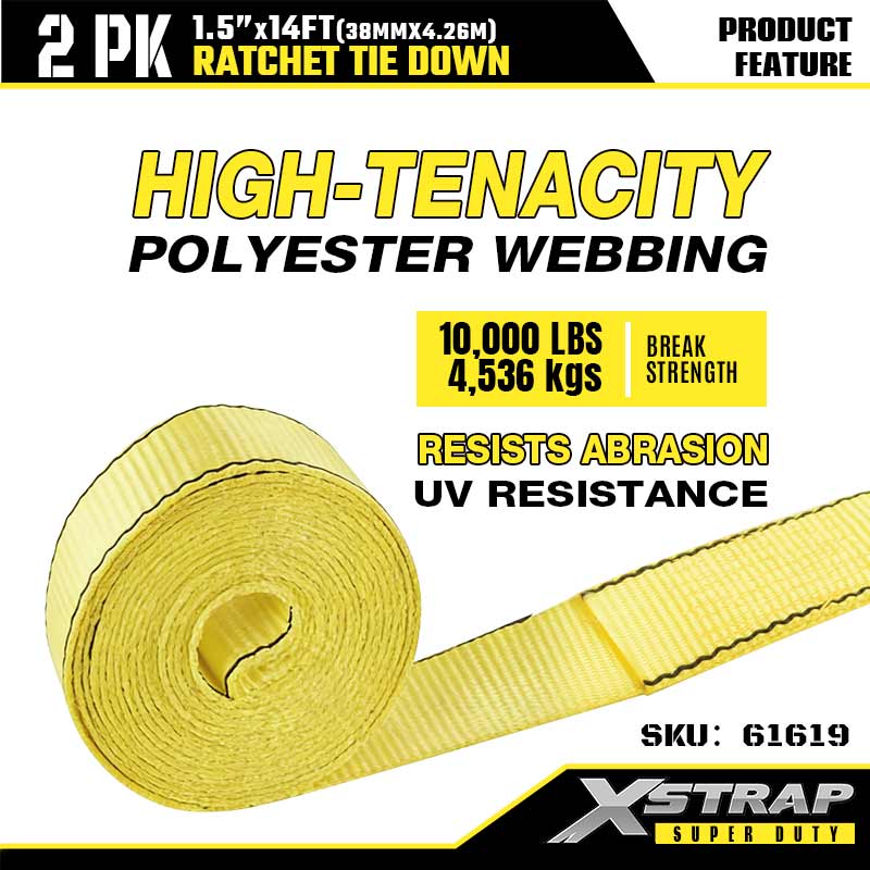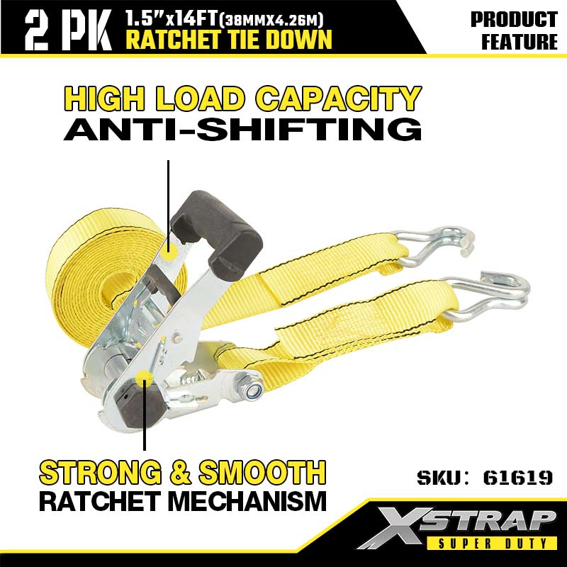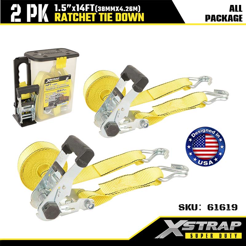 Xstrap 2PK Ratcet za pričvršćivanje s dvostrukim J kukama, 1-1/2” x 14’ poliesterski remen za vezivanje, remen za pričvršćivanje tereta nosivosti 1667 lbs s dvostrukim J kukama za prikolicu za teške uvjete, prikolicu s ravnim krevetom, skijaški čamac, mali automobil, tešku opremu.