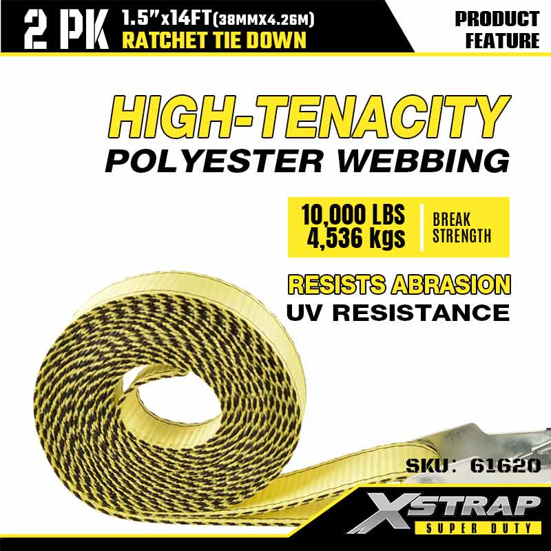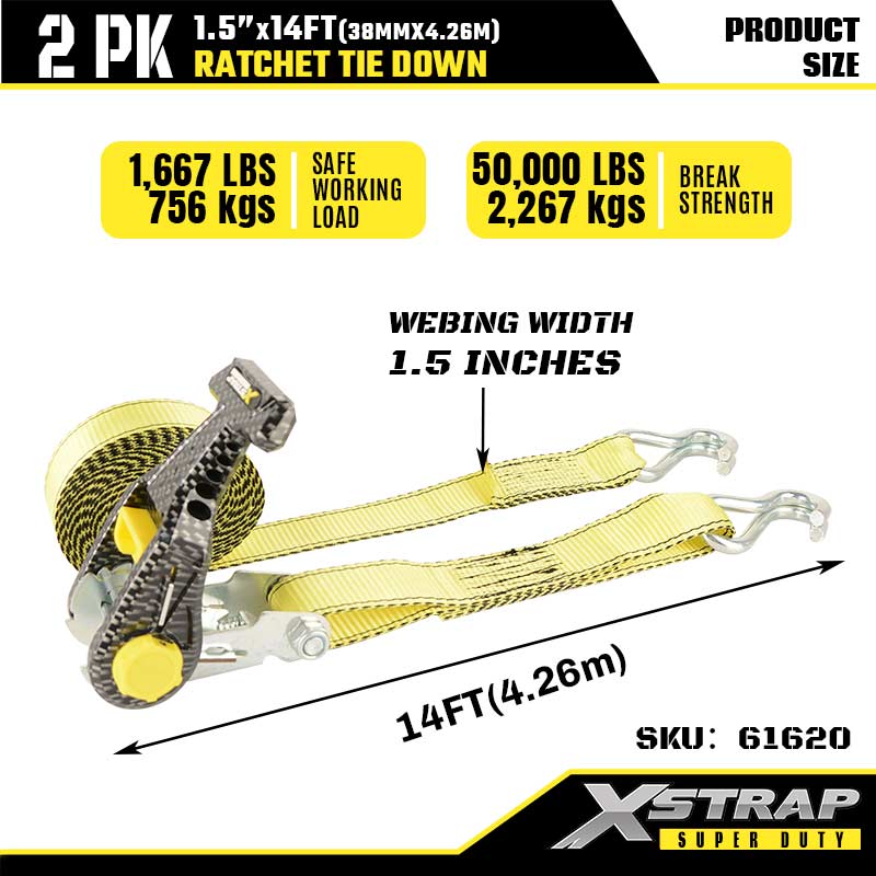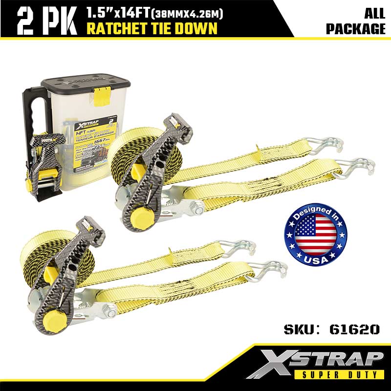 Xstrap 2PK Ratcet za pričvršćivanje s dvostrukim J kukama, 1-1/2” x 14’ poliesterski remen za vezivanje, remen za pričvršćivanje tereta nosivosti 1667 lbs s dvostrukim J kukama za prikolicu za teške uvjete, prikolicu s ravnim krevetom, skijaški čamac, mali automobil, tešku opremu.